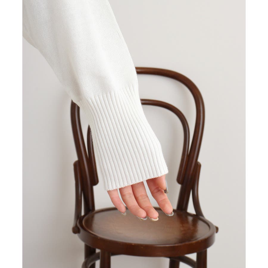 袖と襟元に施されたリブ編みがモダンな雰囲気を演出し、洗練されたスタイルを完成させます。