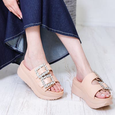 定番のダブルベルトサンダルに大粒のビジューをあしらった華やかサンダル。