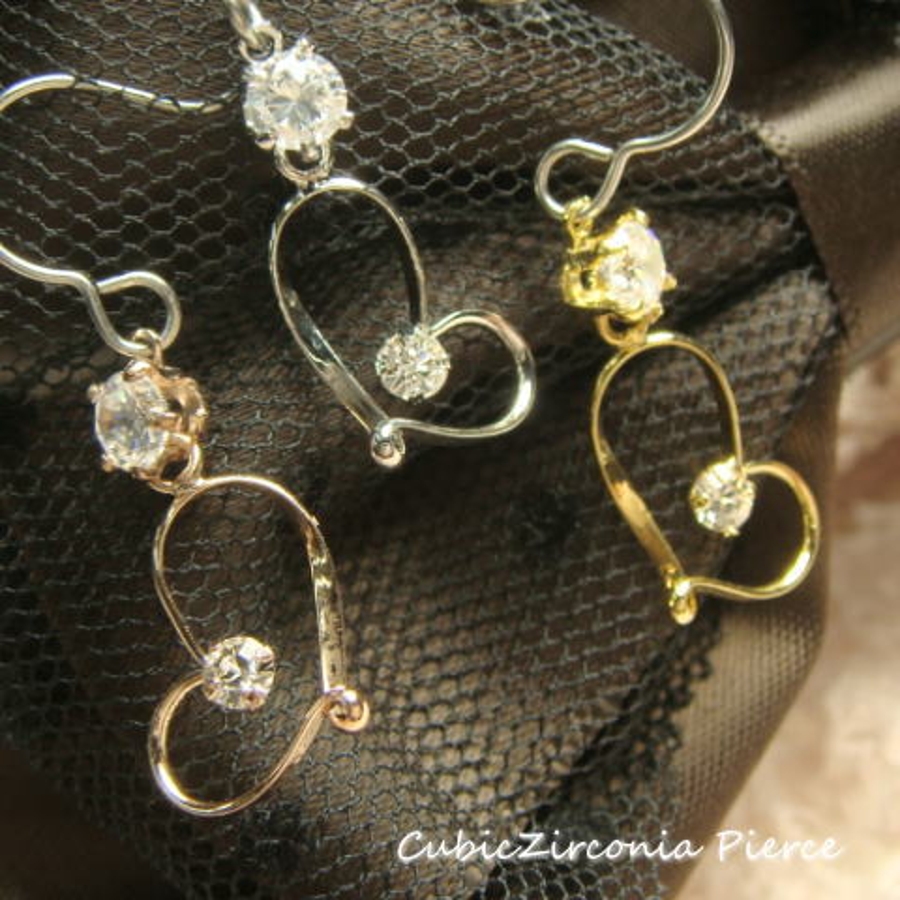 2つのキュービックジルコニア付き♪くるんと縦長なハートのサガリ揺れピアス