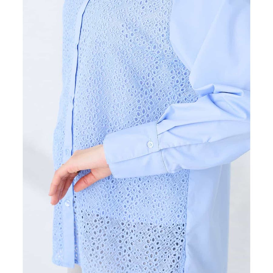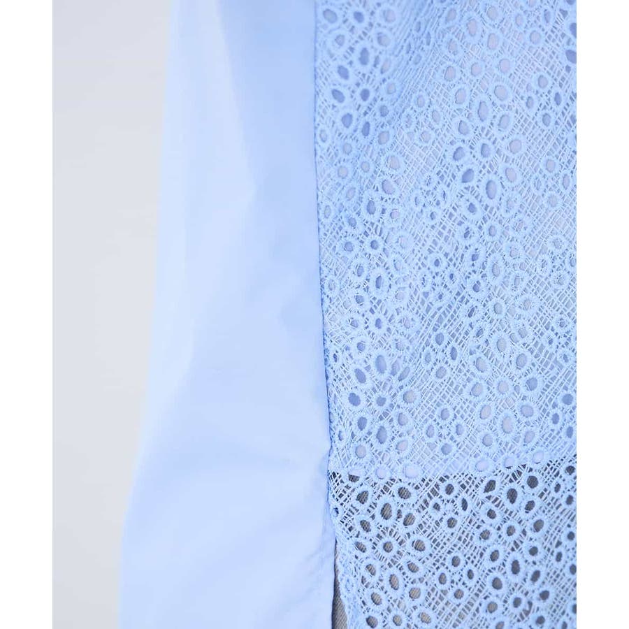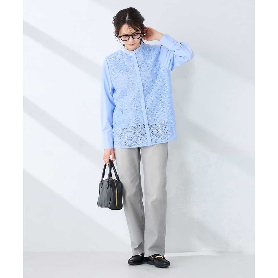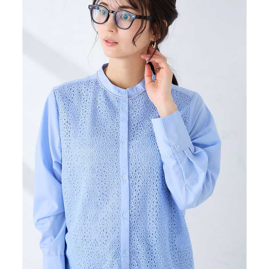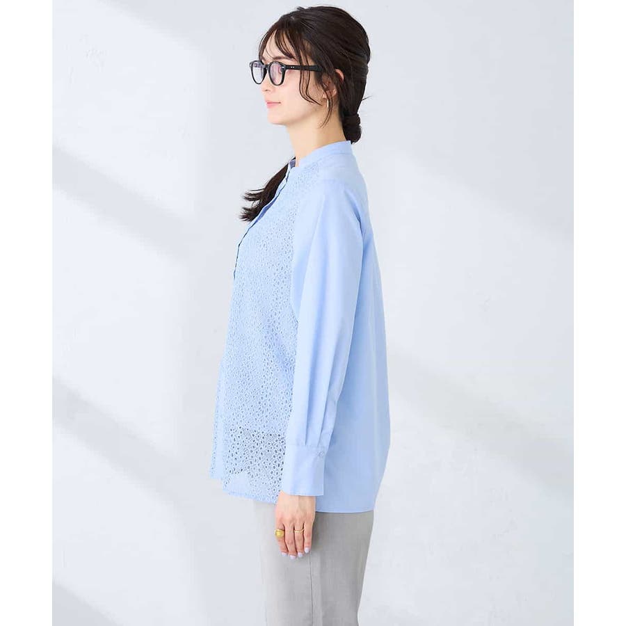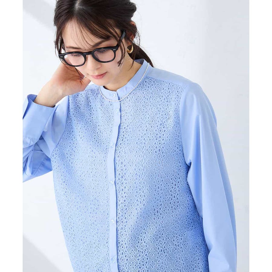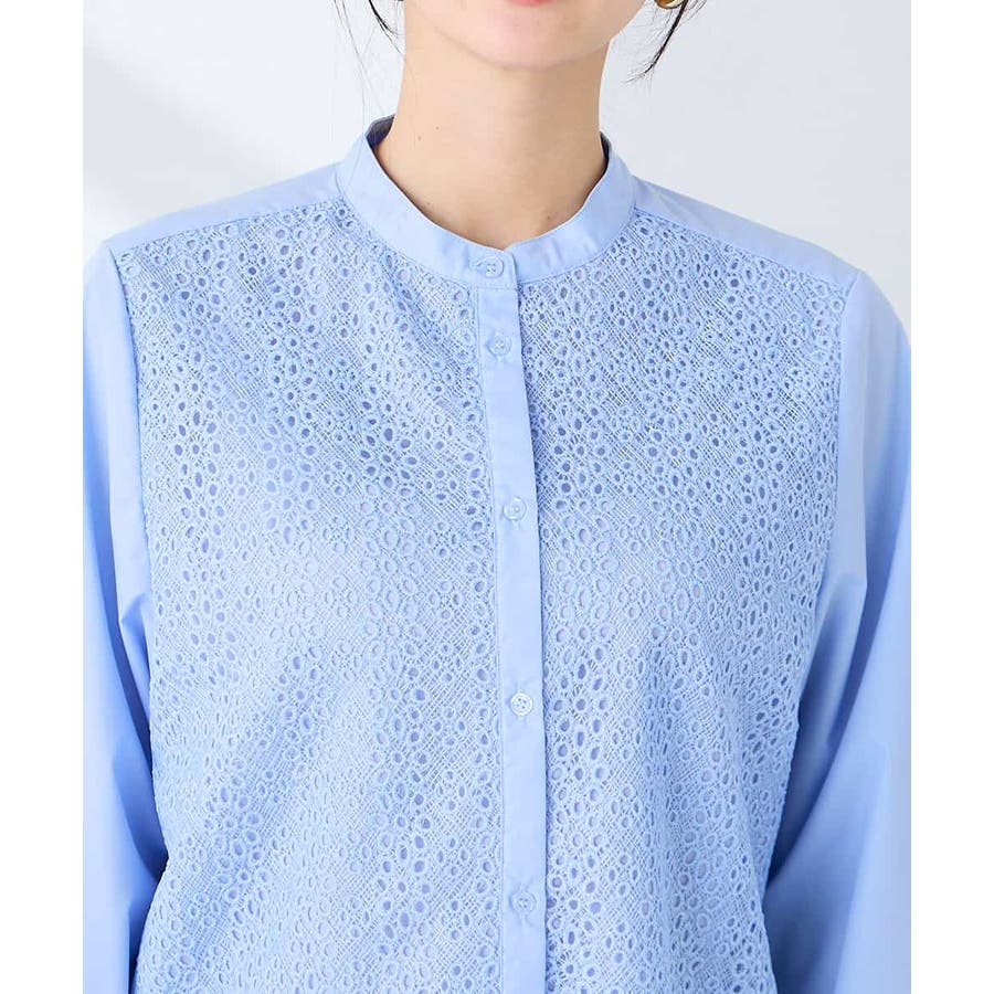 ・レースと無地素材を組み合わせたバンドカラーブラウス
