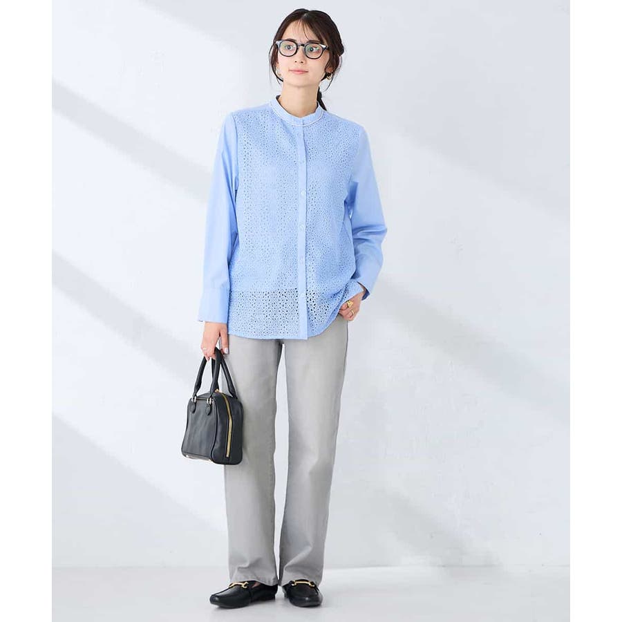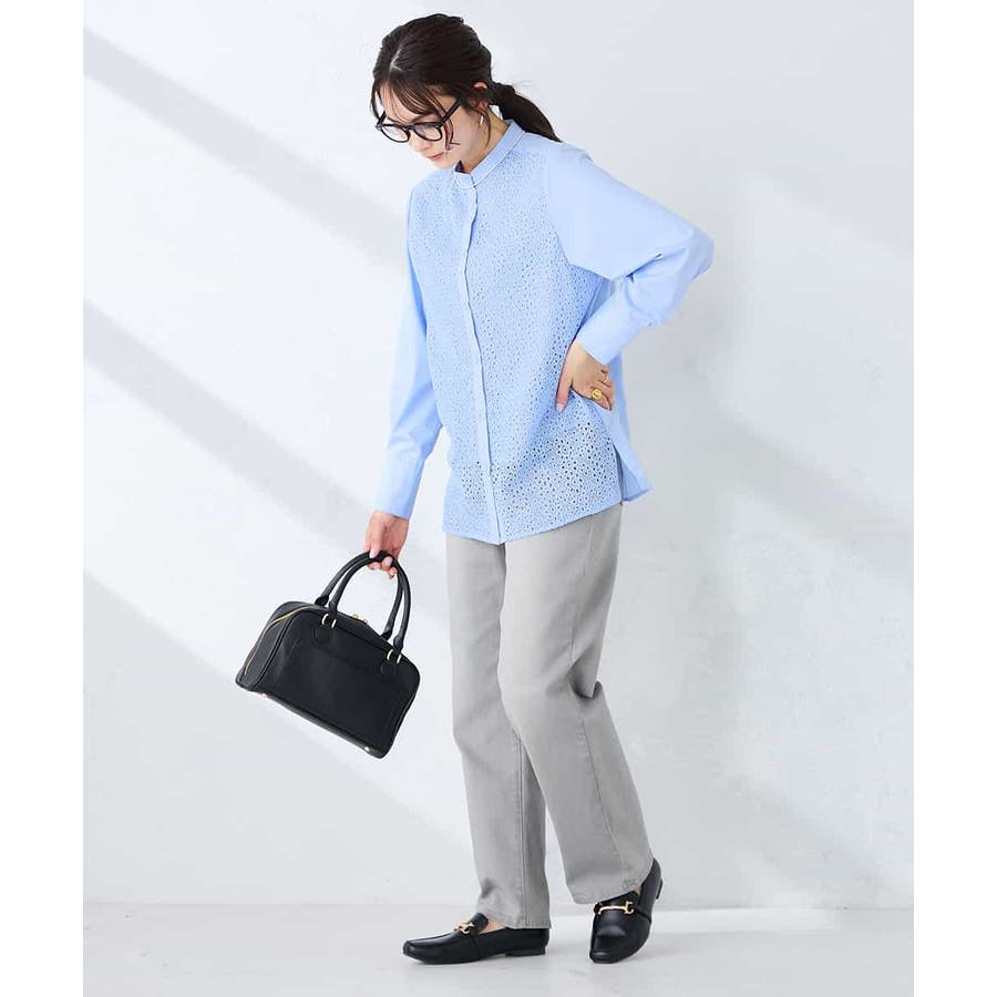 一枚で着映えるライトブルーのブラウスはベーシックなデニムスタイルでもサマになる一枚。
