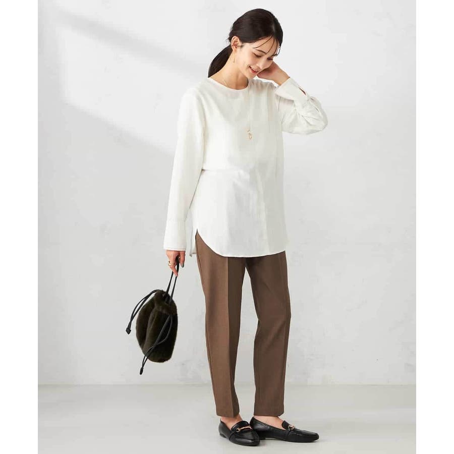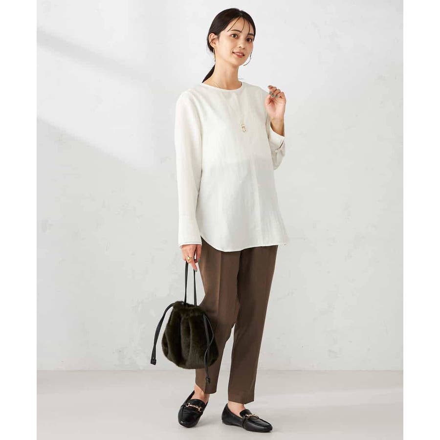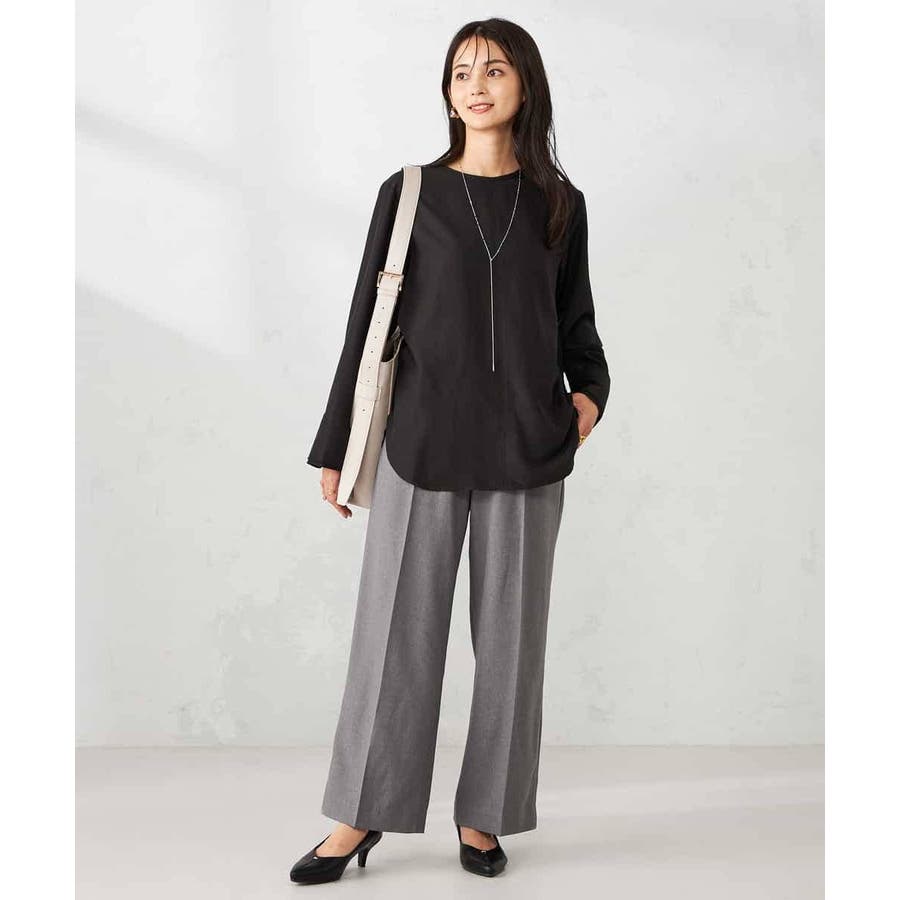 シンプルなノーカラーブラウスは秋は一枚でさらっと、