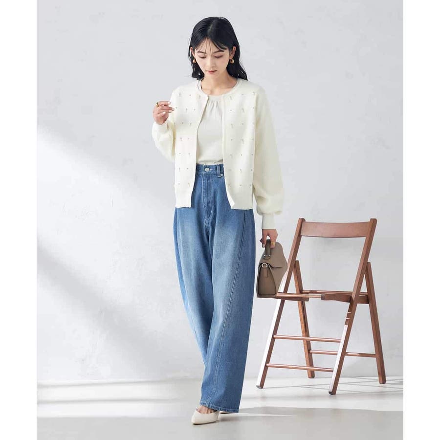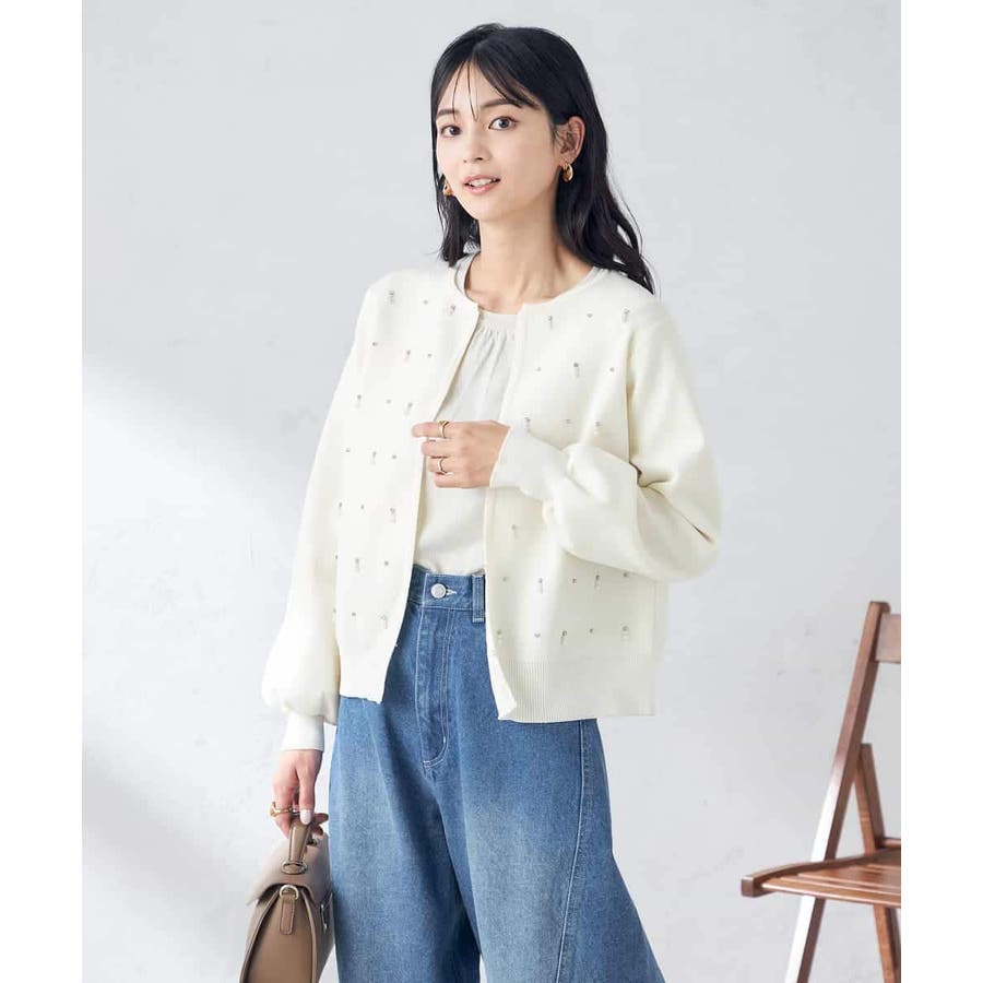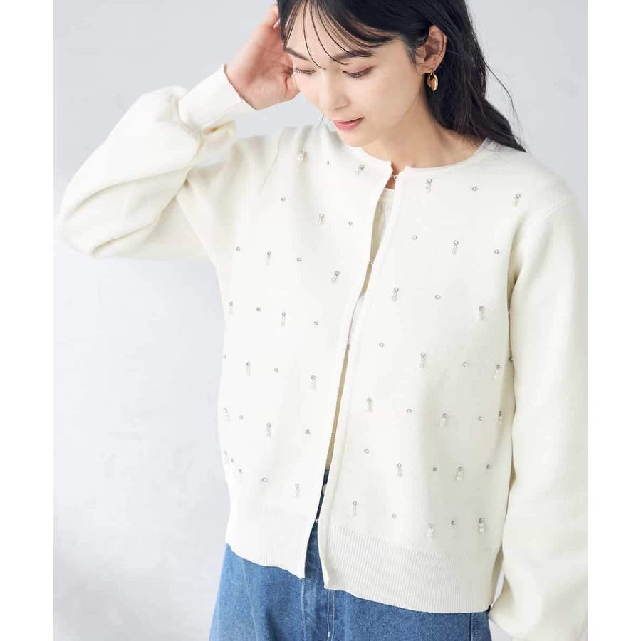 ・今年トレンドのパールとビジューを施したクルーネックカーディガン