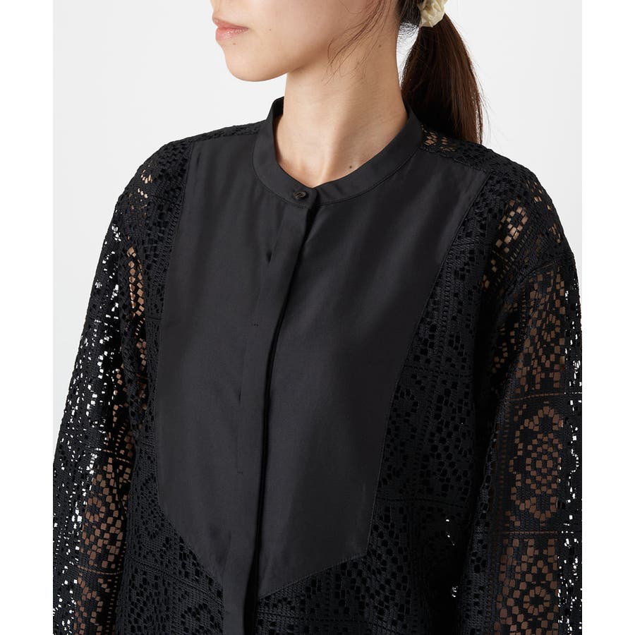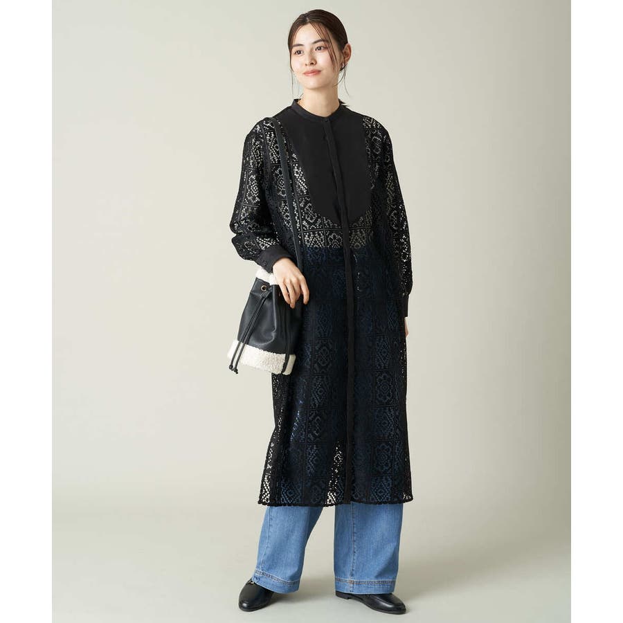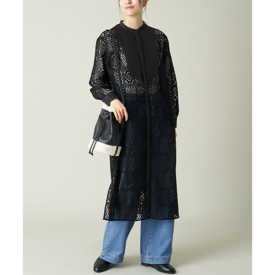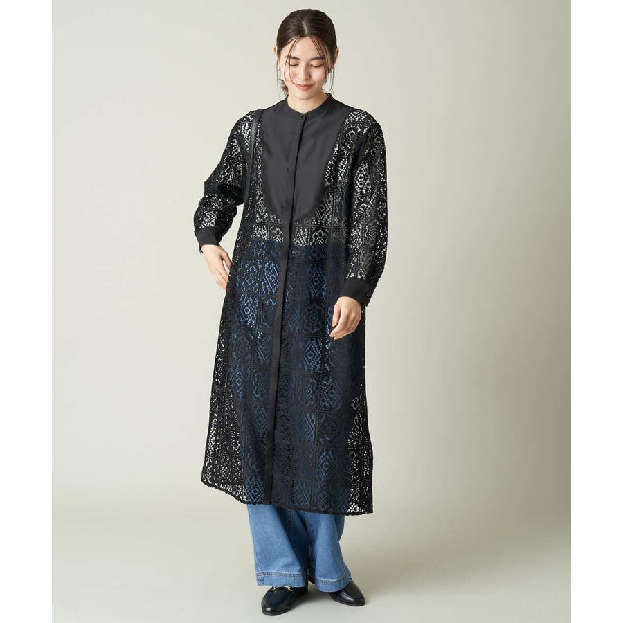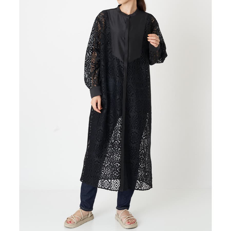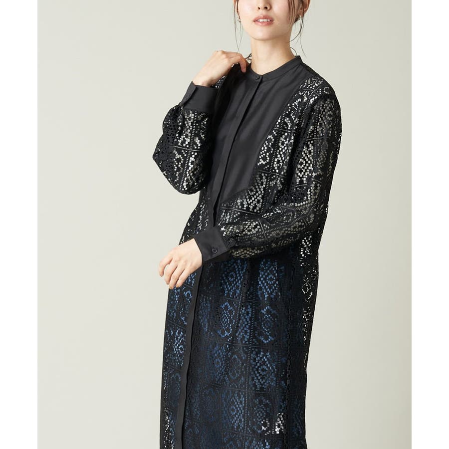 ・バンドカラーと胸元の切替デザインで甘くなりすぎない大人のレースワンピース