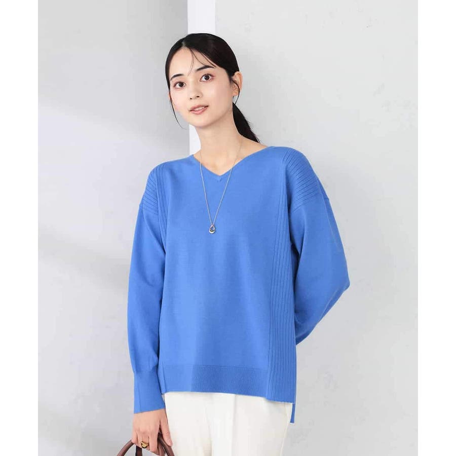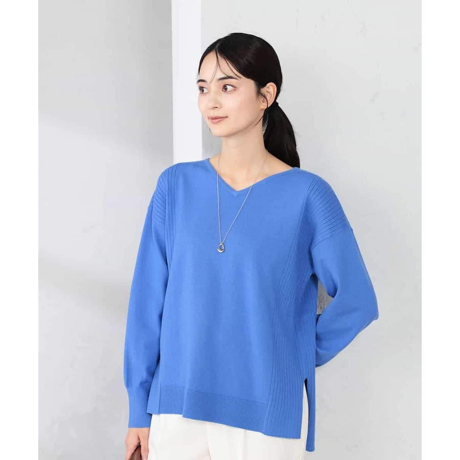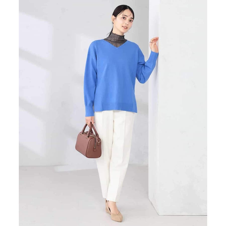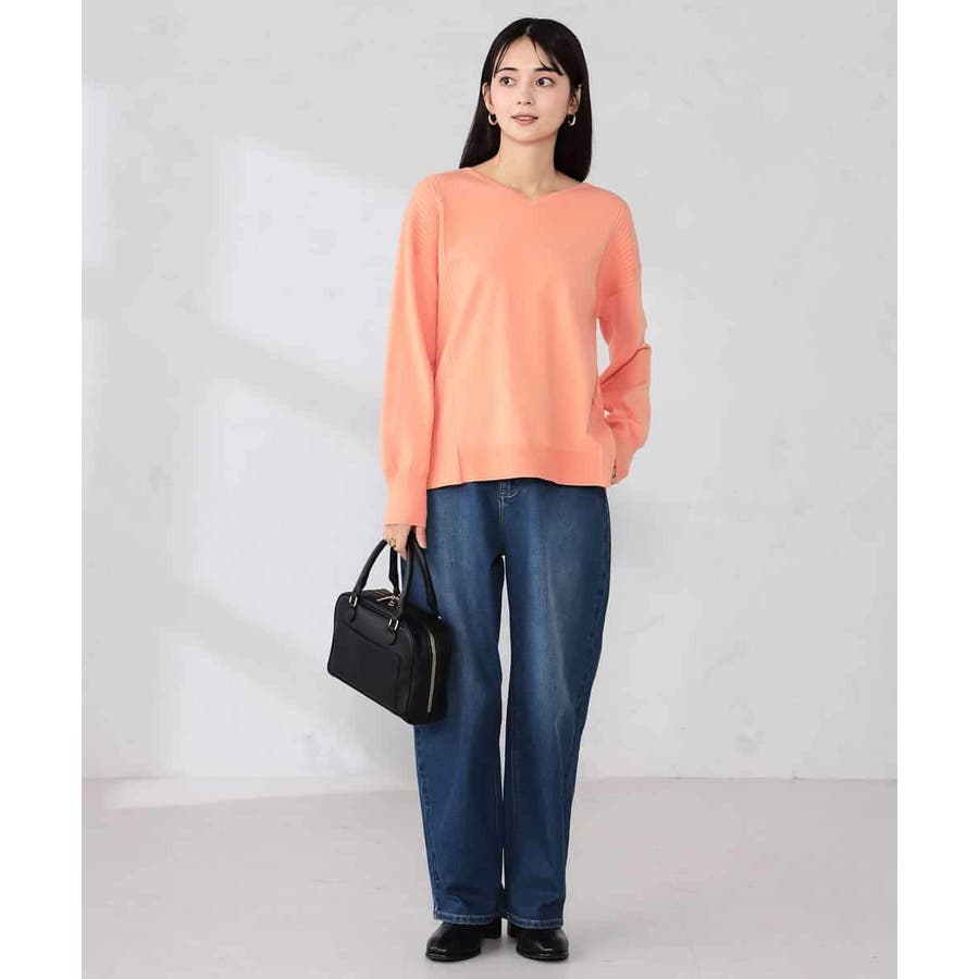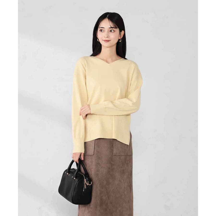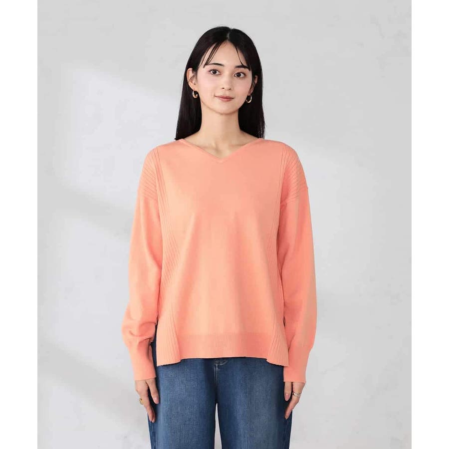 ・浅めのVネックで顔まわりがすっきり、インナー重ねもしやすい設計