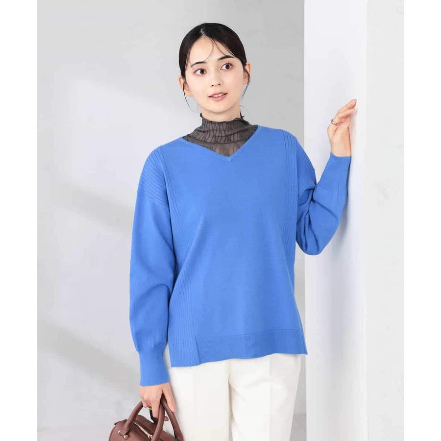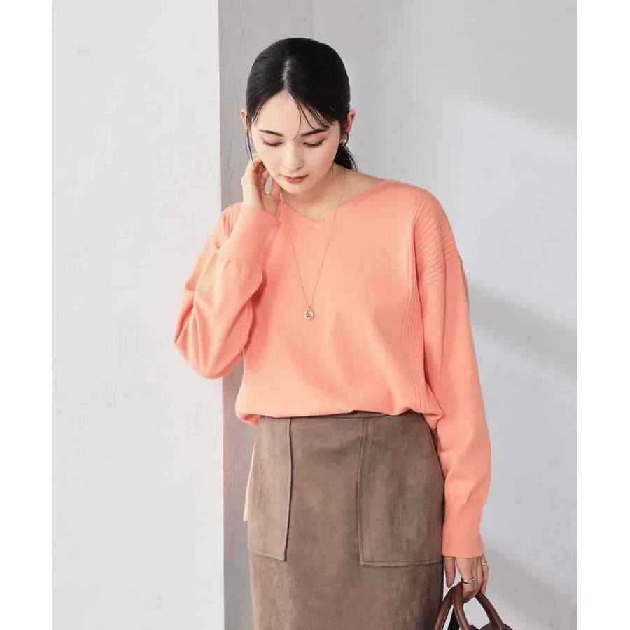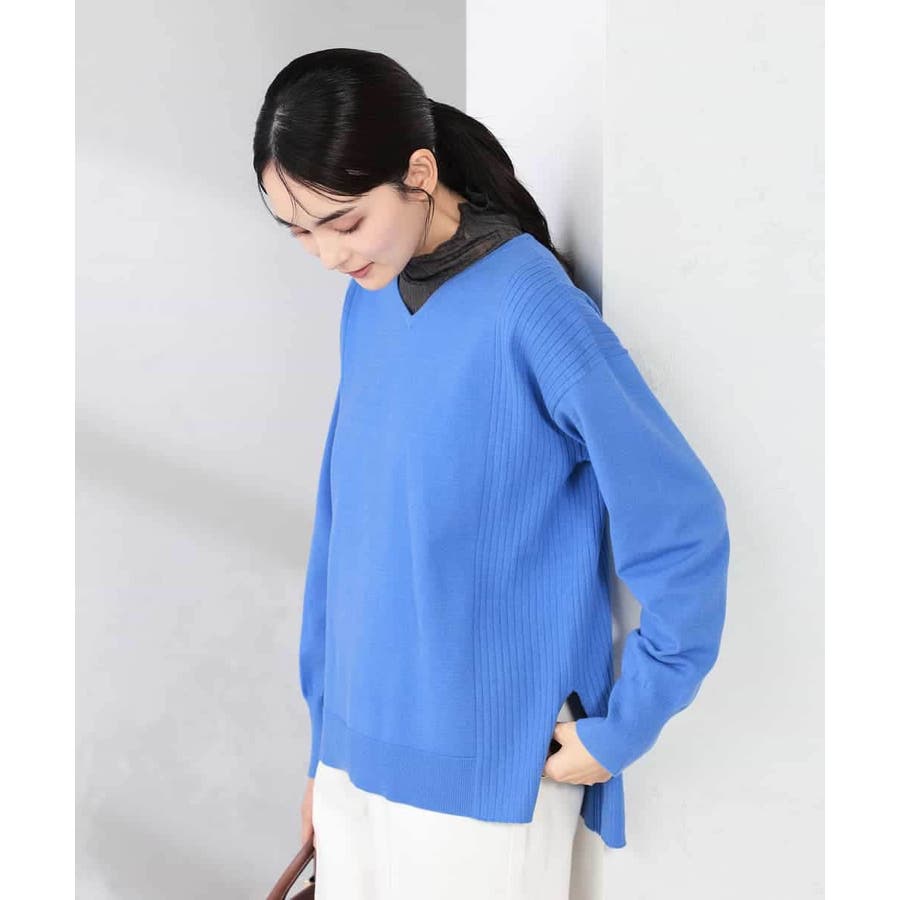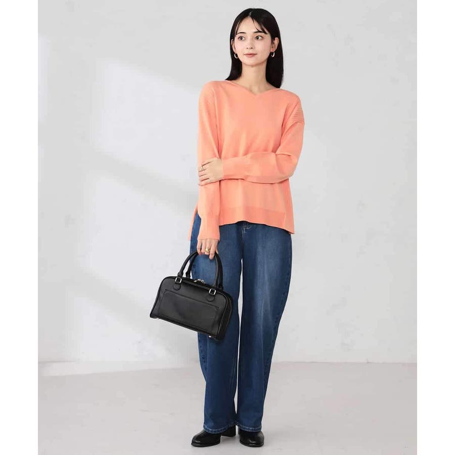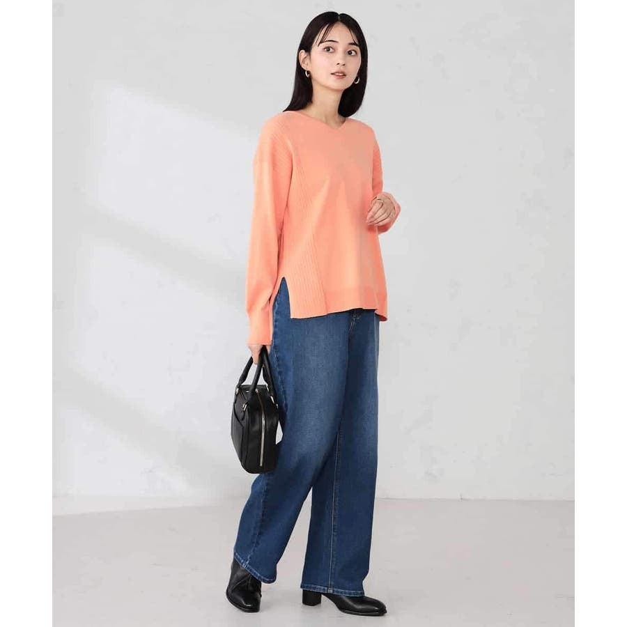 ・浅めのVネックで顔まわりがすっきり、インナー重ねもしやすい設計