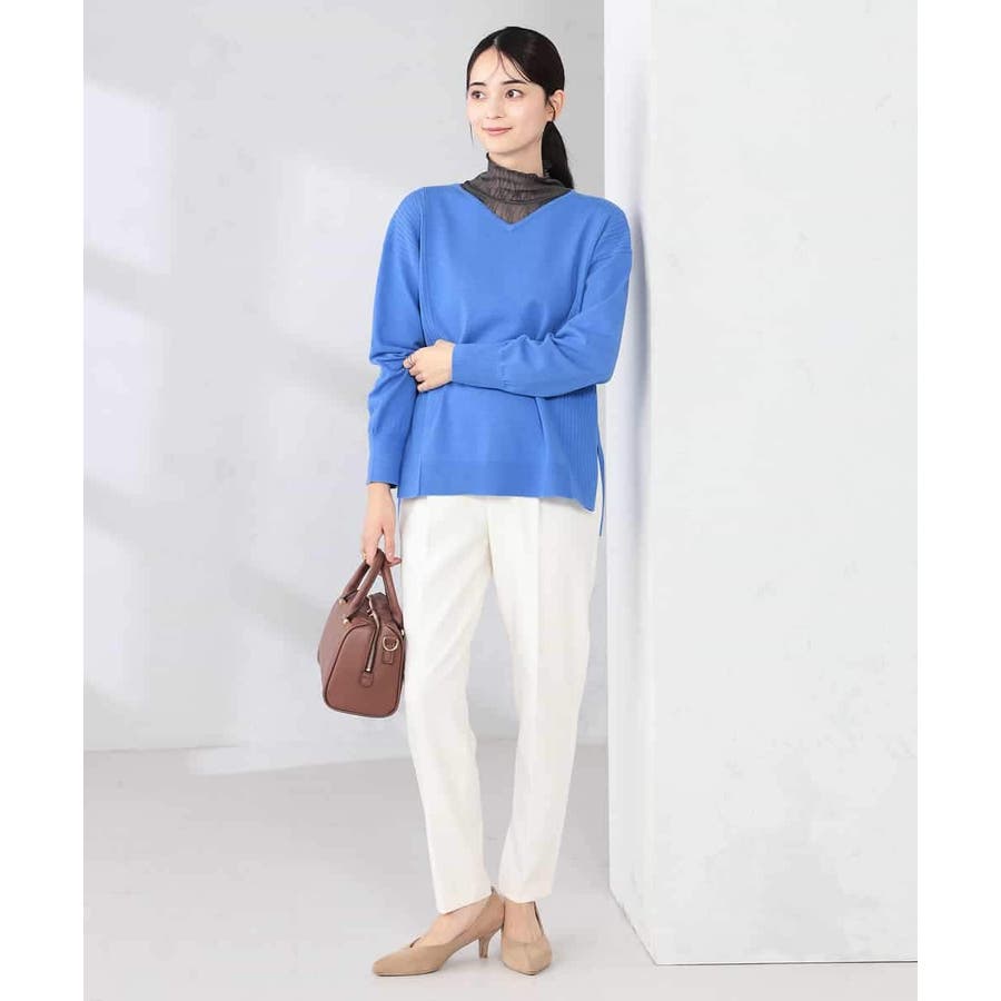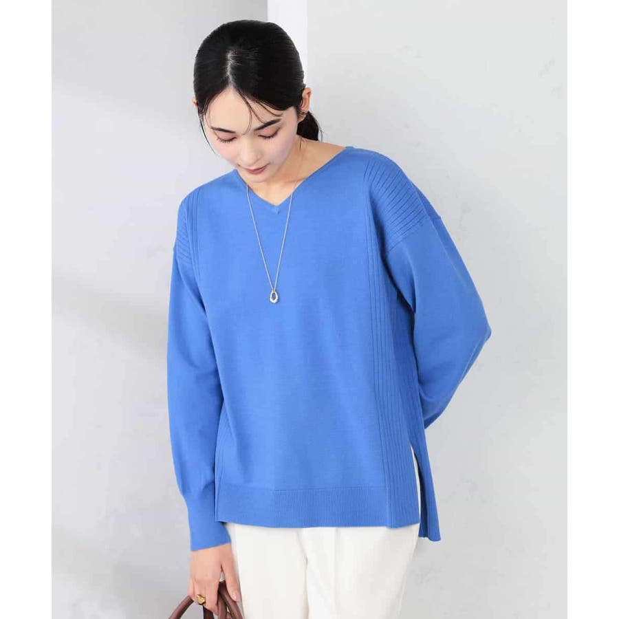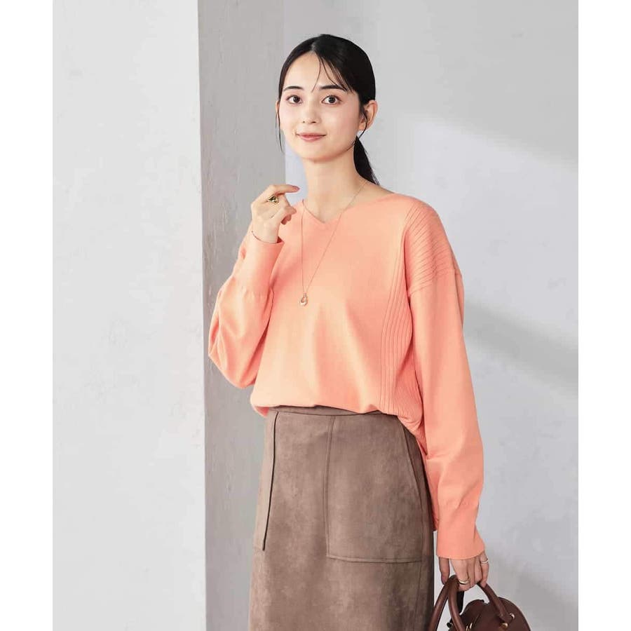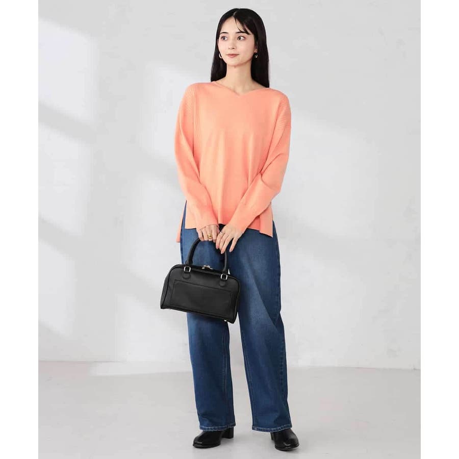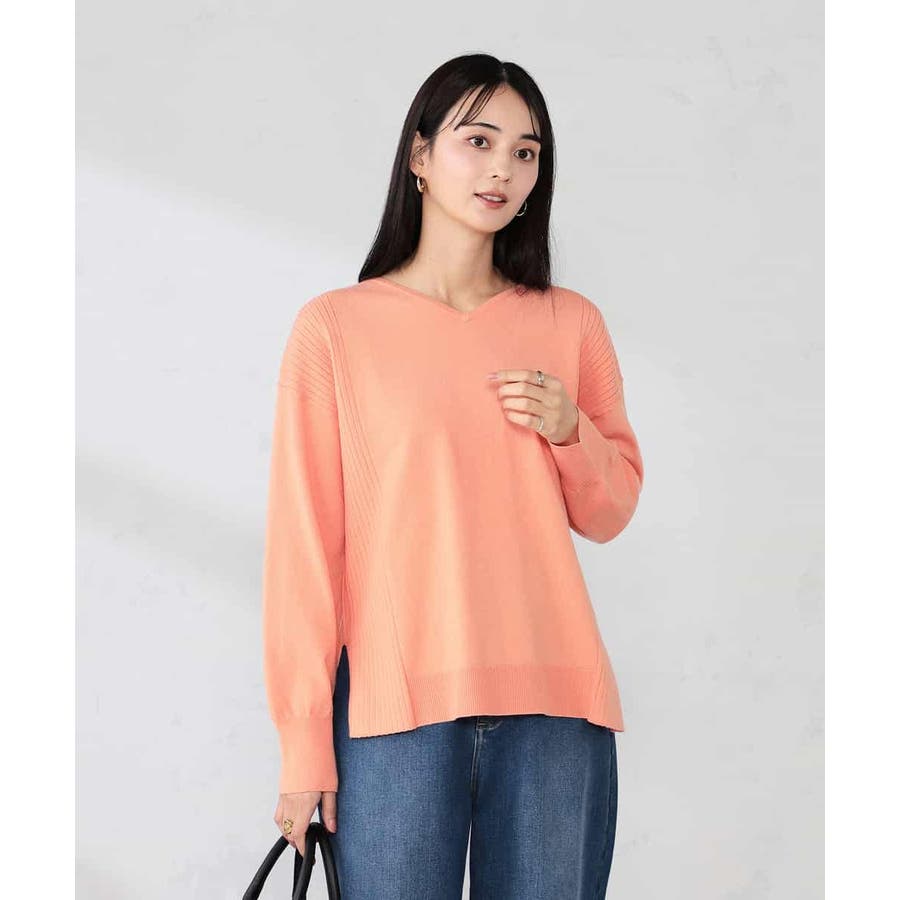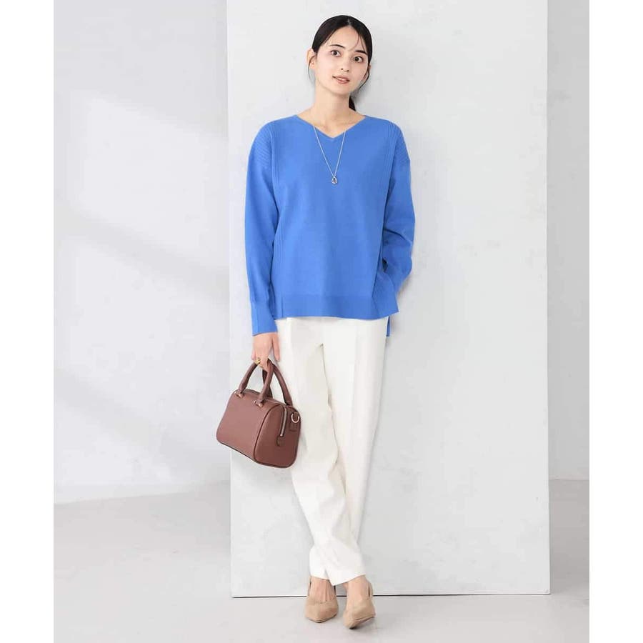 ・浅めのVネックで顔まわりがすっきり、インナー重ねもしやすい設計