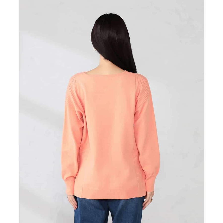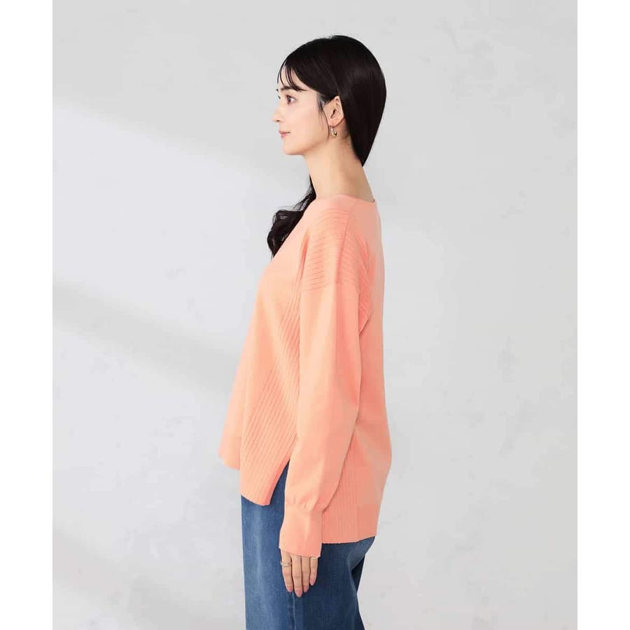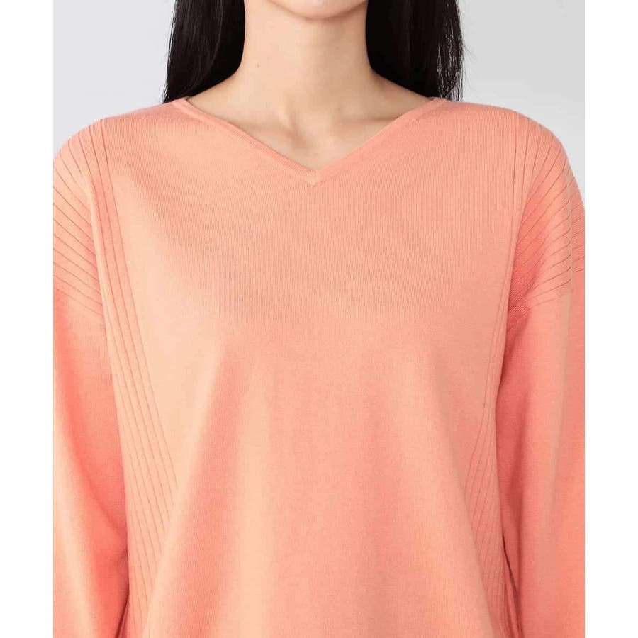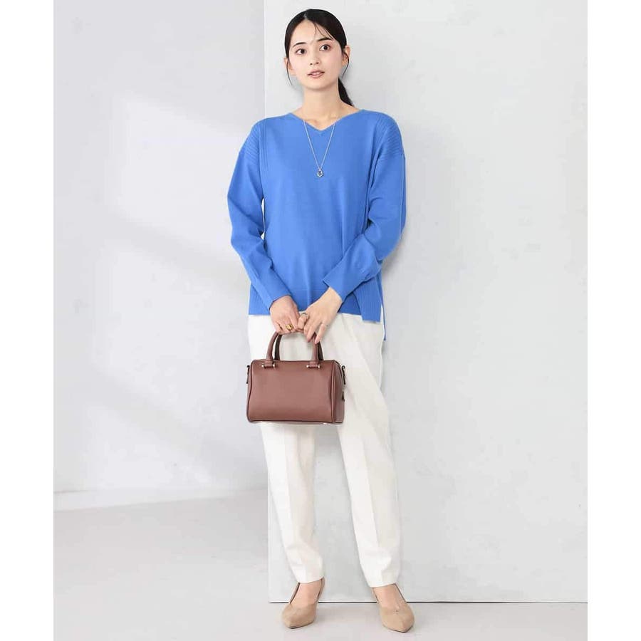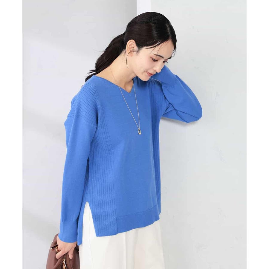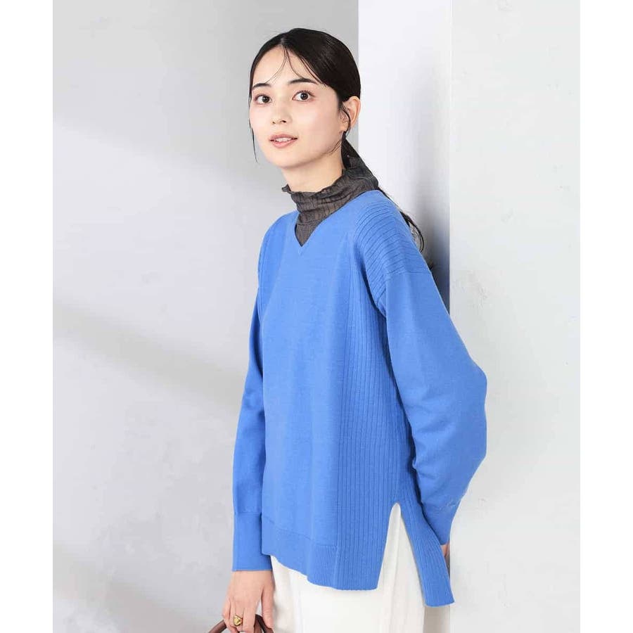 ・浅めのVネックで顔まわりがすっきり、インナー重ねもしやすい設計
