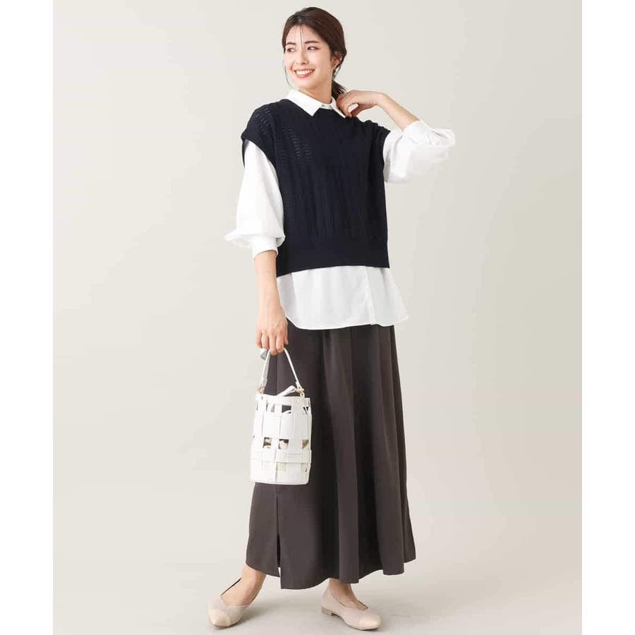 グレージュ:グレージュのベスト×ホワイトのブラウス