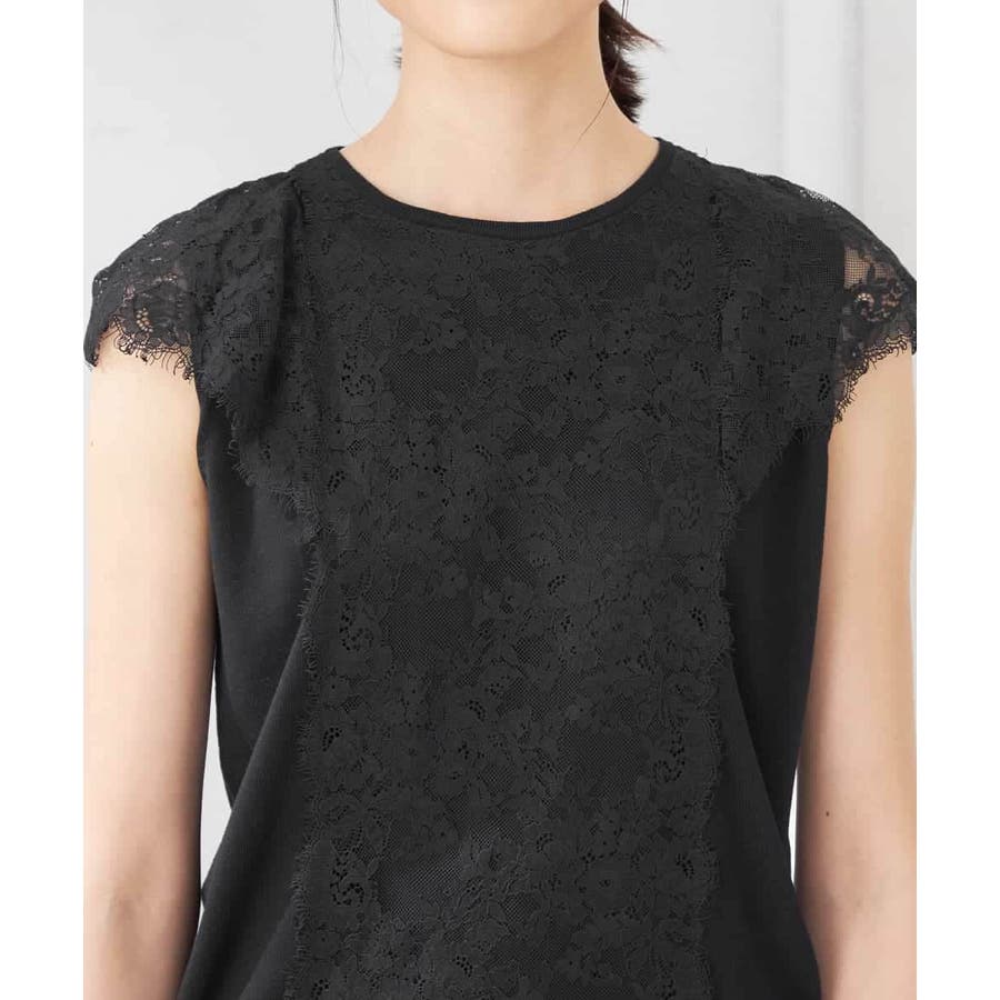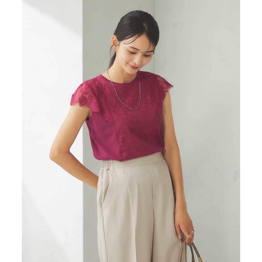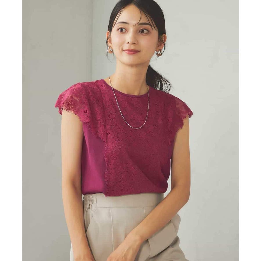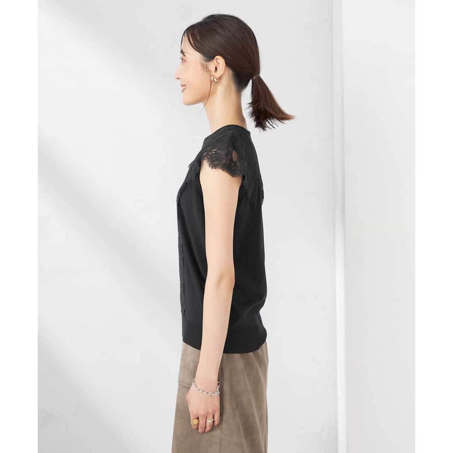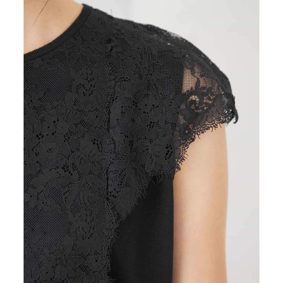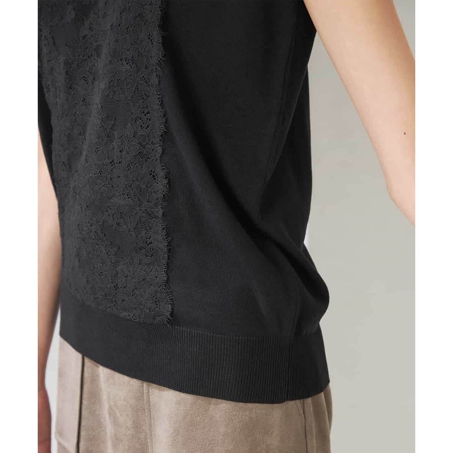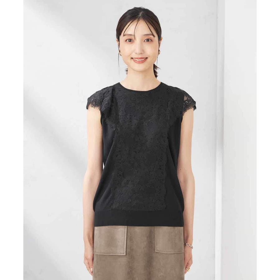 ・肌触りの良いシンプルなノースリーブニットに贅沢に施したレースが華やかなフェミニンニット