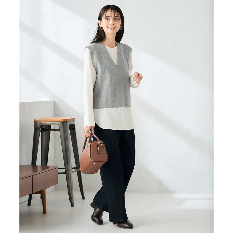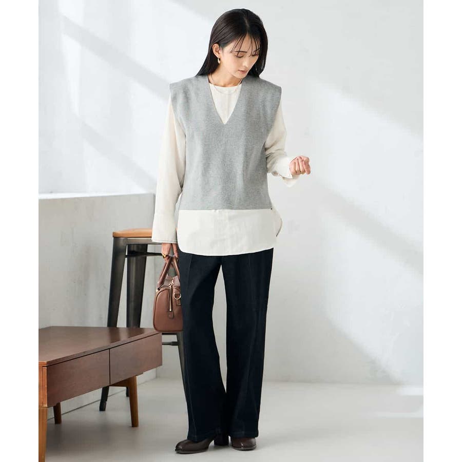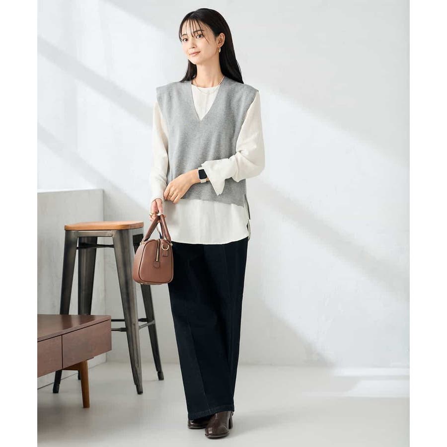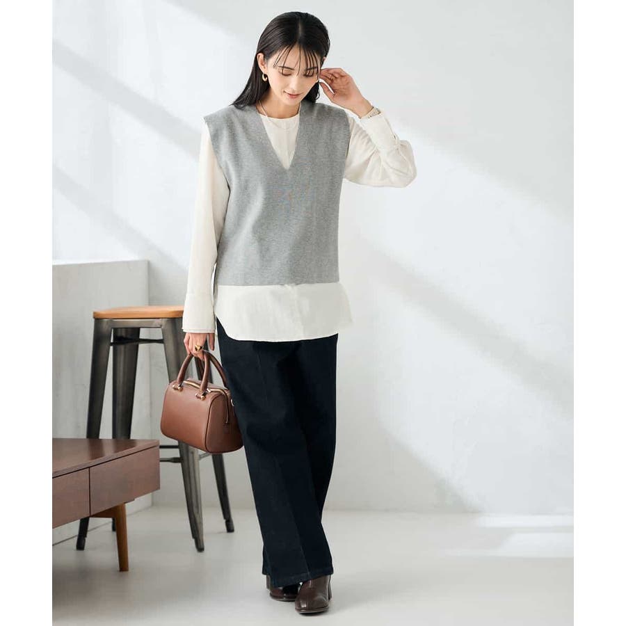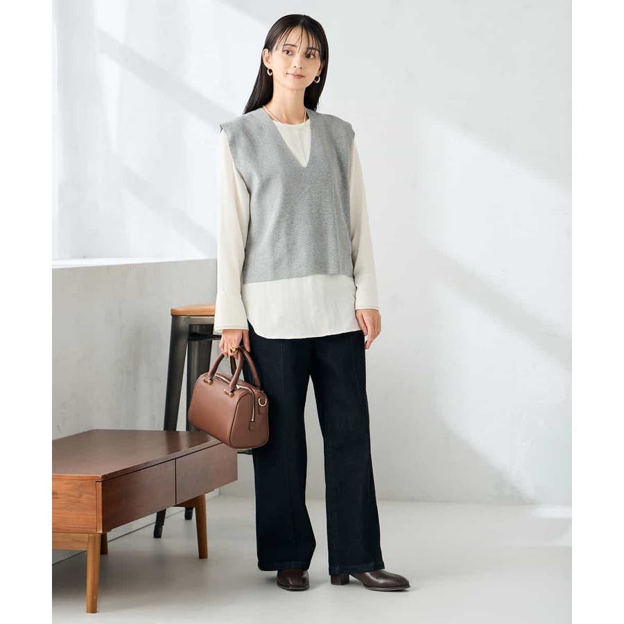 ・深めのVネックでレイヤードスタイルもすっきり見え