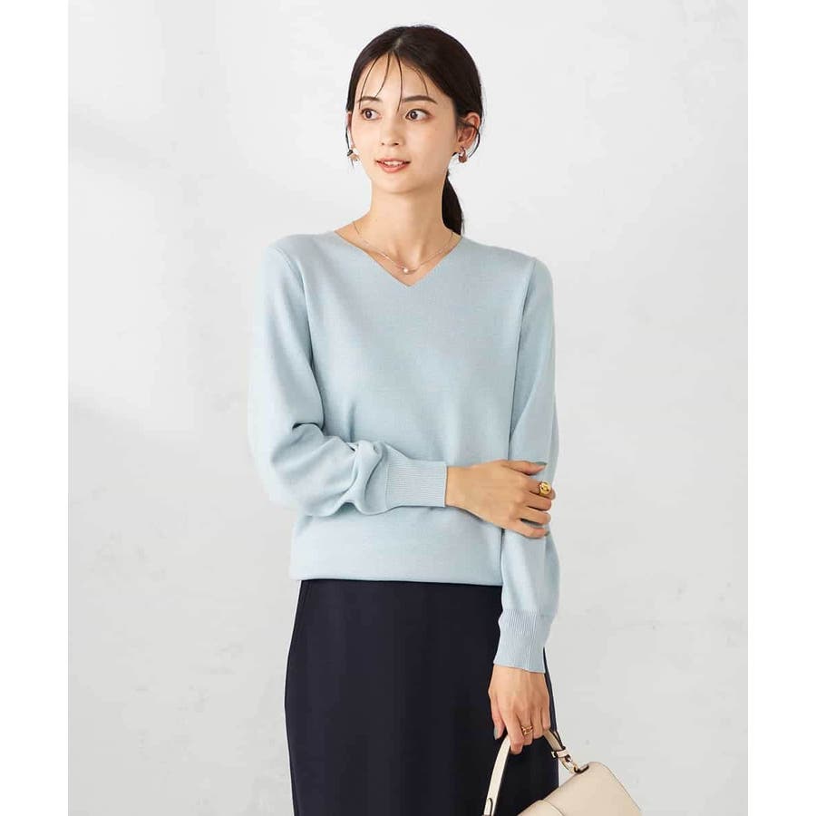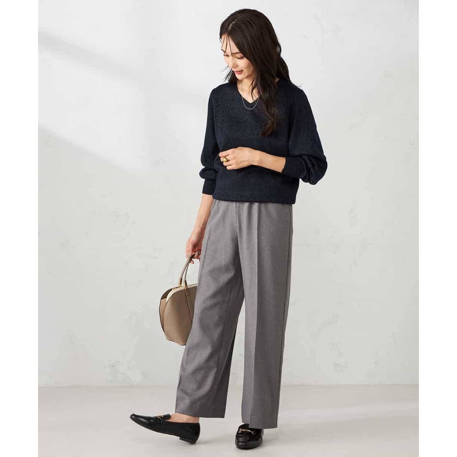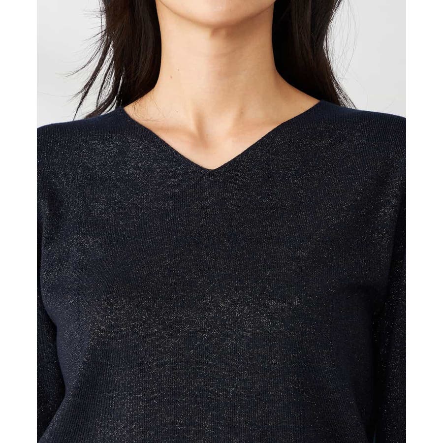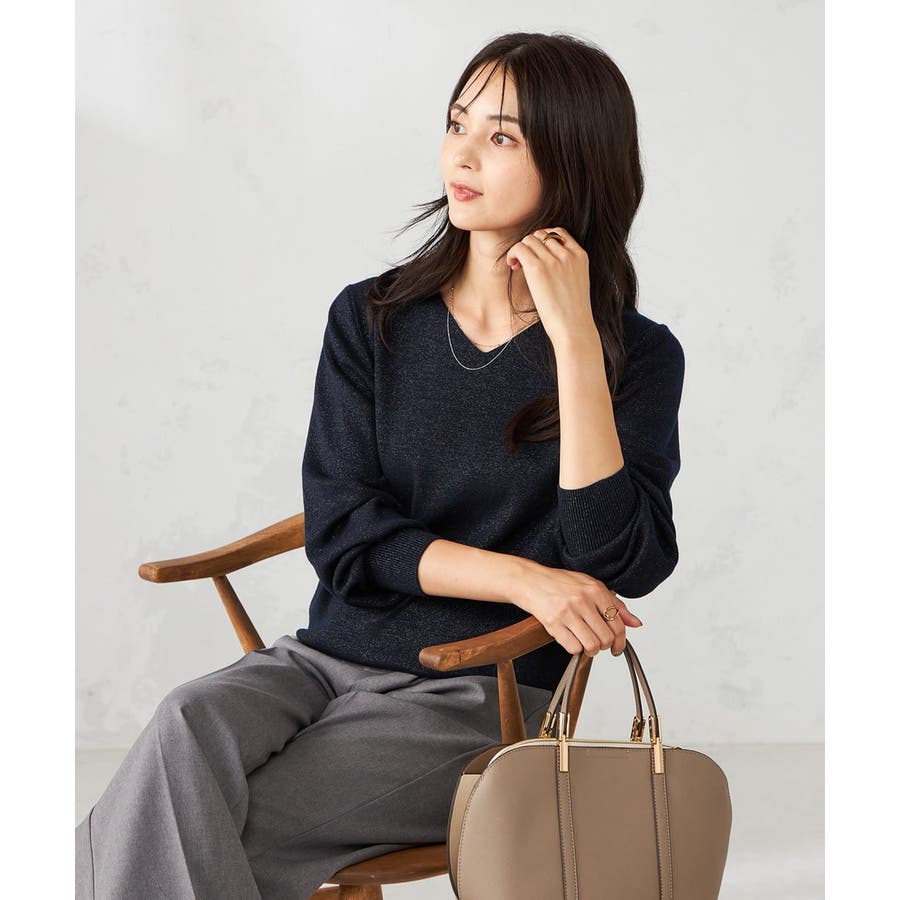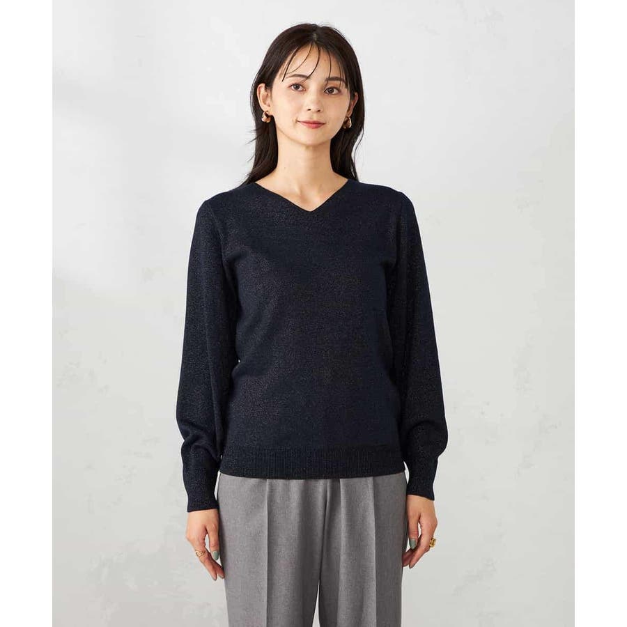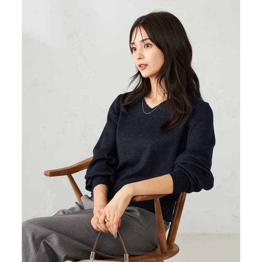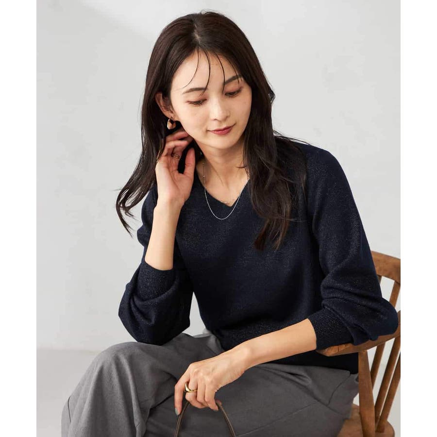 【洗える】ラメVネック美ラクるパフスリーブニット