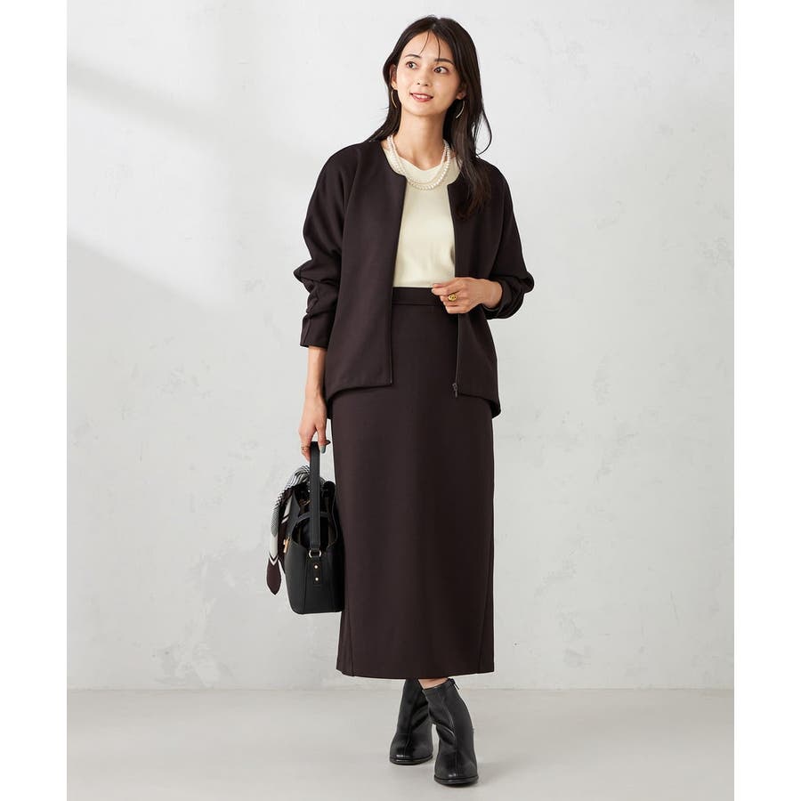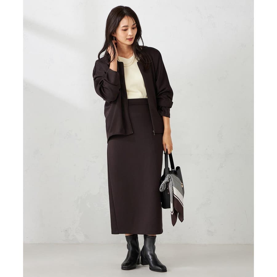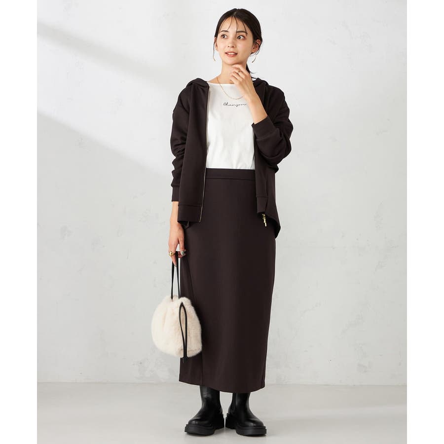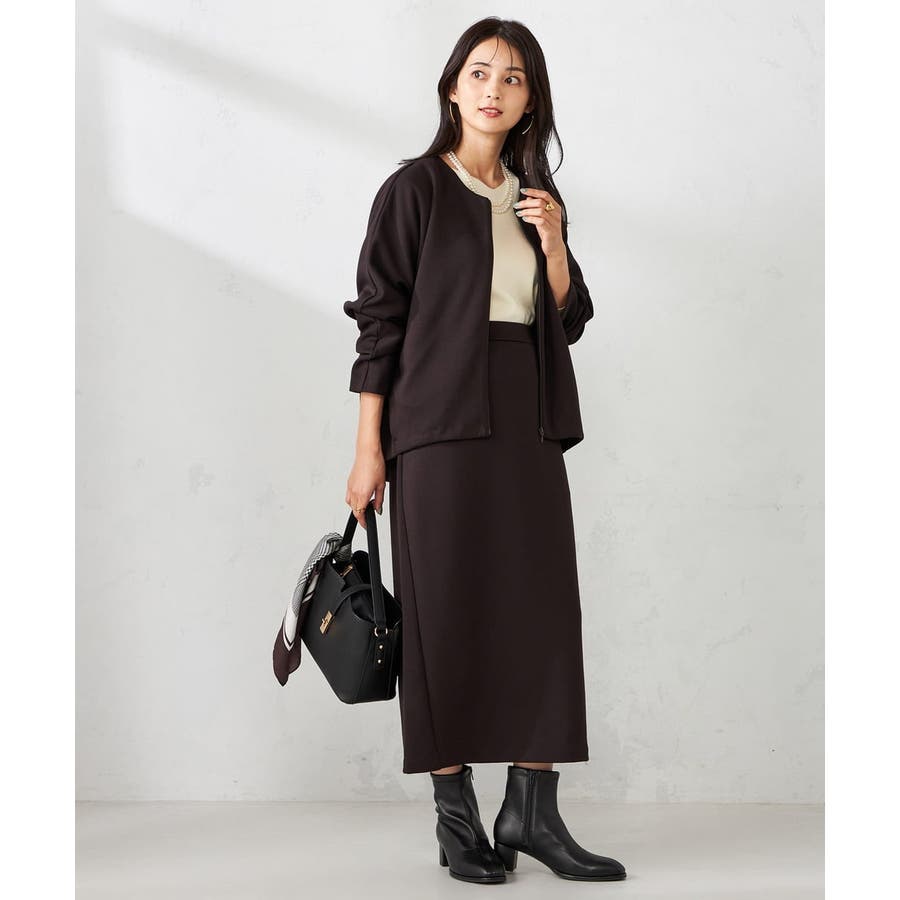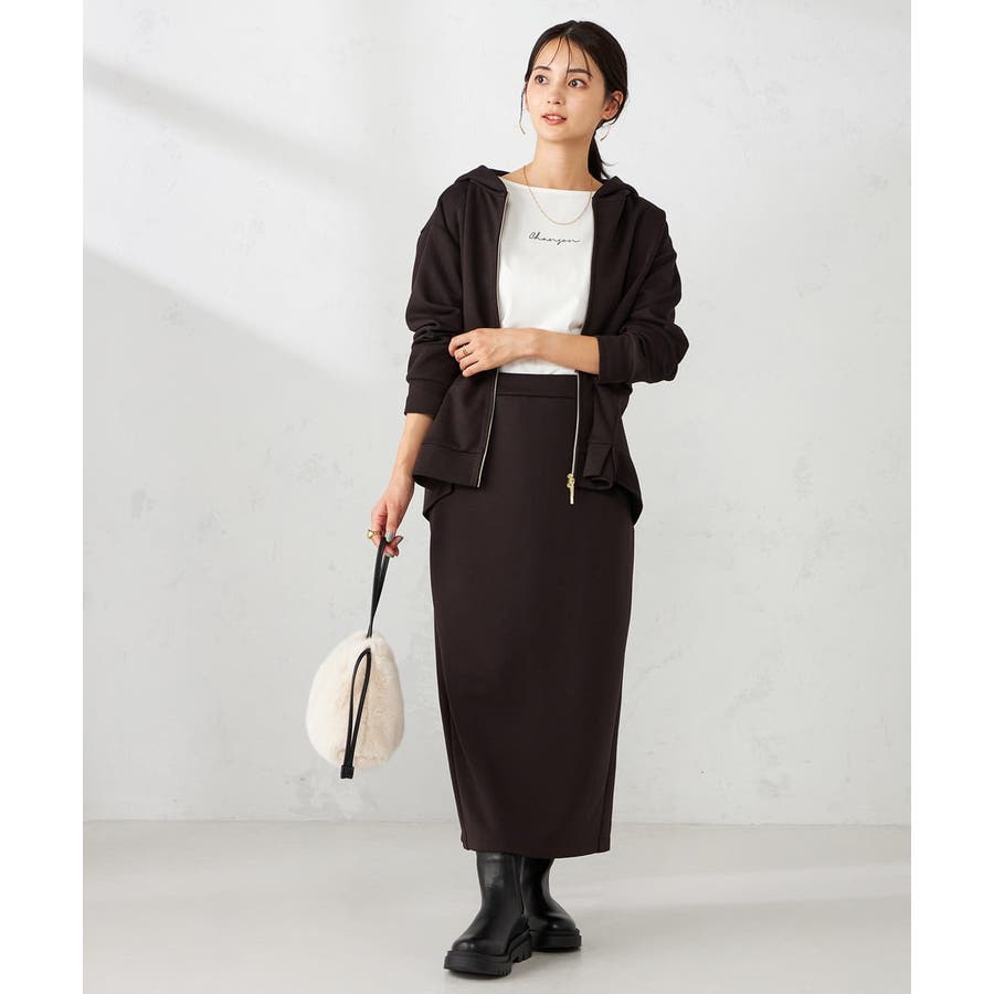 同素材のカーディガンやスウェットとセットアップ着用で楽な着心地ながらきれいめな着こなしに。