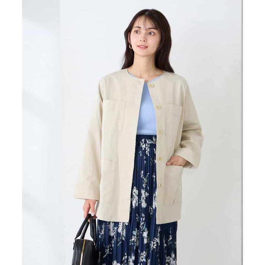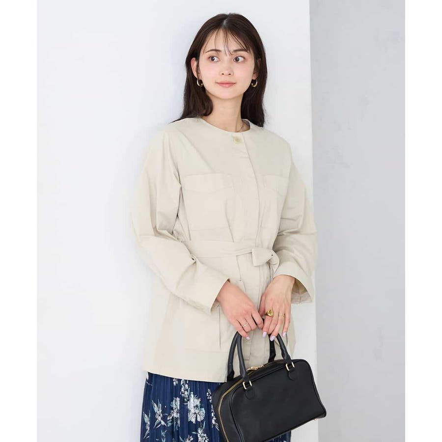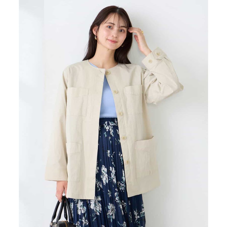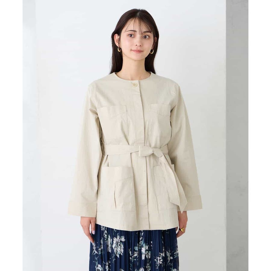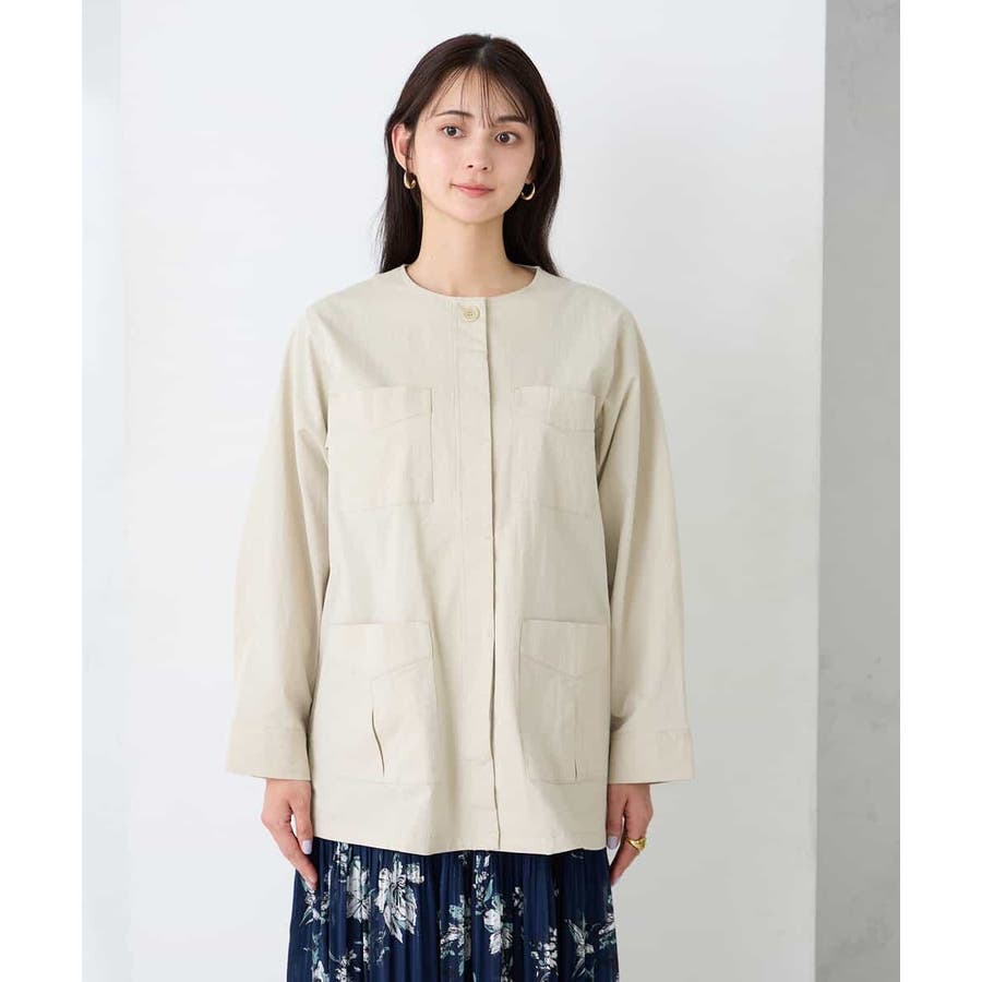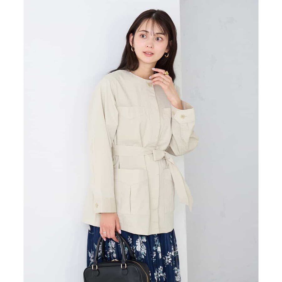 すっきりしたノーカラーデザインで、大人女性が着やすい大きすぎないサイジングのサファリジャケットです。