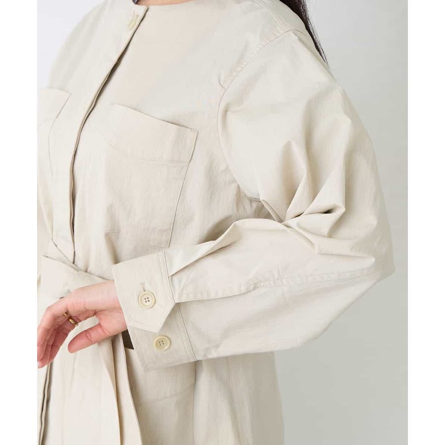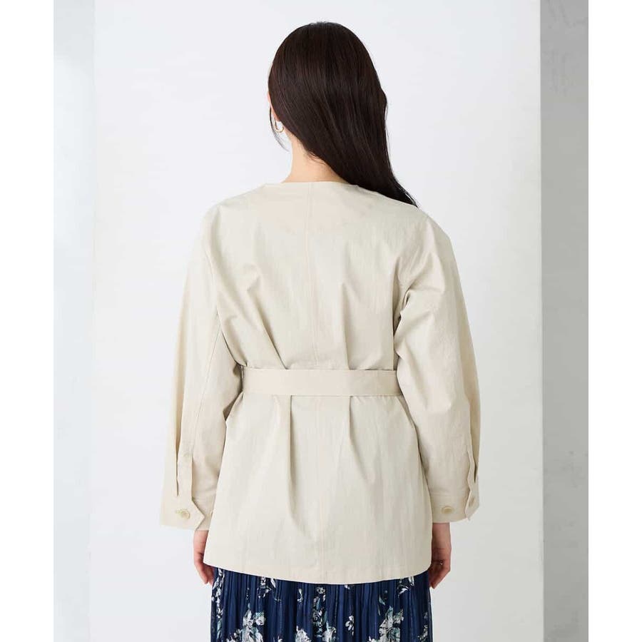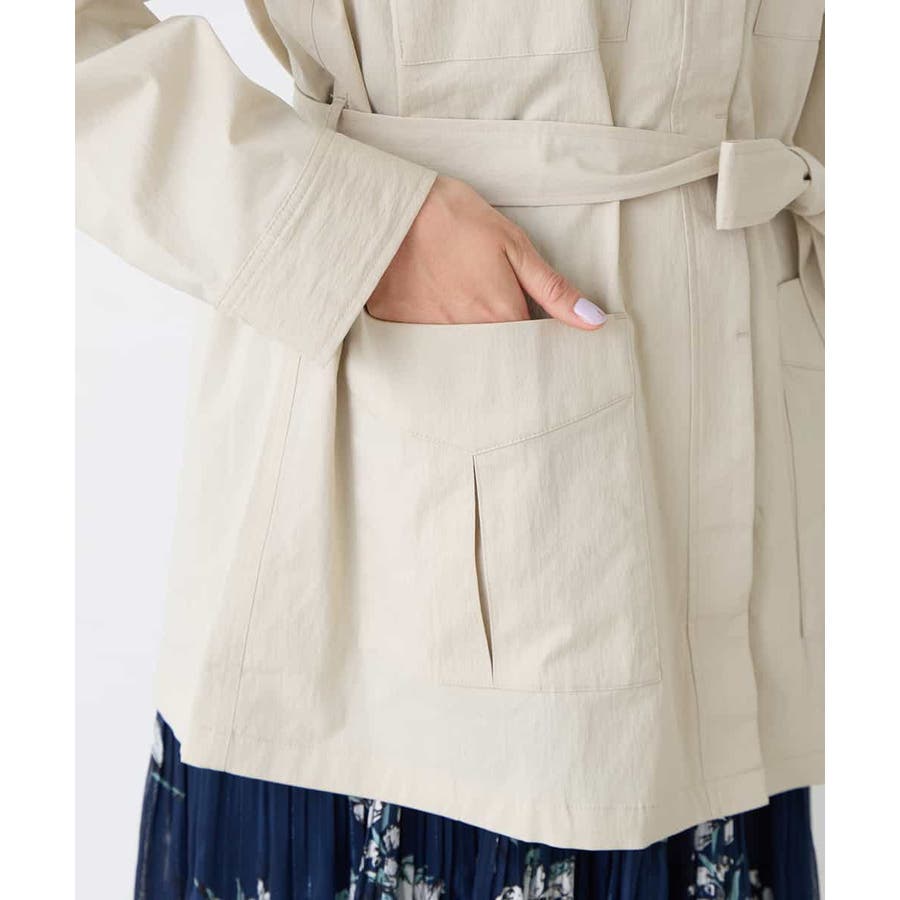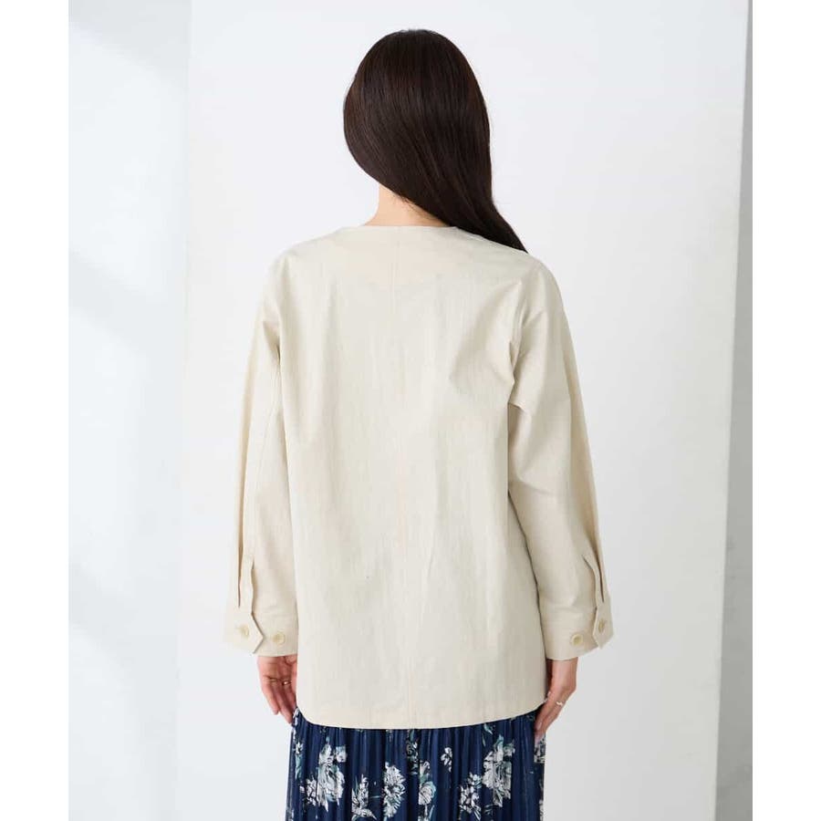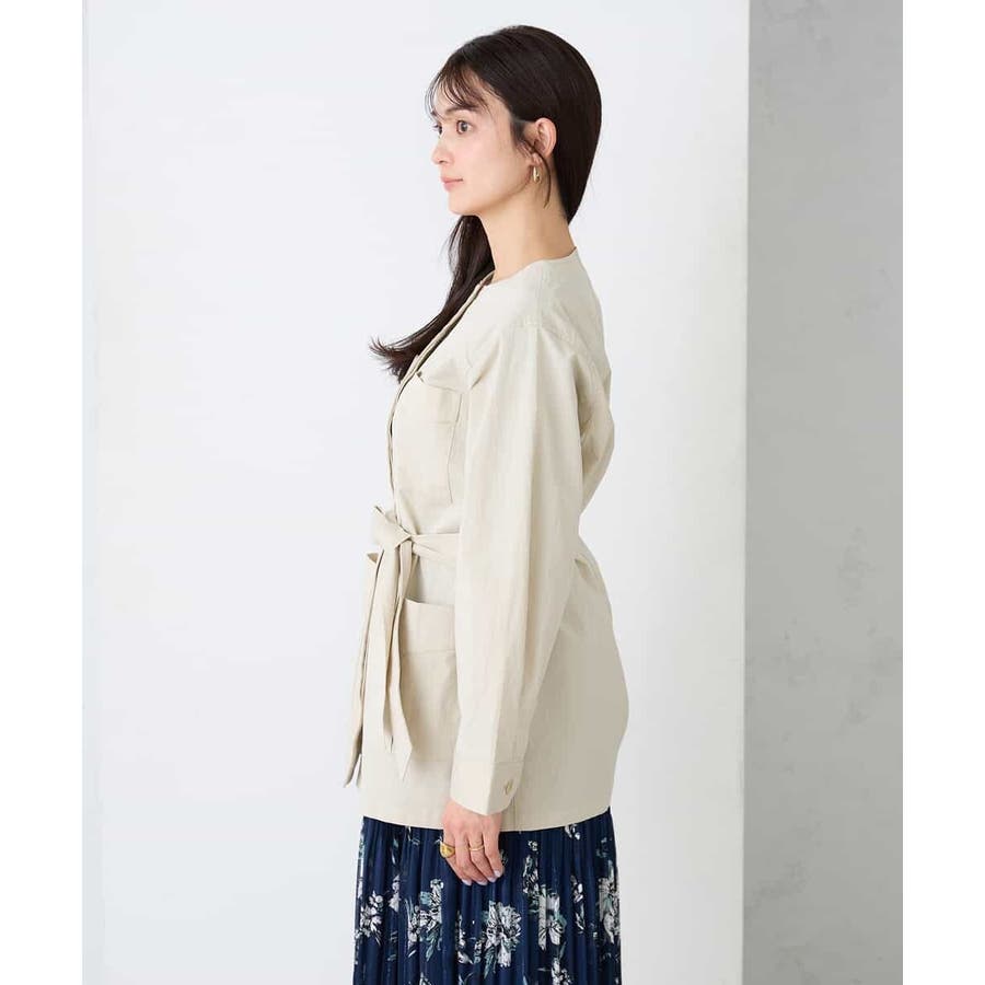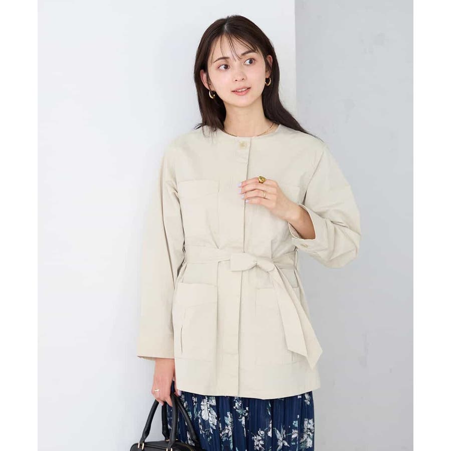 すっきりしたノーカラーデザインで、大人女性が着やすい大きすぎないサイジングのサファリジャケットです。