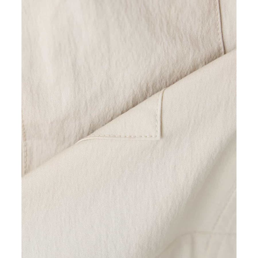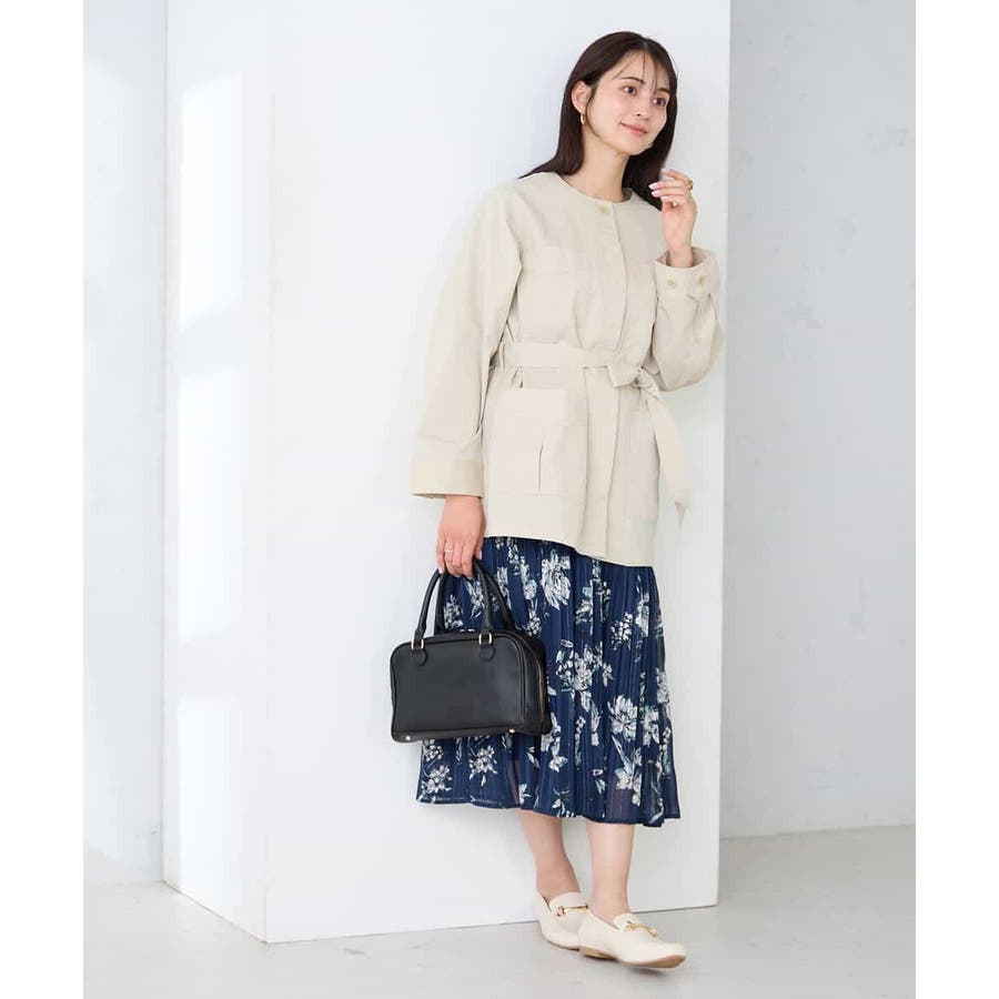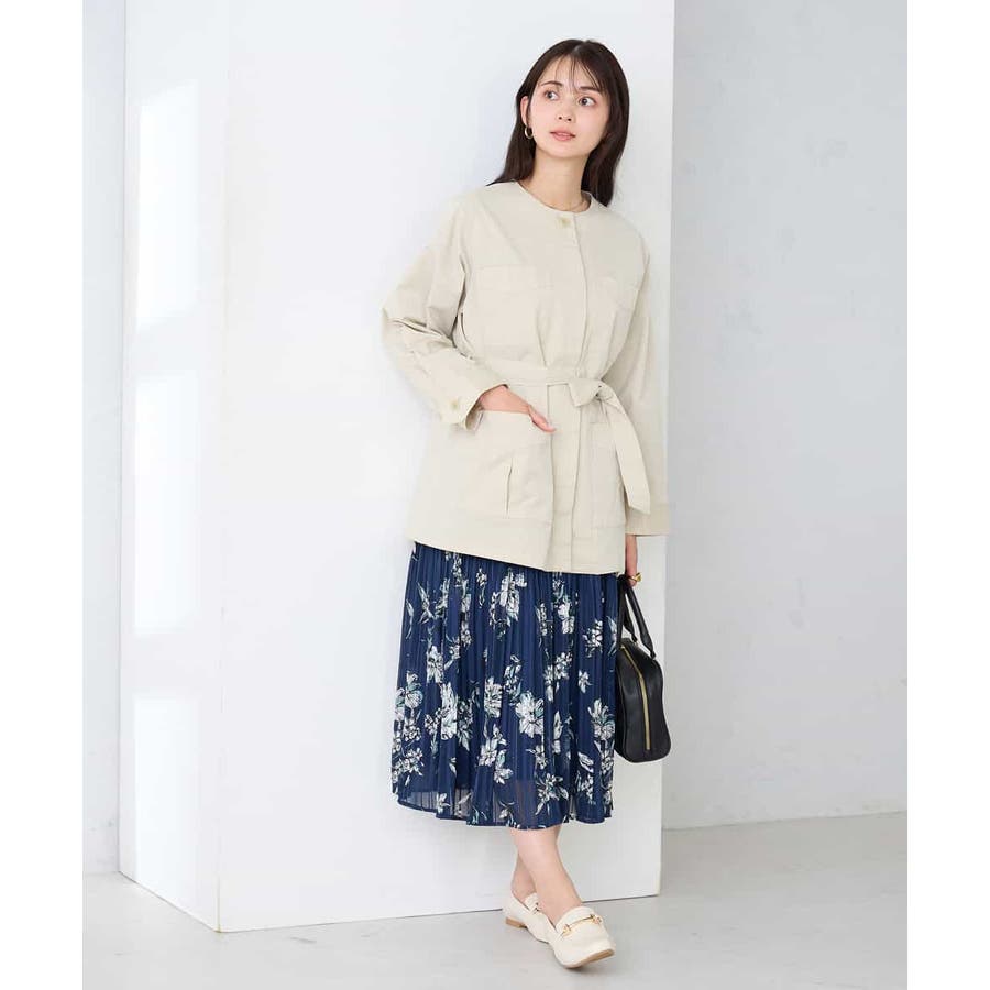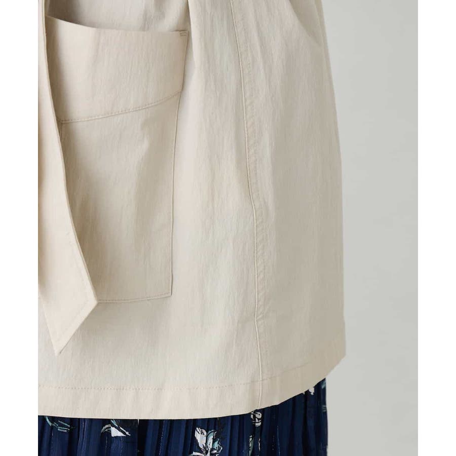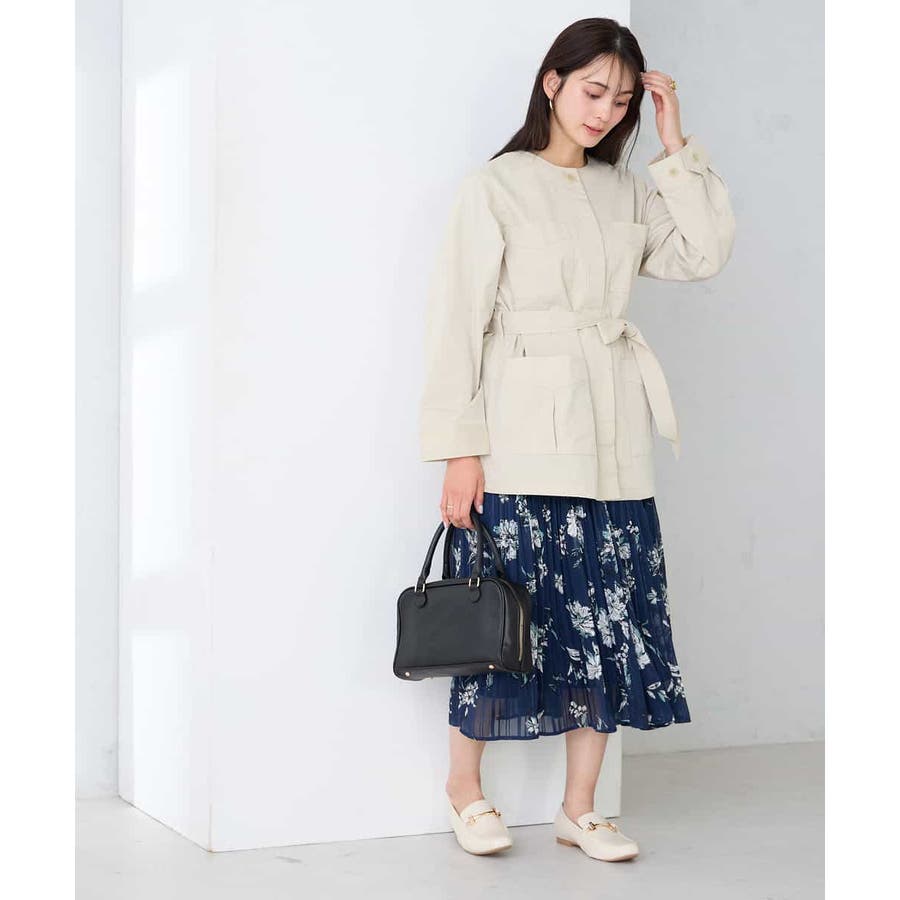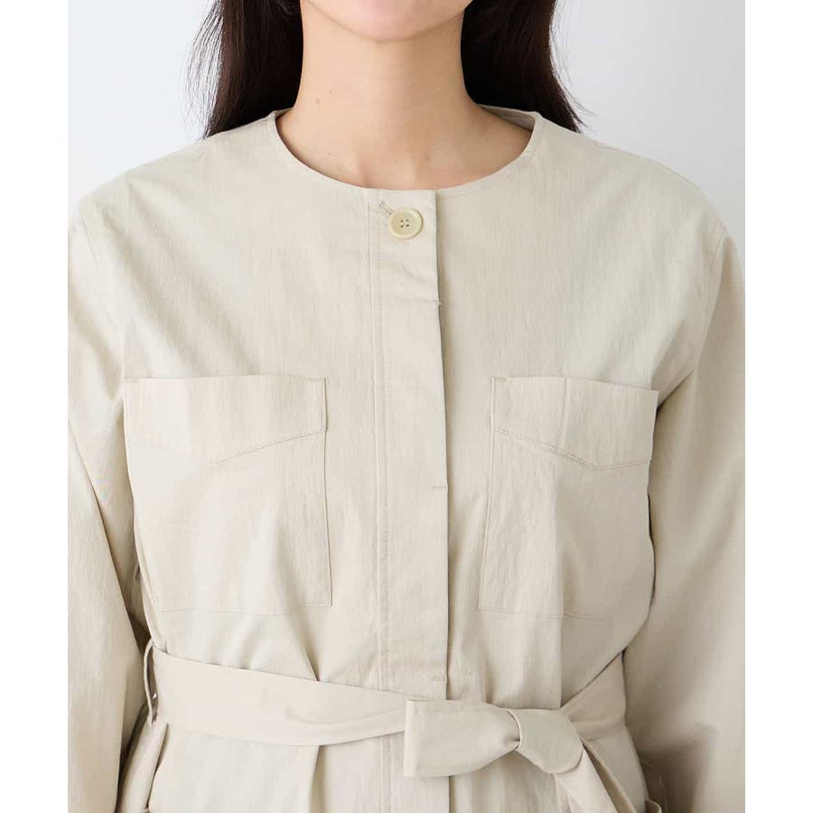 すっきりしたノーカラーデザインで、大人女性が着やすい大きすぎないサイジングのサファリジャケットです。