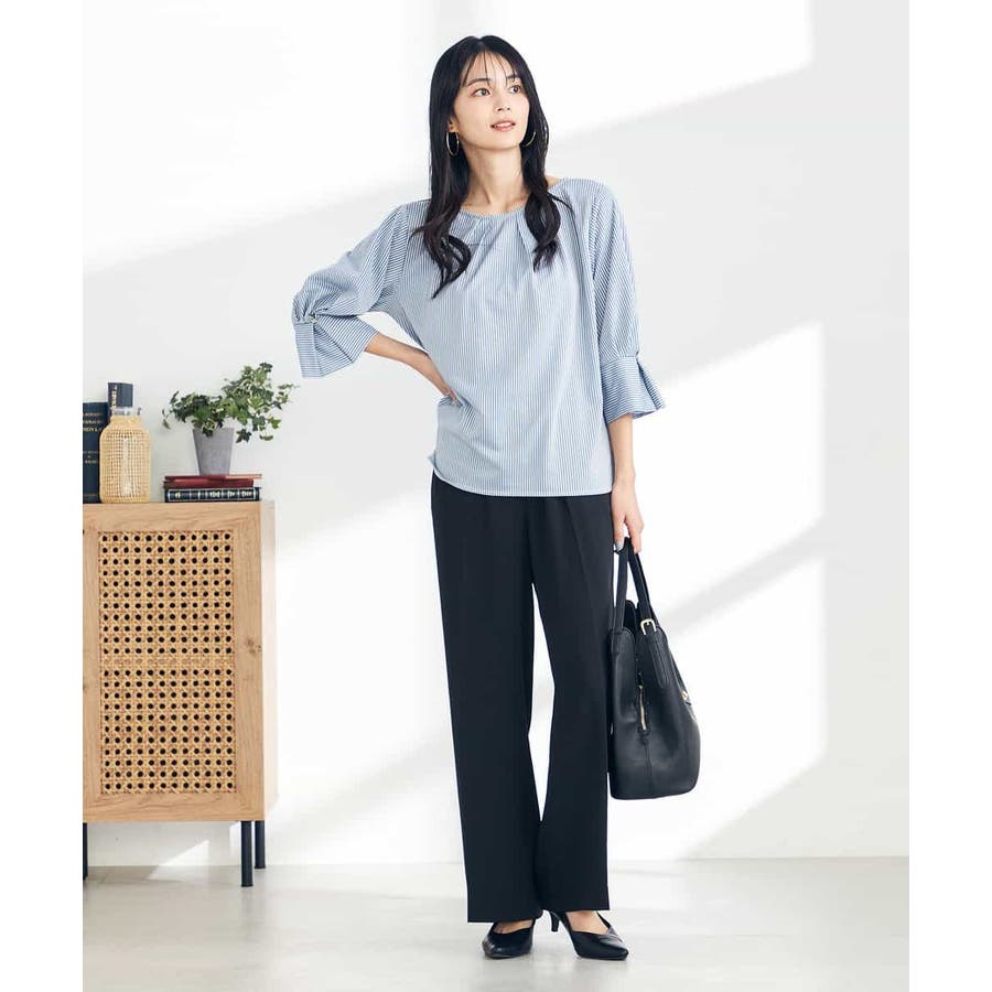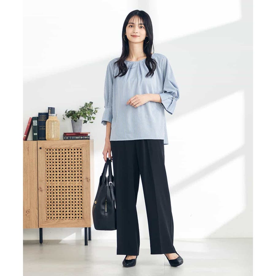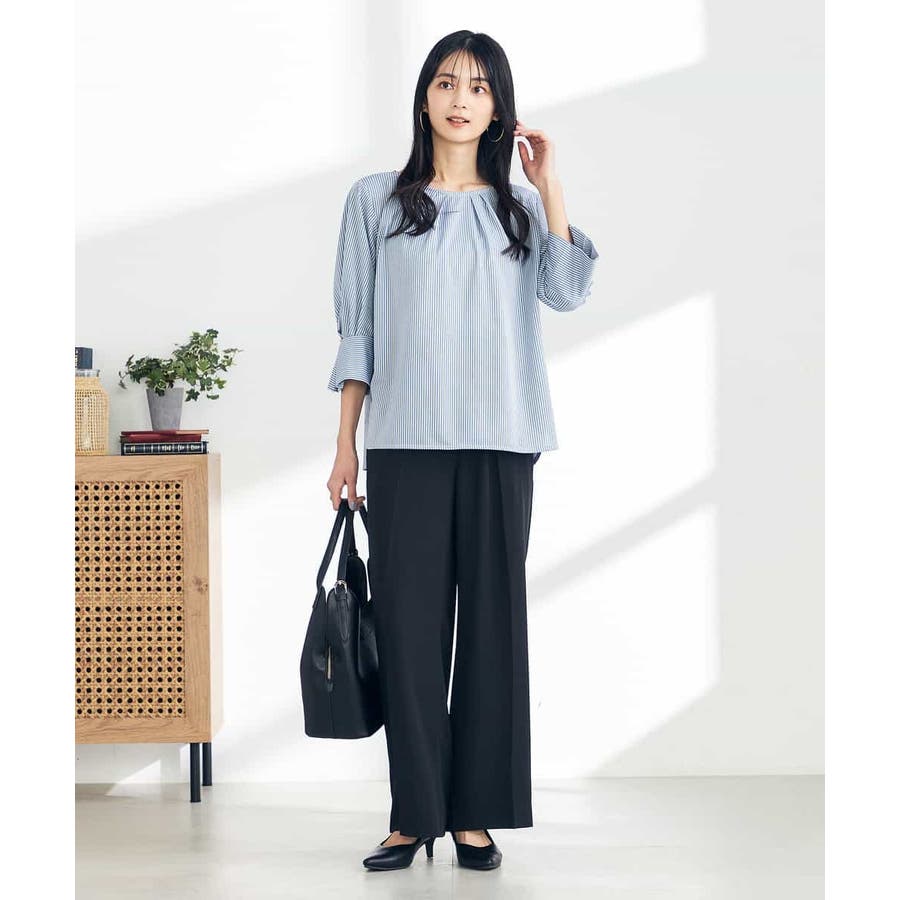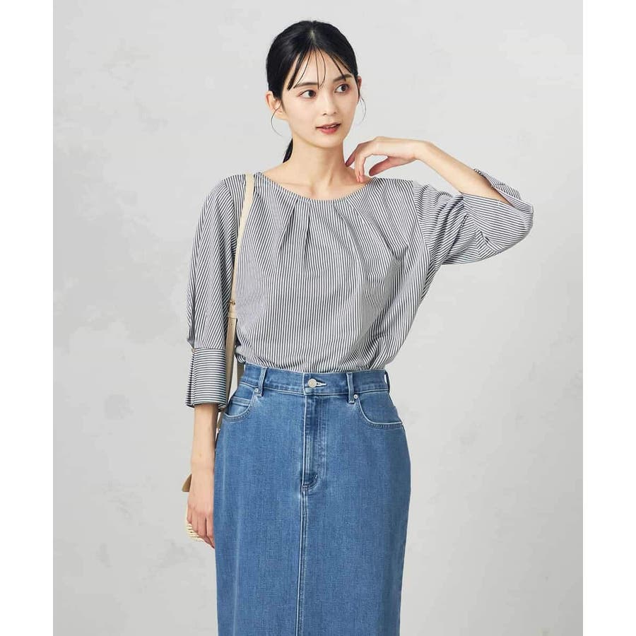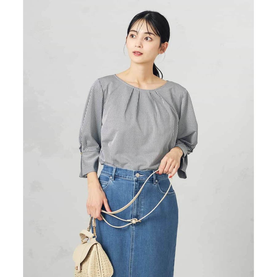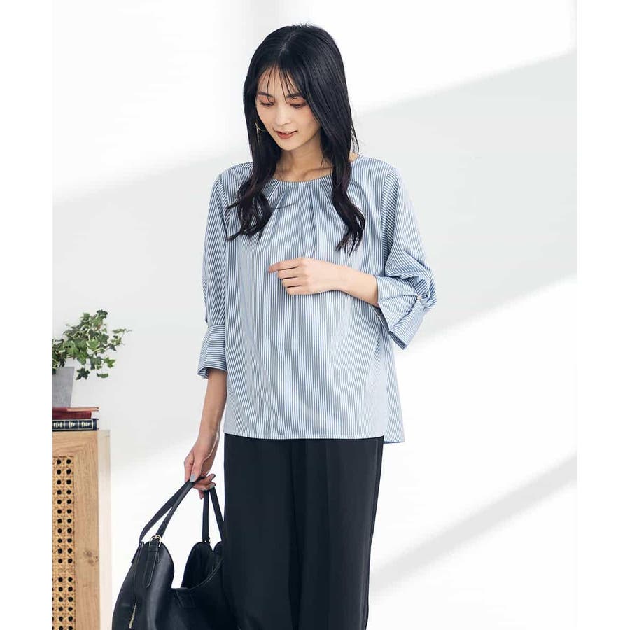 ・タックネックと袖のタックデザインがこなれた印象に