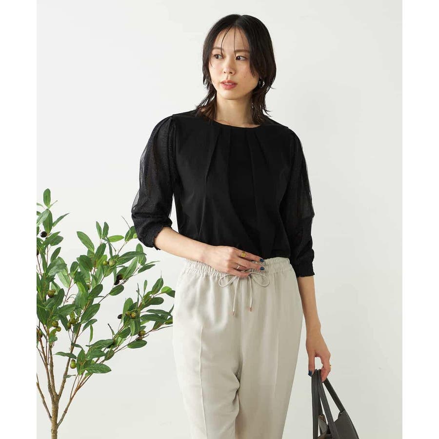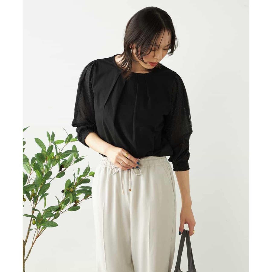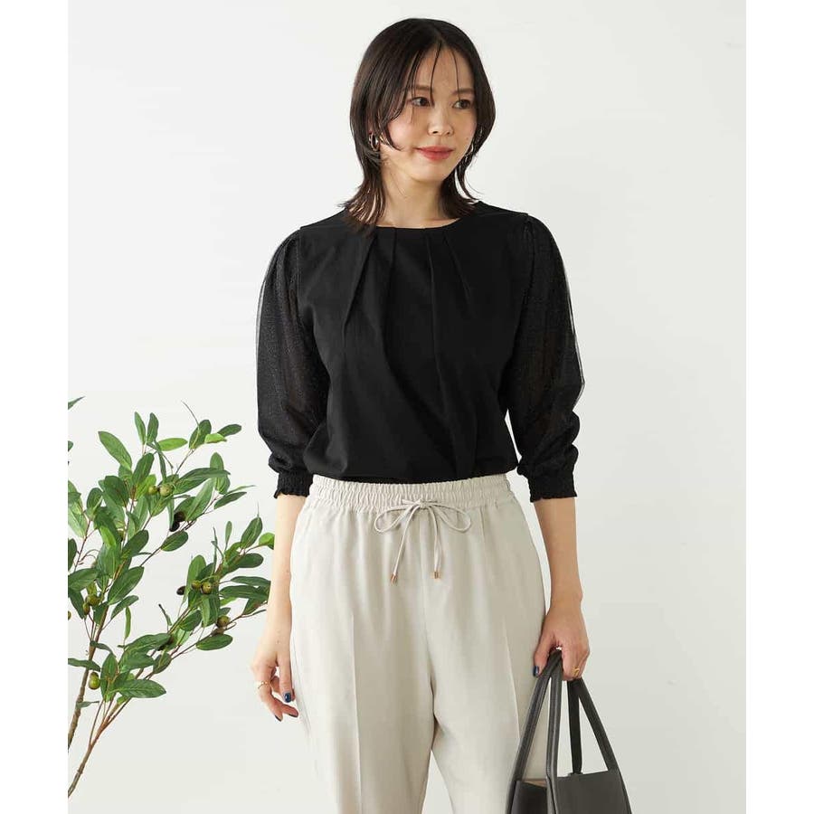 ・袖のチュール素材にはラメが施されていてトレンド感溢れるポイントに