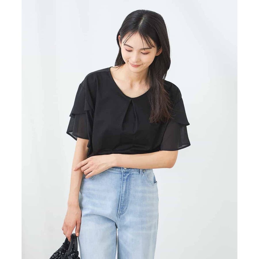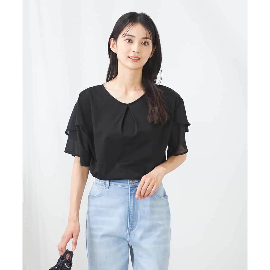 1袖シフォン+浅めのVネックラインとフロントタックがきれいめな印象に。