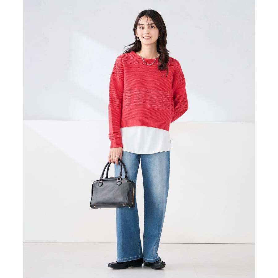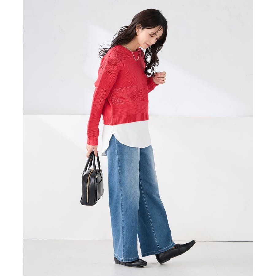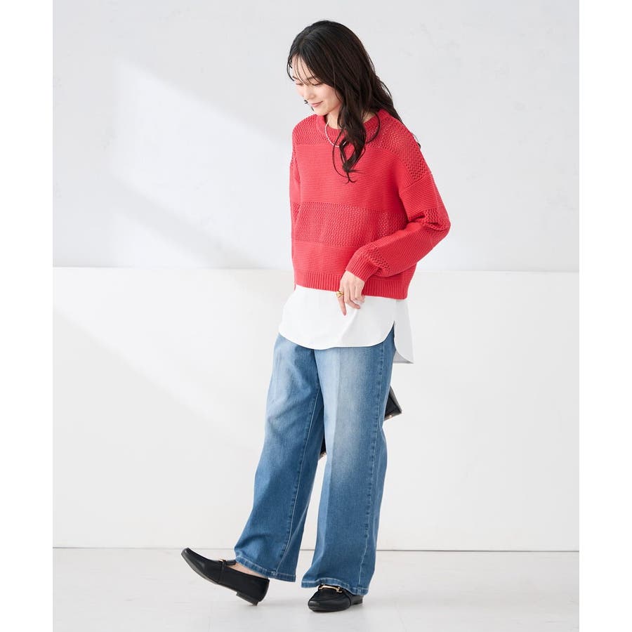 メッシュニットや短丈トップスと合わせたレイヤードスタイルがおすすめ。