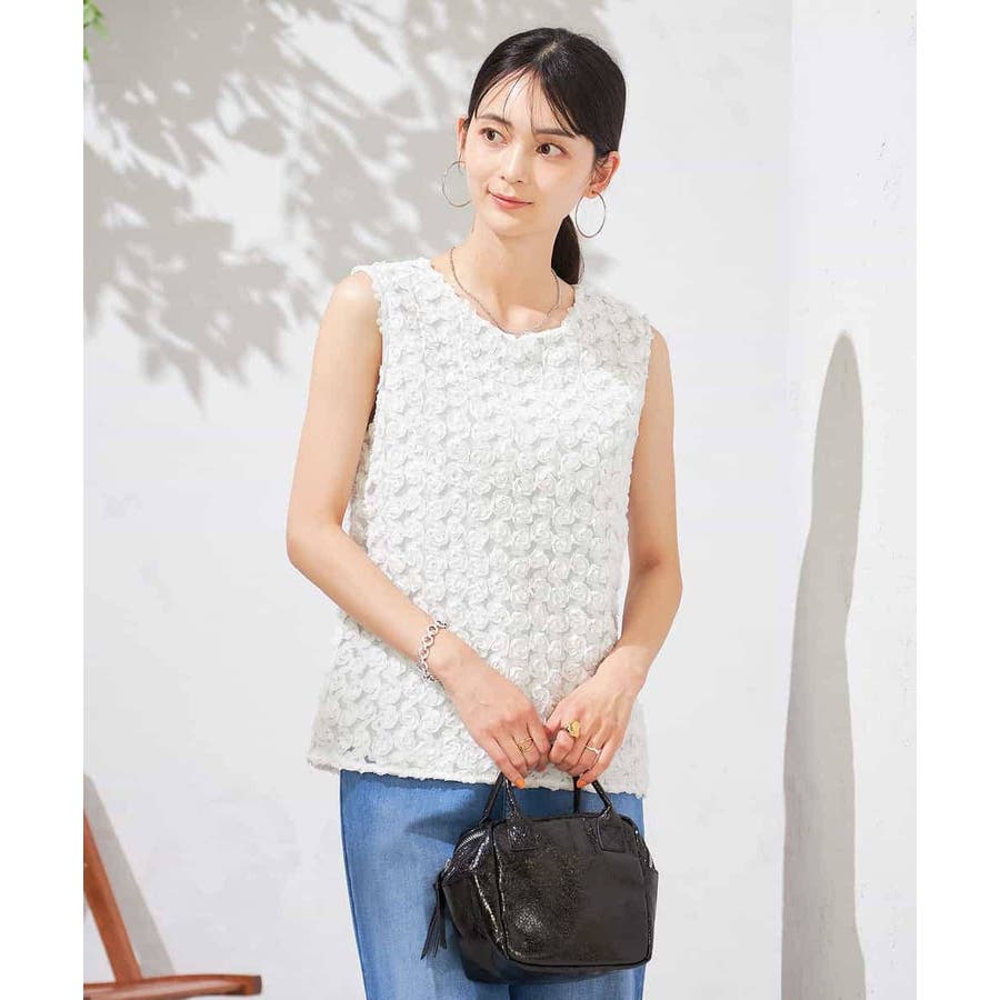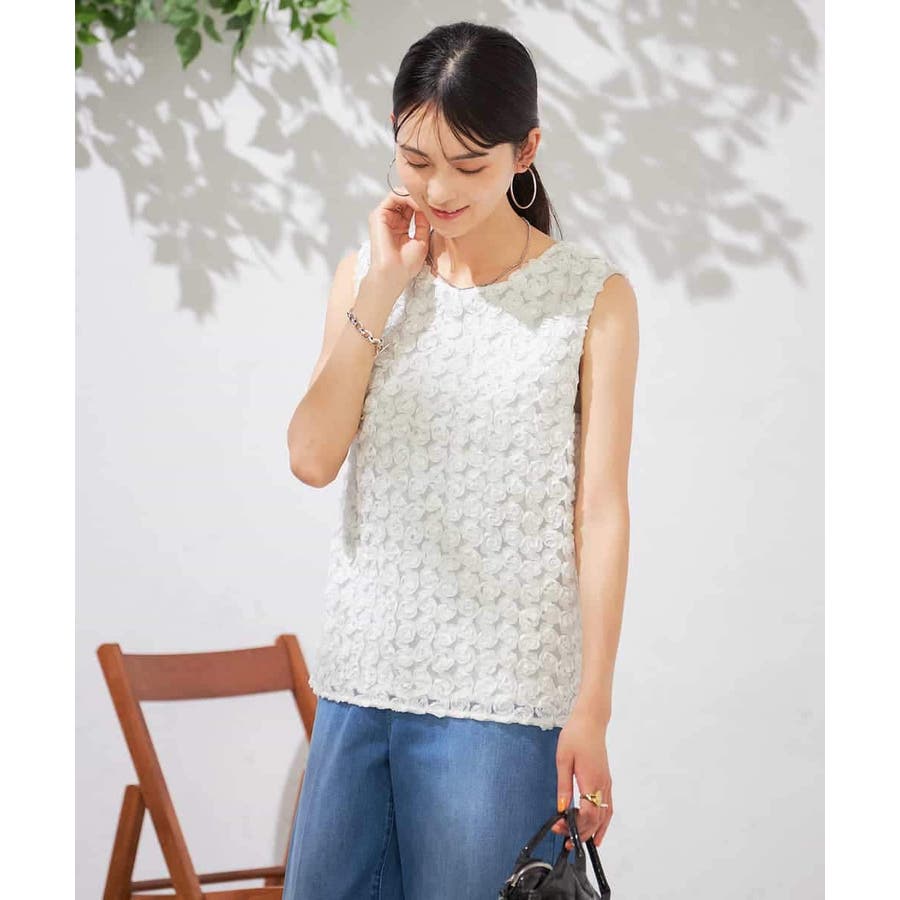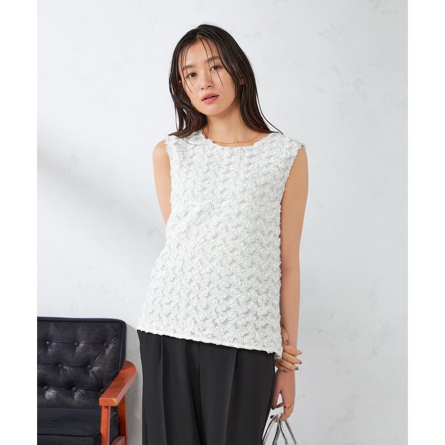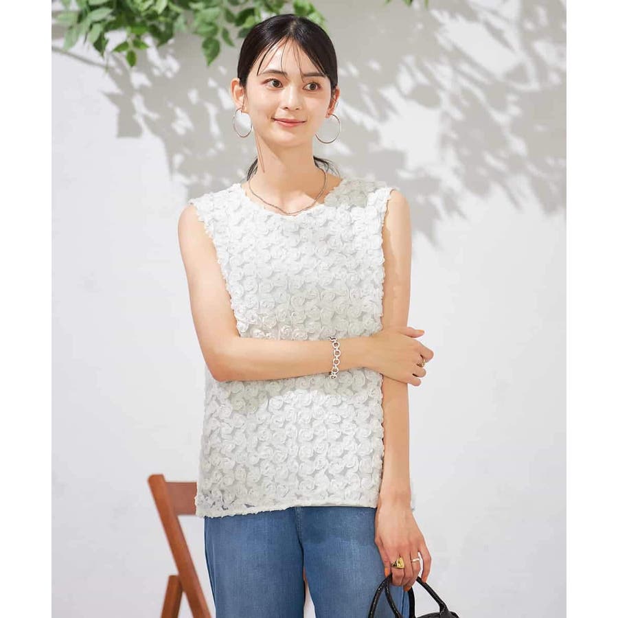 ・フェミニンなバラモチーフですが、ノースリーブでラフ見えし大人な着こなしが叶います