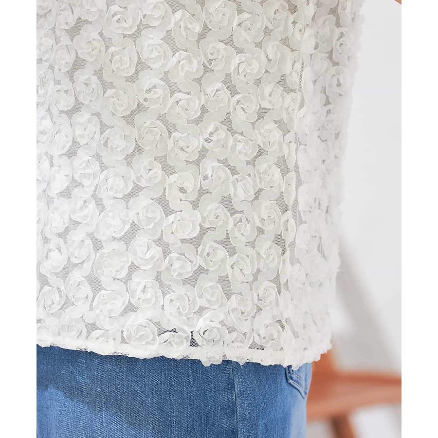 ・バラ柄のチュールレースとラメ入りのカットソー生地を重ねた意匠感のあるトップス
