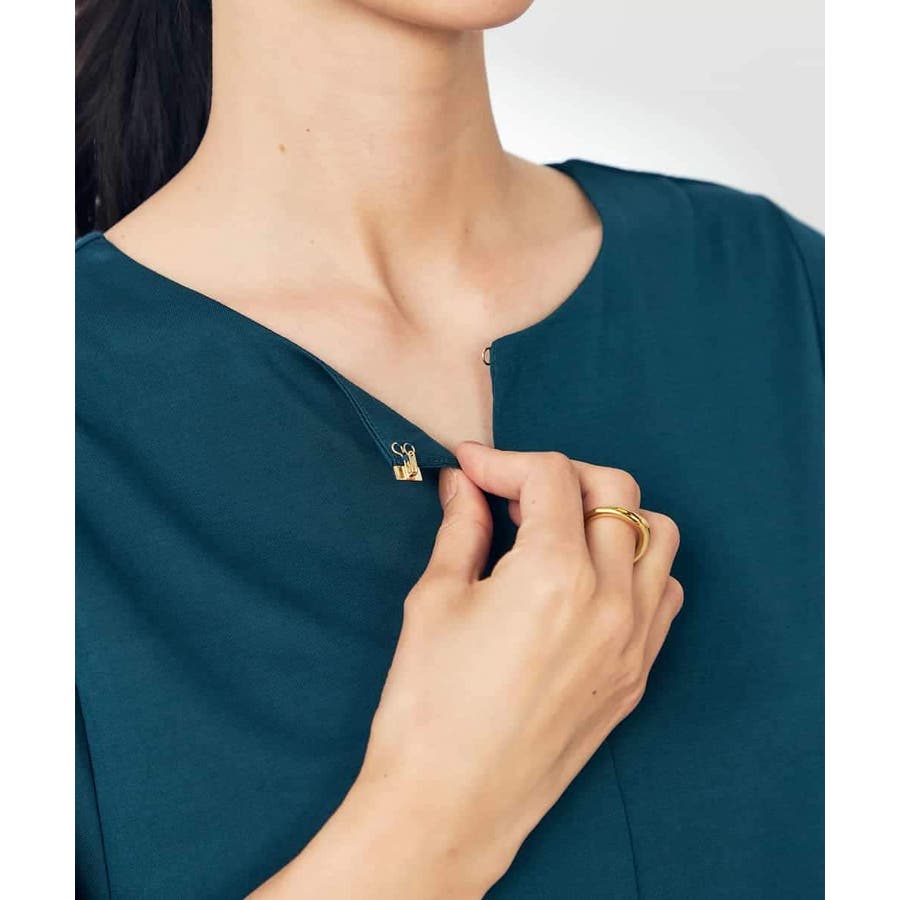 ・胸元にきらっと光るゴールドパーツが女性らしいポイント