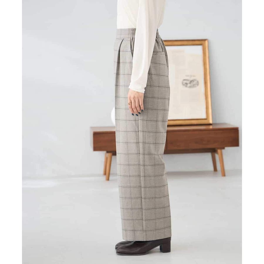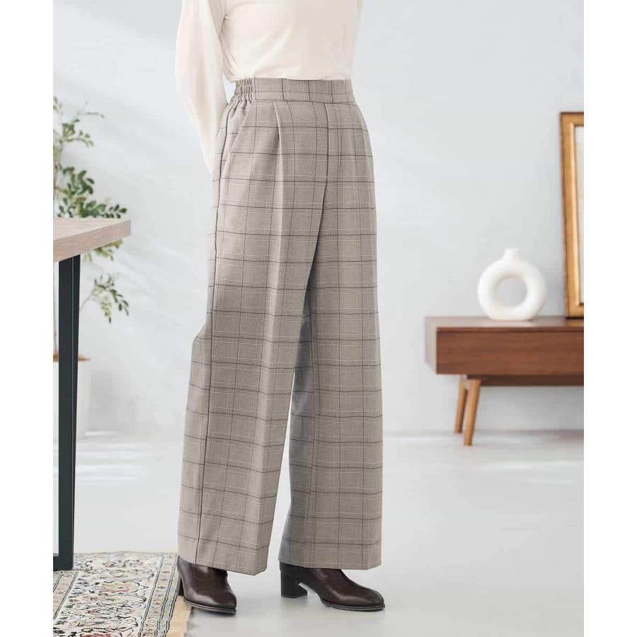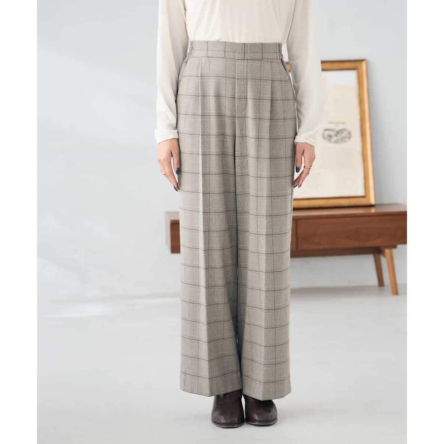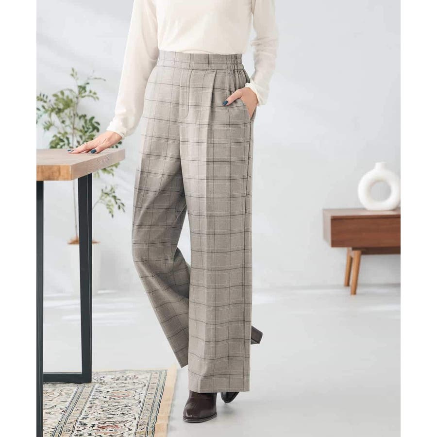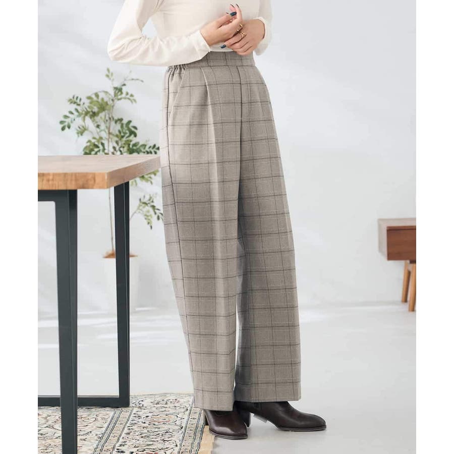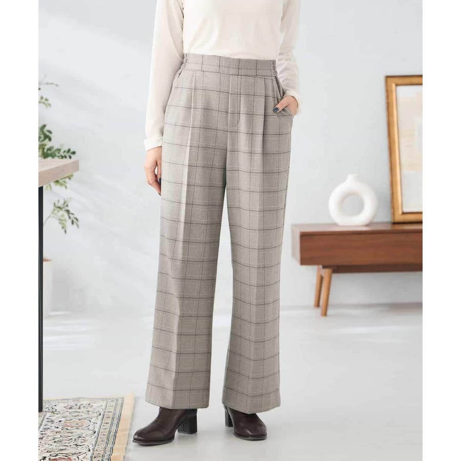 裏起毛美ラクるスッキリ見えチェックワイドパンツ