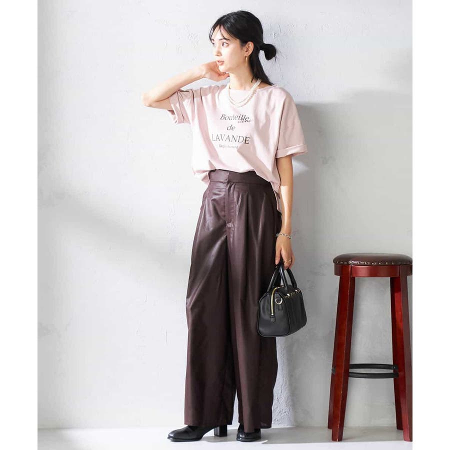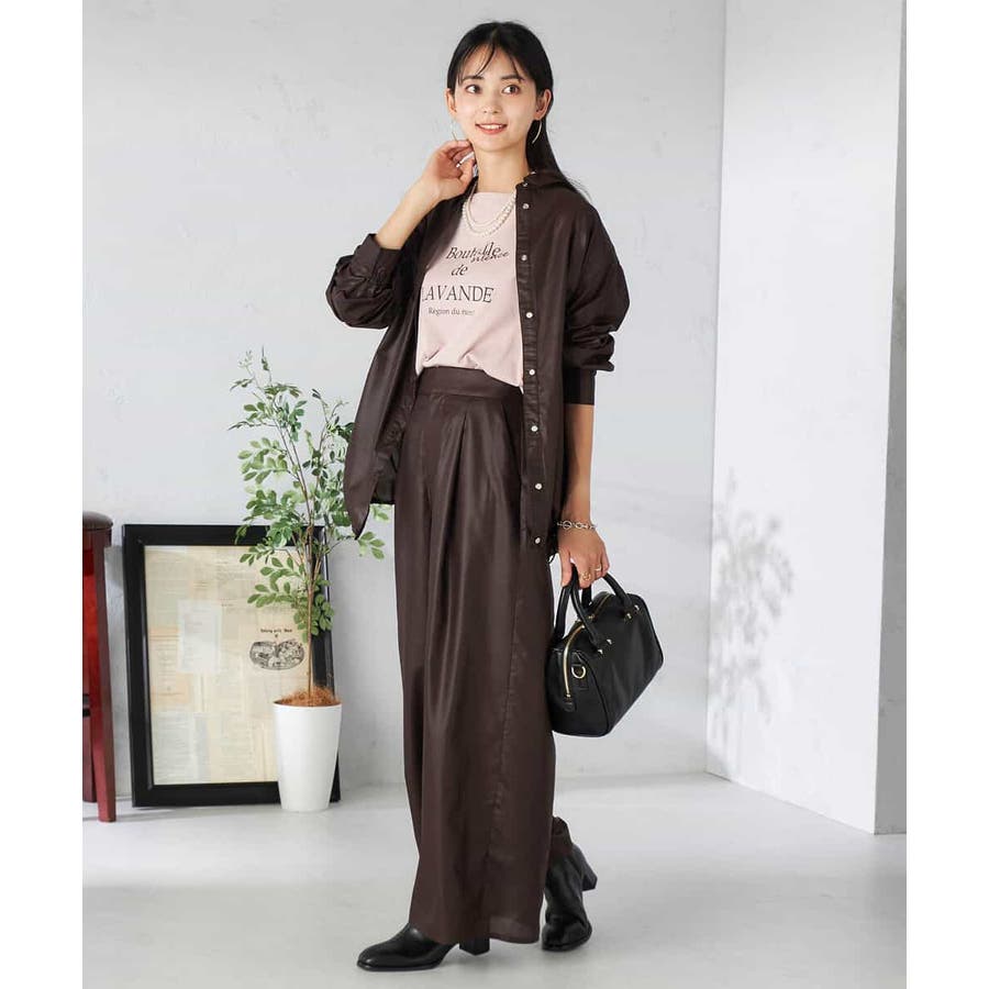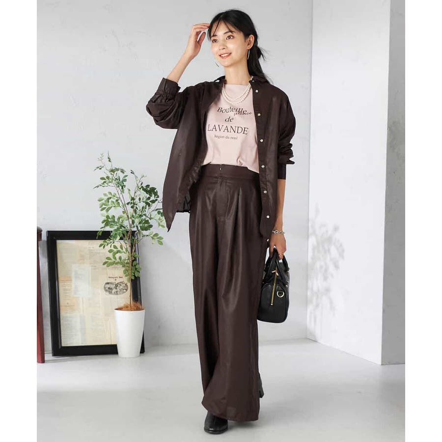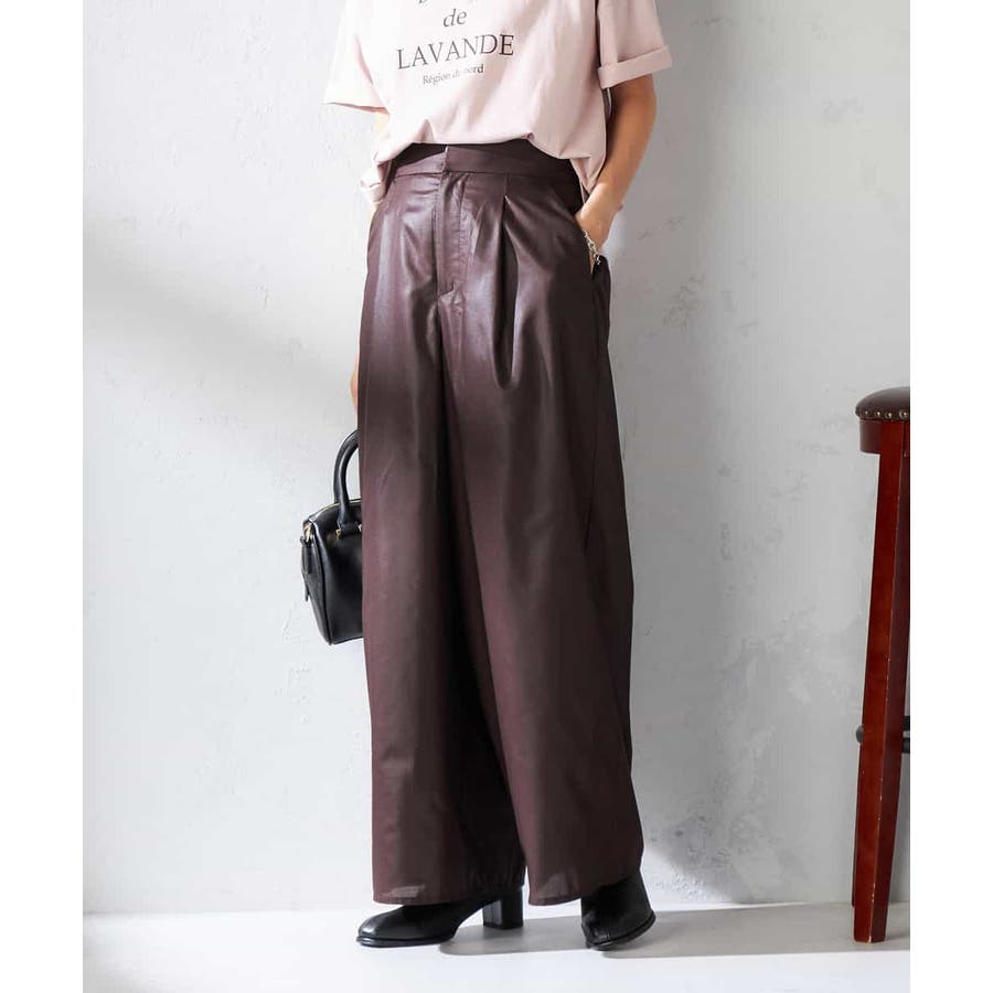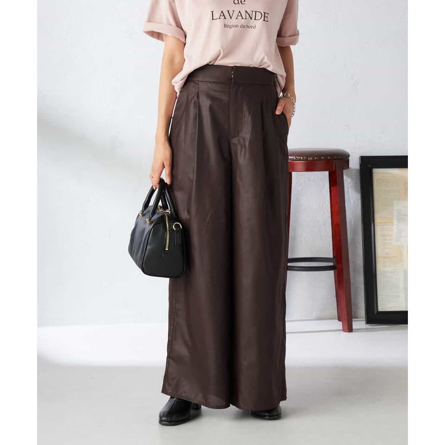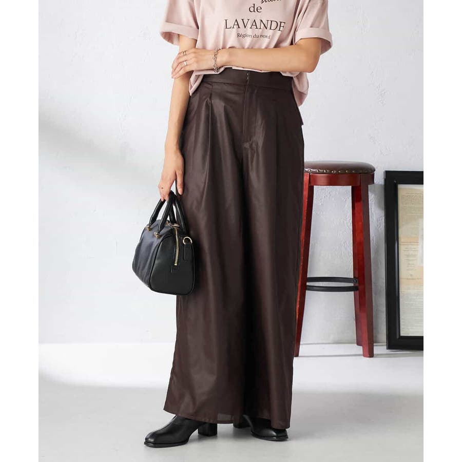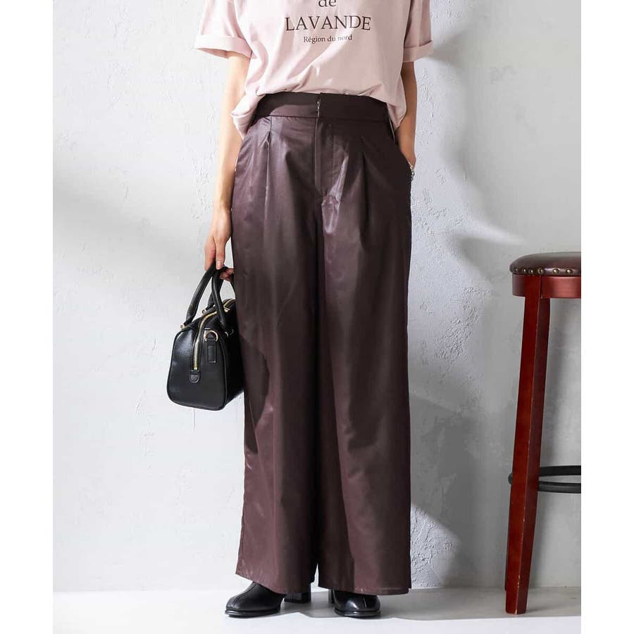 ・チンツ加工で表面に程よい光沢を施したセミシアー素材のワイドパンツ