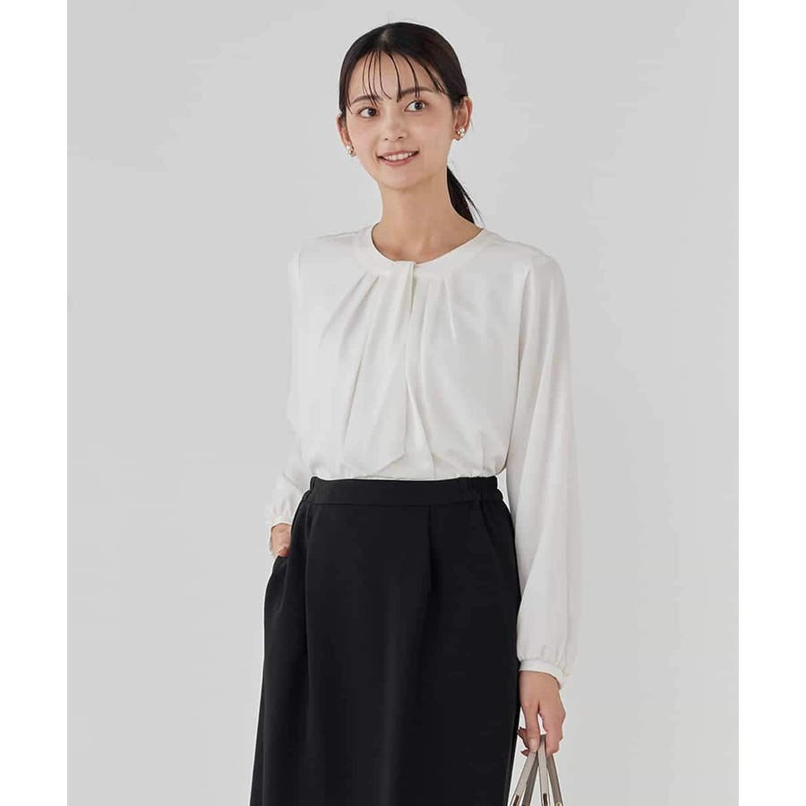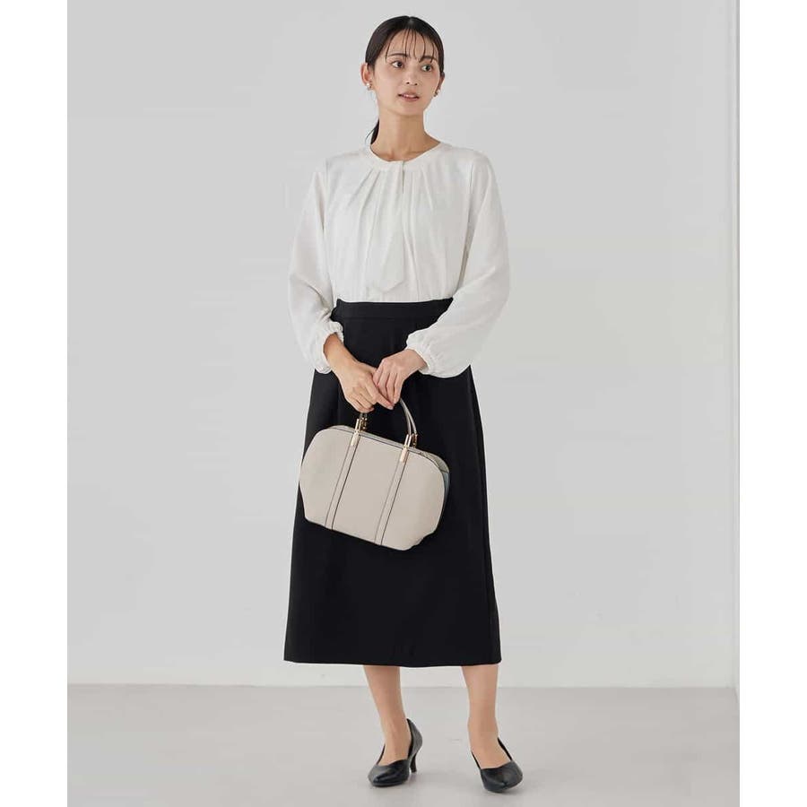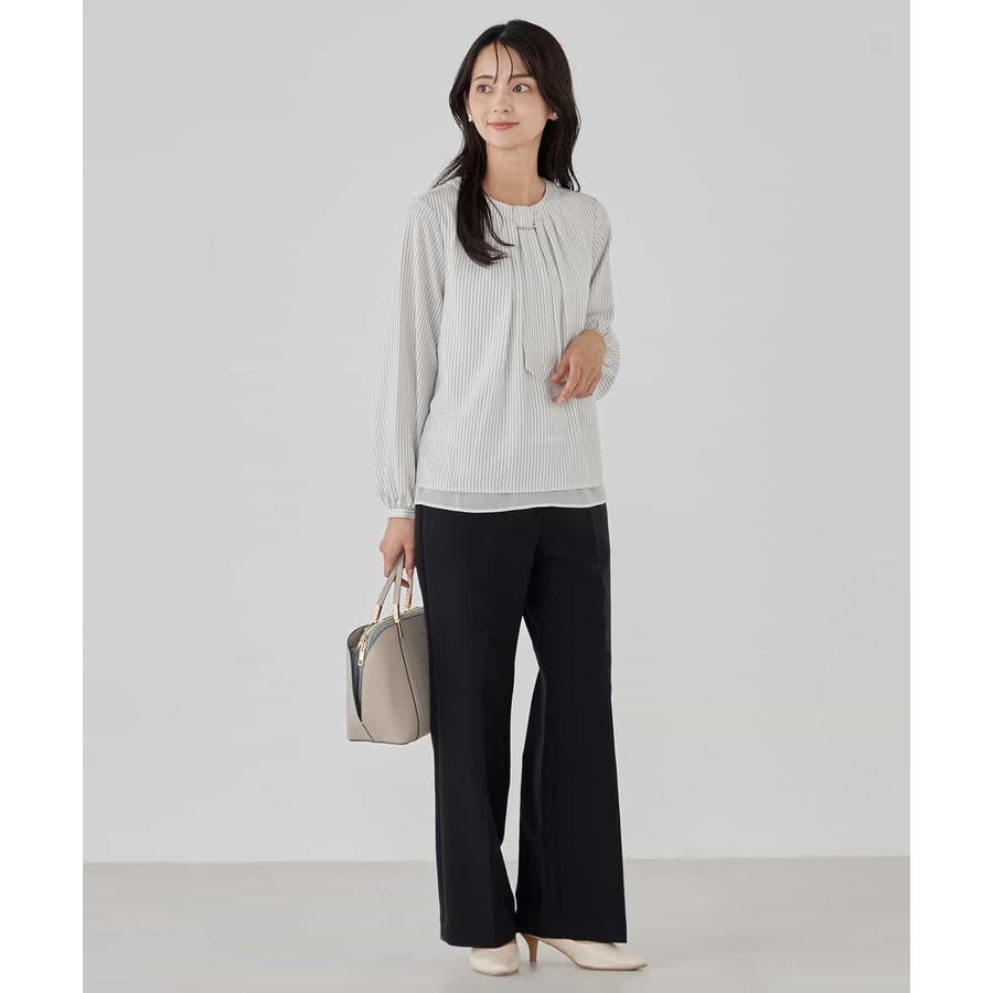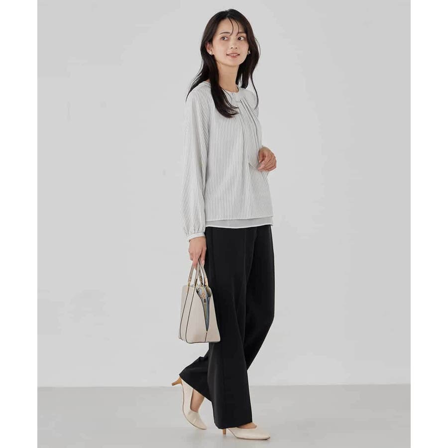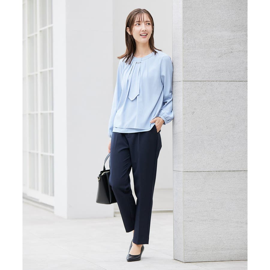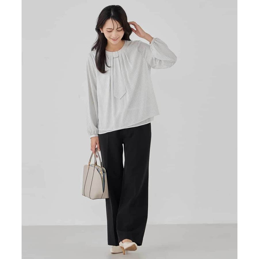 ・ボウタイは中にしまってプレーンなクルーネックブラウスに