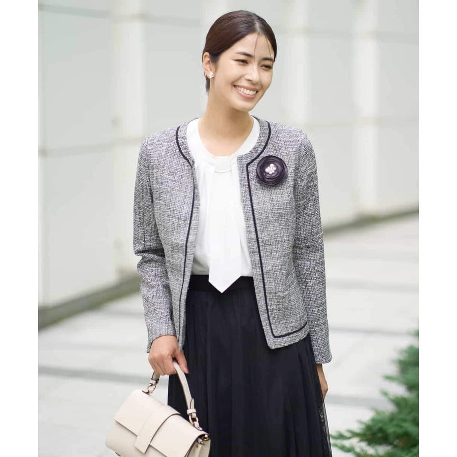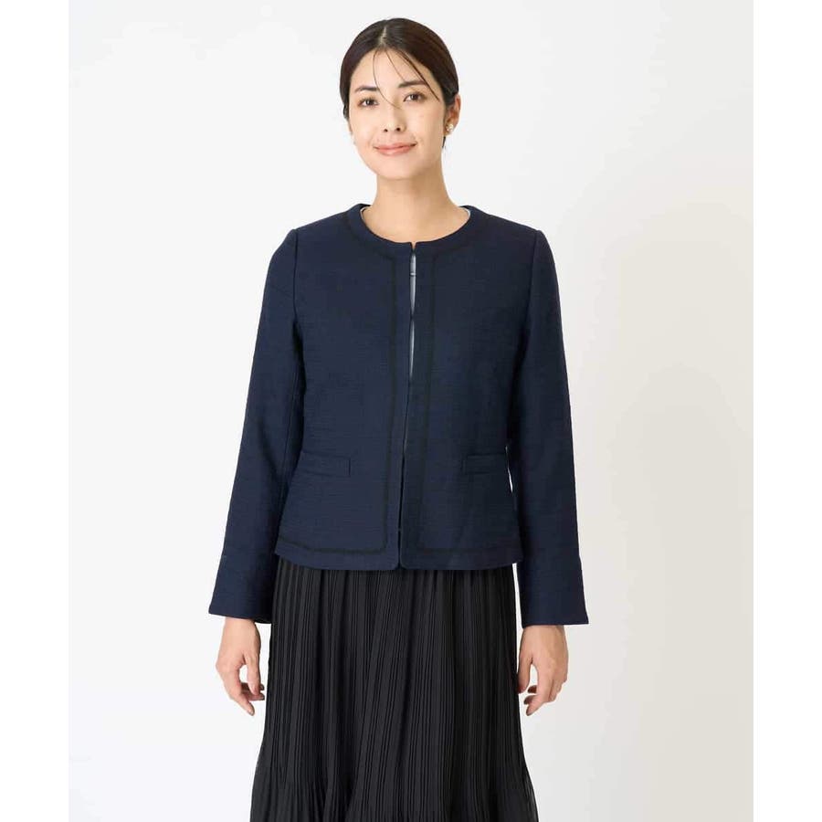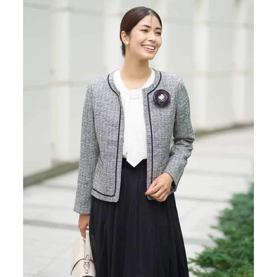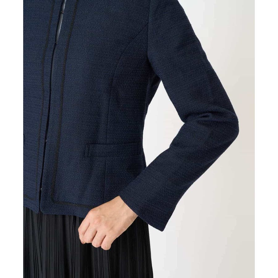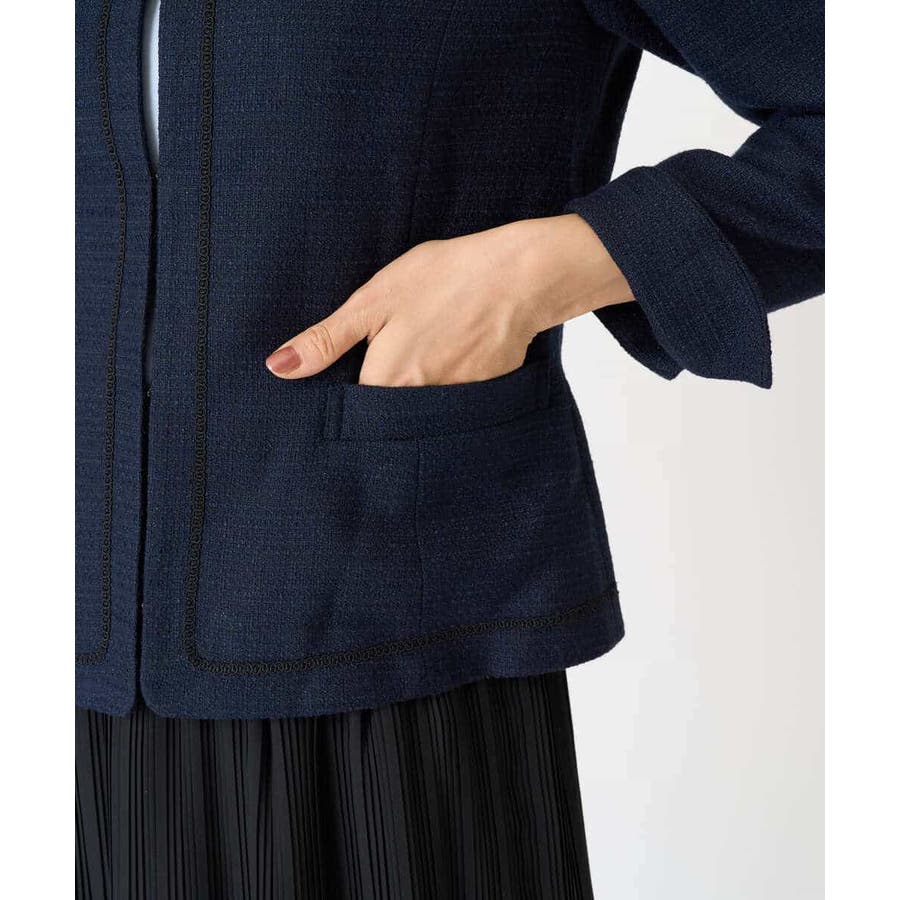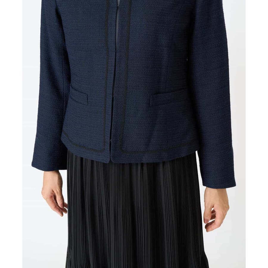・さり気ないラメが華やかなジャケットは上品なコードテープがアクセントに
