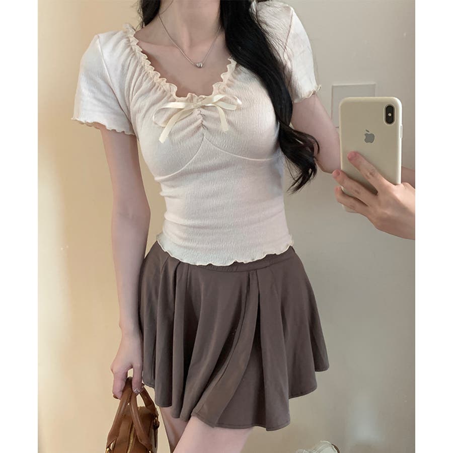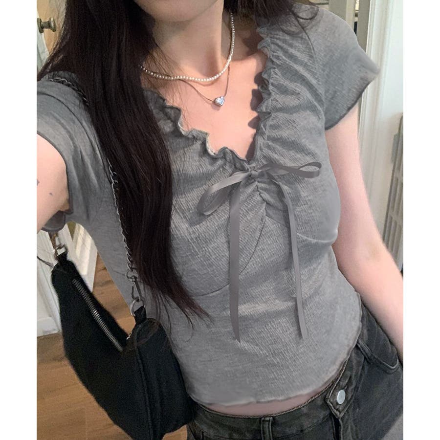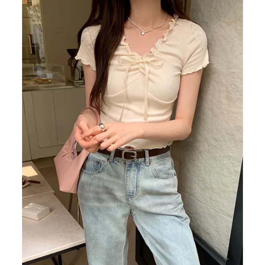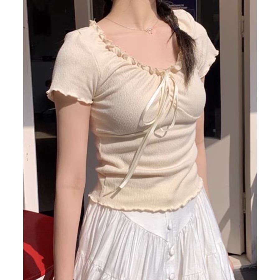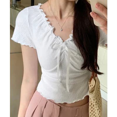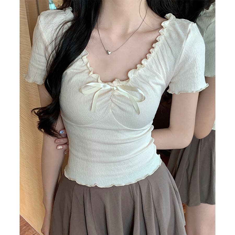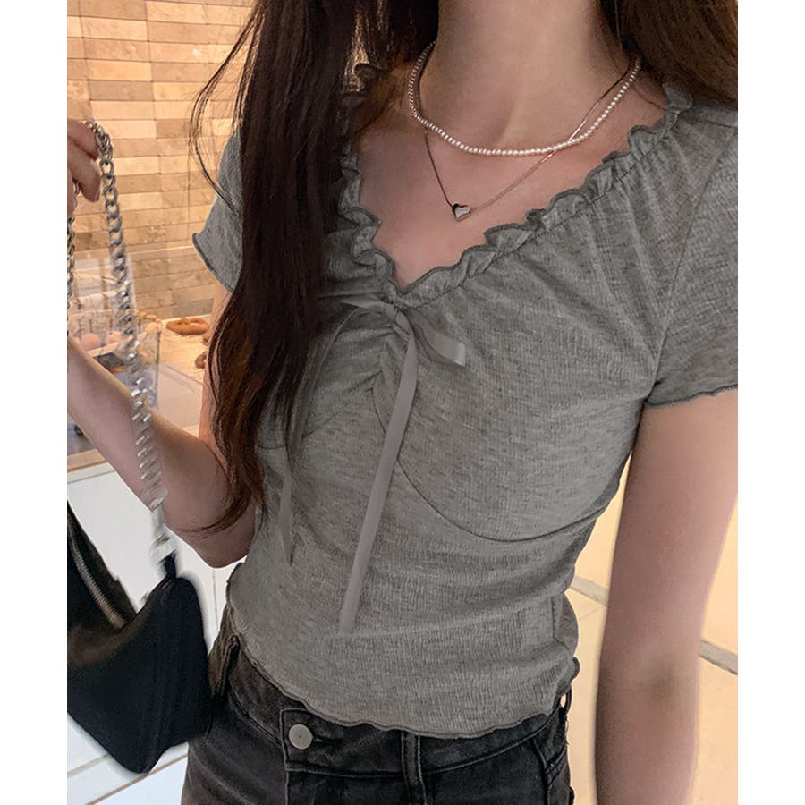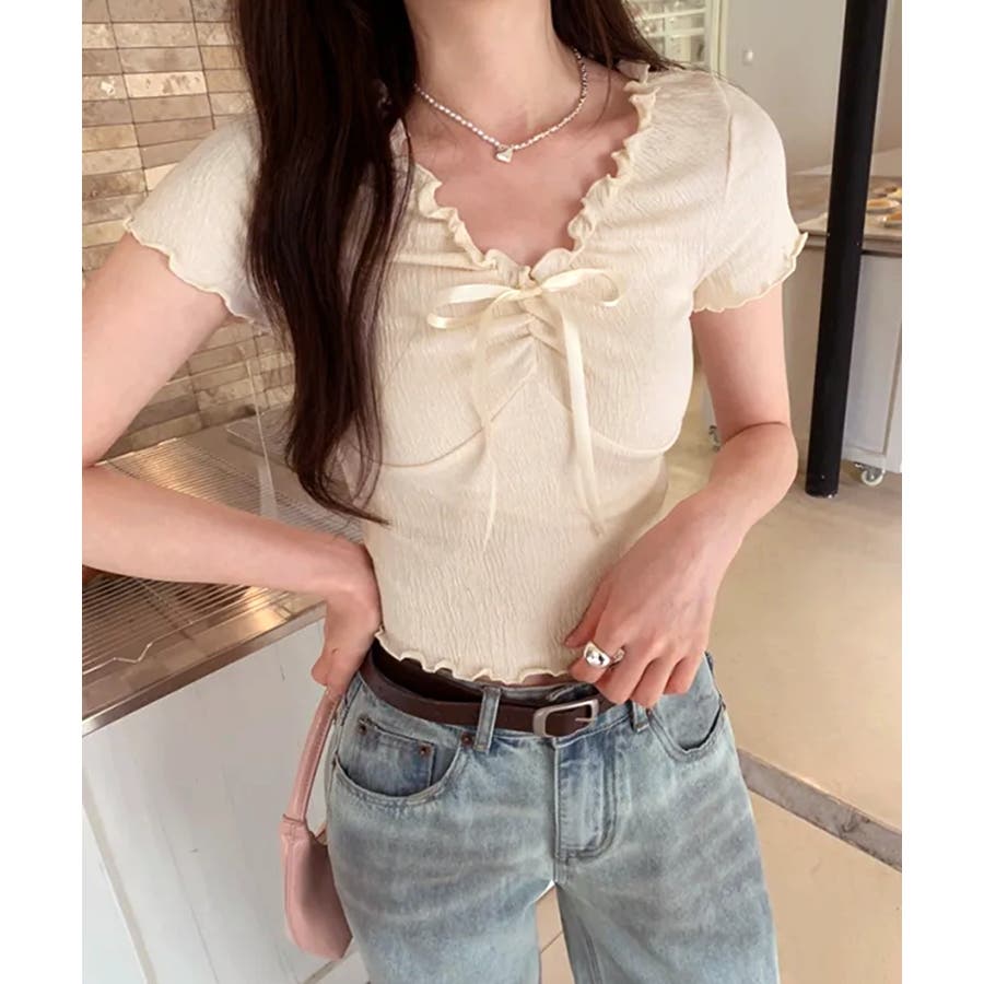 フロントのリボンとギャザーデザインがポイントの、フェミニンムード漂うコンパクトTシャツ