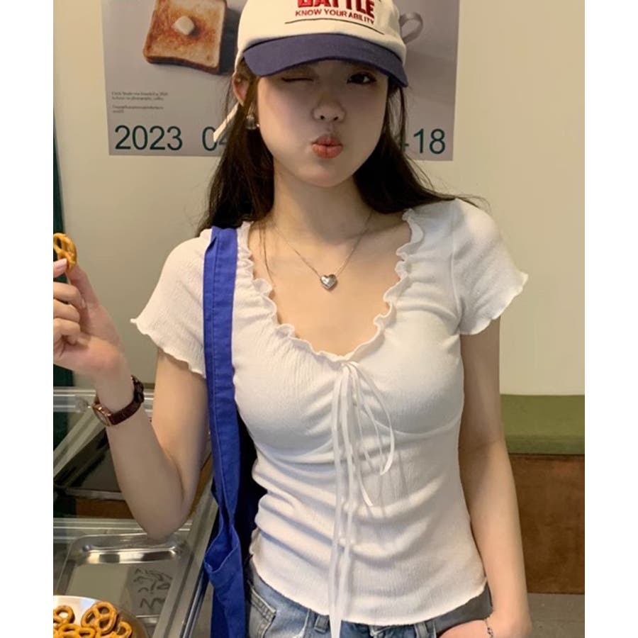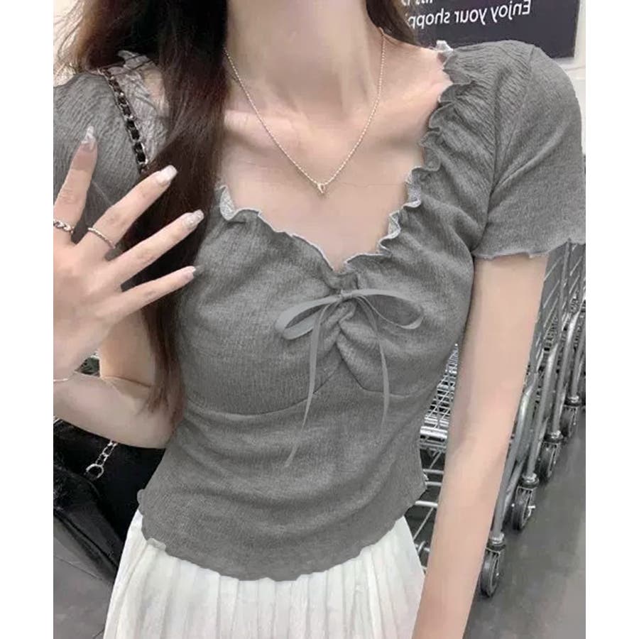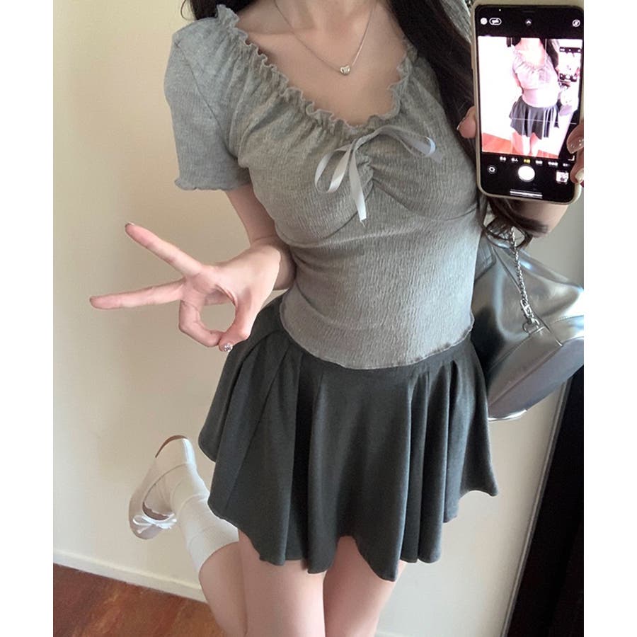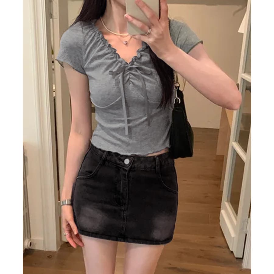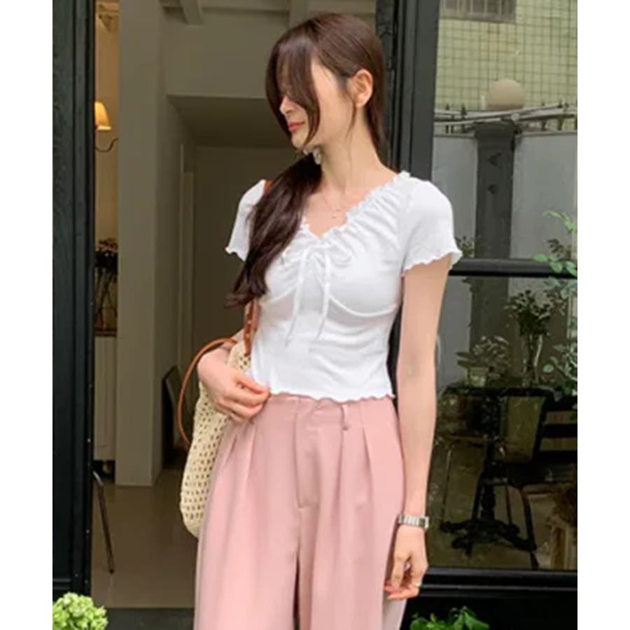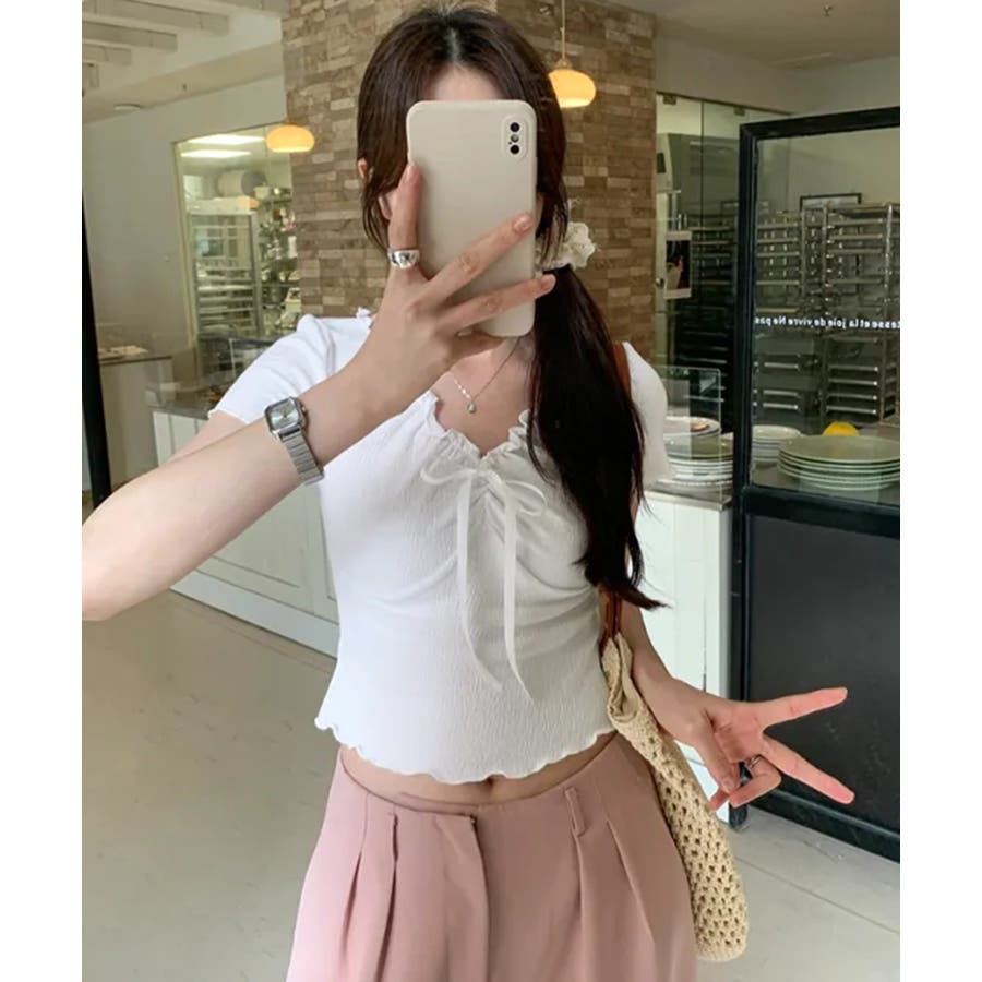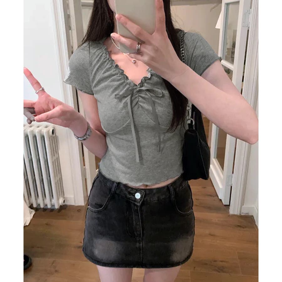 フロントリボン ギャザーデザインコンパクトTシャツ
