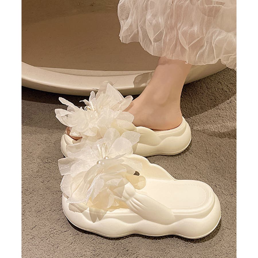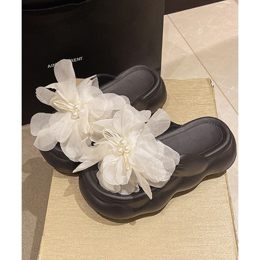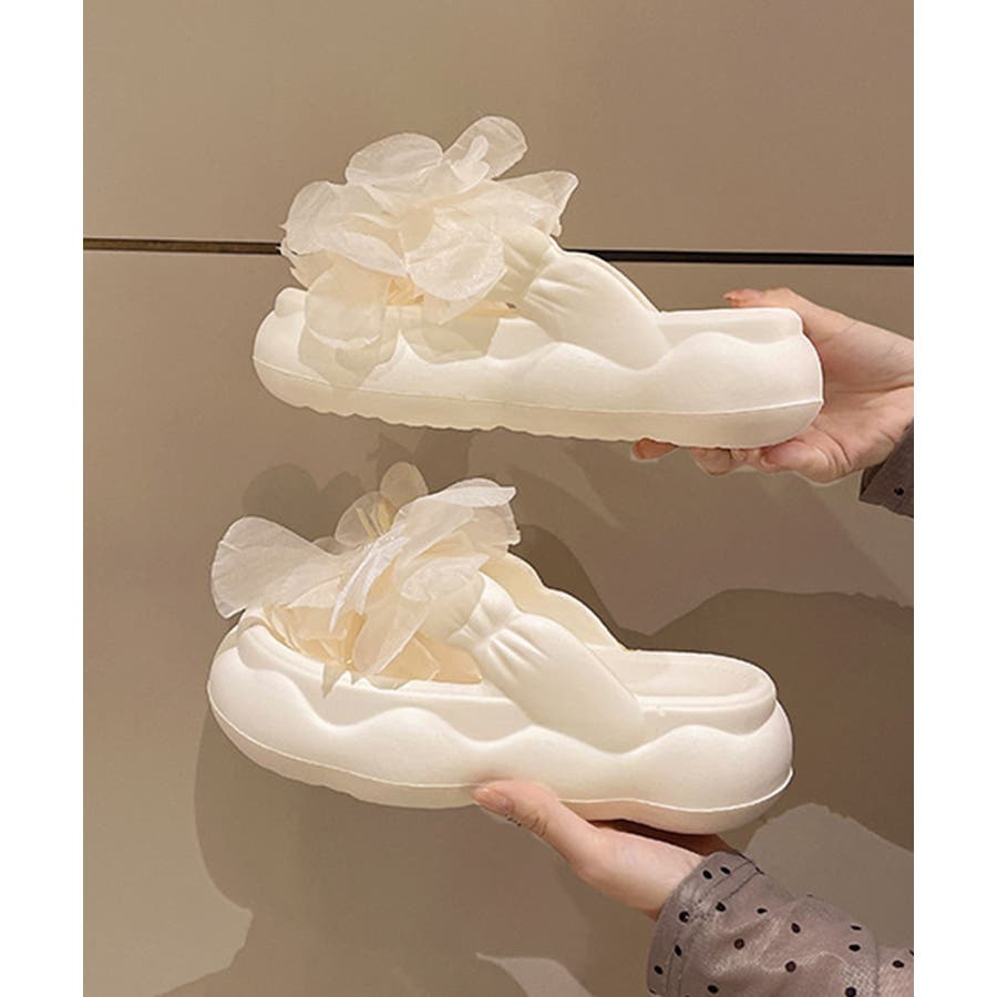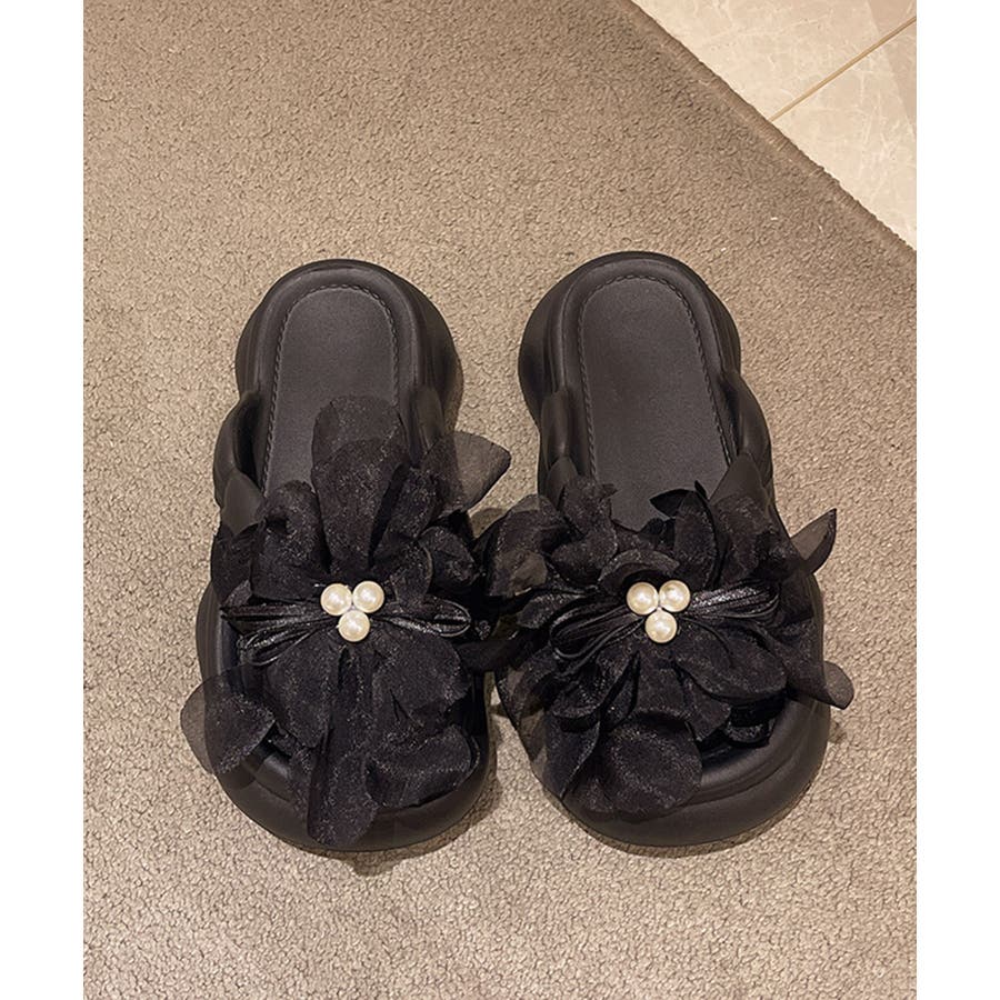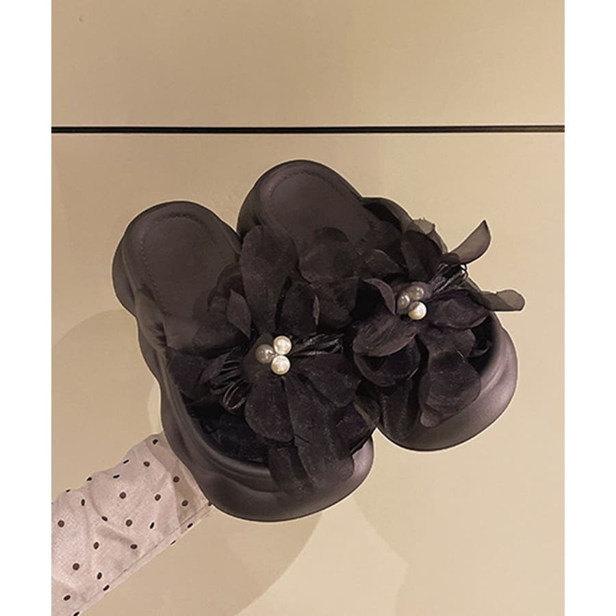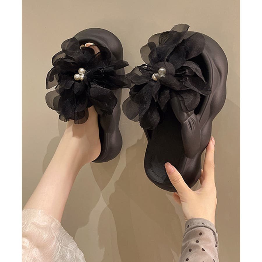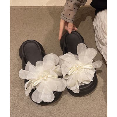 繊細なチュール素材のフラワーモチーフをあしらった、存在感たっぷりのサンダル