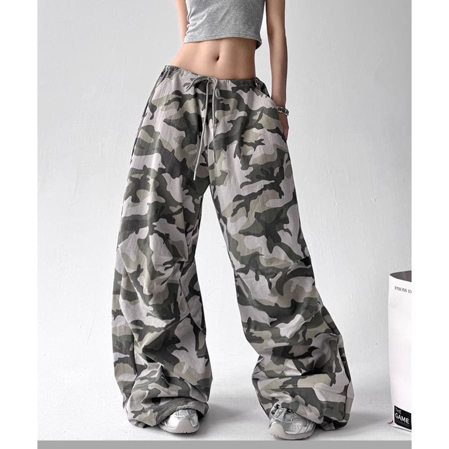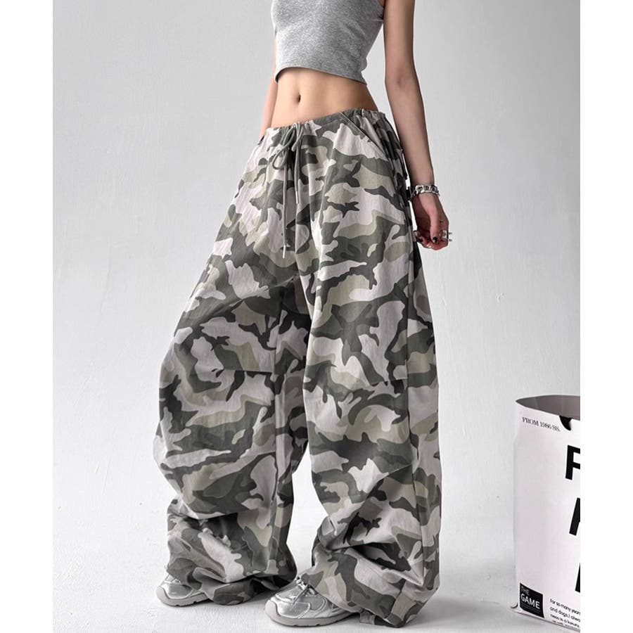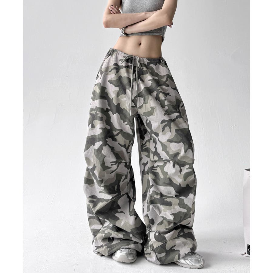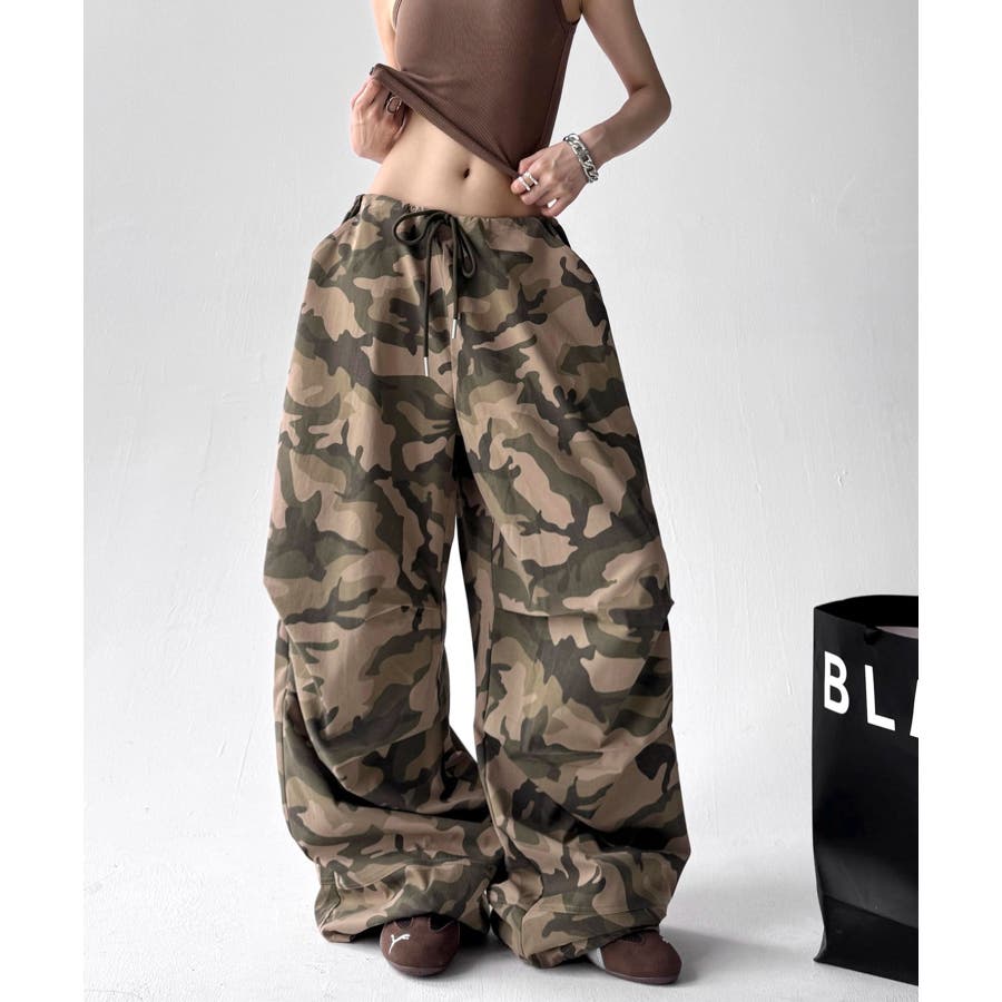 カモフラ柄が映えるドロストワイドパンツ