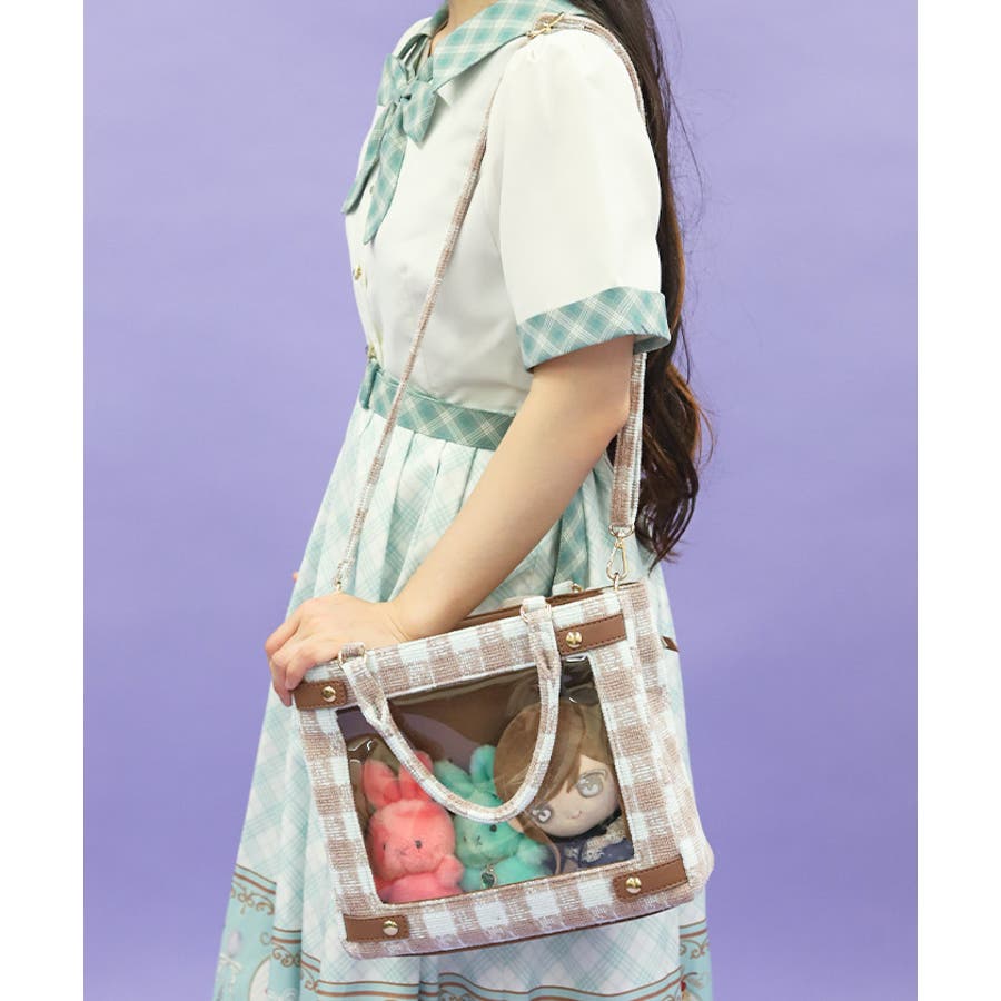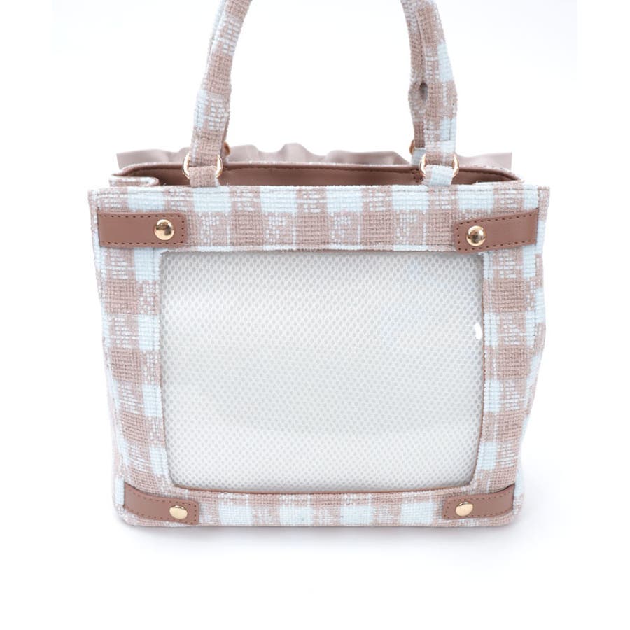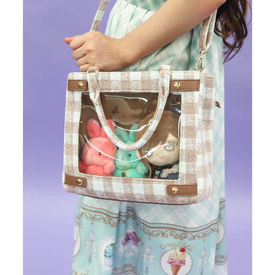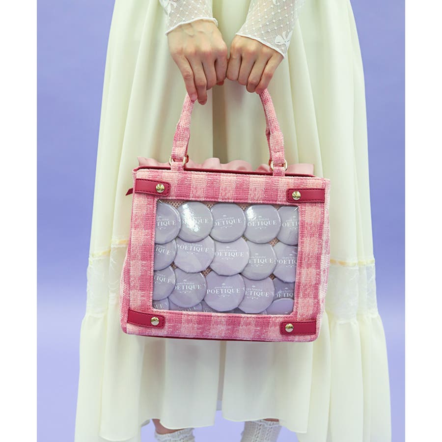 ほんのりラメが入ったツイード素材でファンシーで可愛い推し活バッグです。内側に取り外しができるクッション入りファスナーポーチがついており、アクリルスタンドフィギュアや硬いものを直接入れることができます。また、その側面にポケットも付いているのアクスタの台座を入れることもできます。背面のシートを取り外すとクリアビニールの窓がついており、缶バッチ用シートはマジックテープで取り外しができます。また、缶バッジシートを外すとマチがあるぬいぐるみを入れることができます。中に仕切りがあるので荷物とぬいぐるみが混じることはありません。