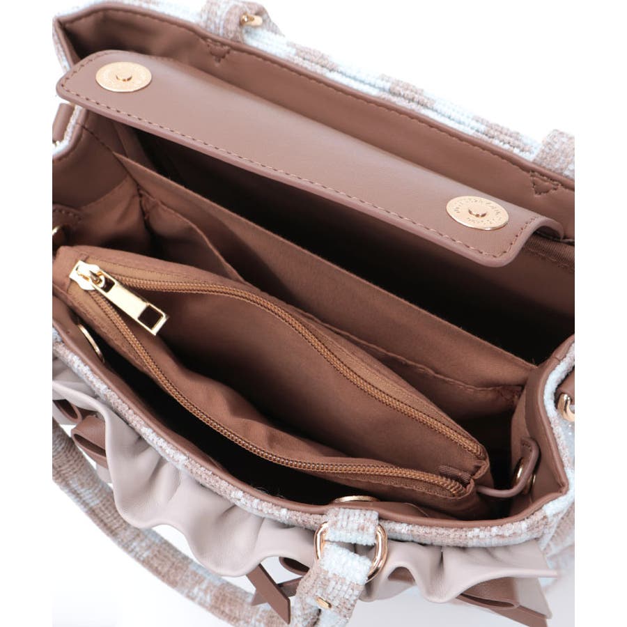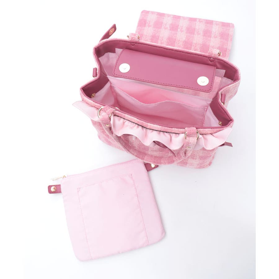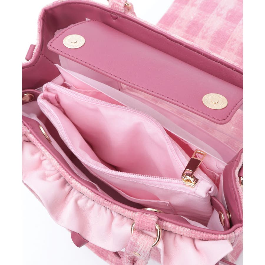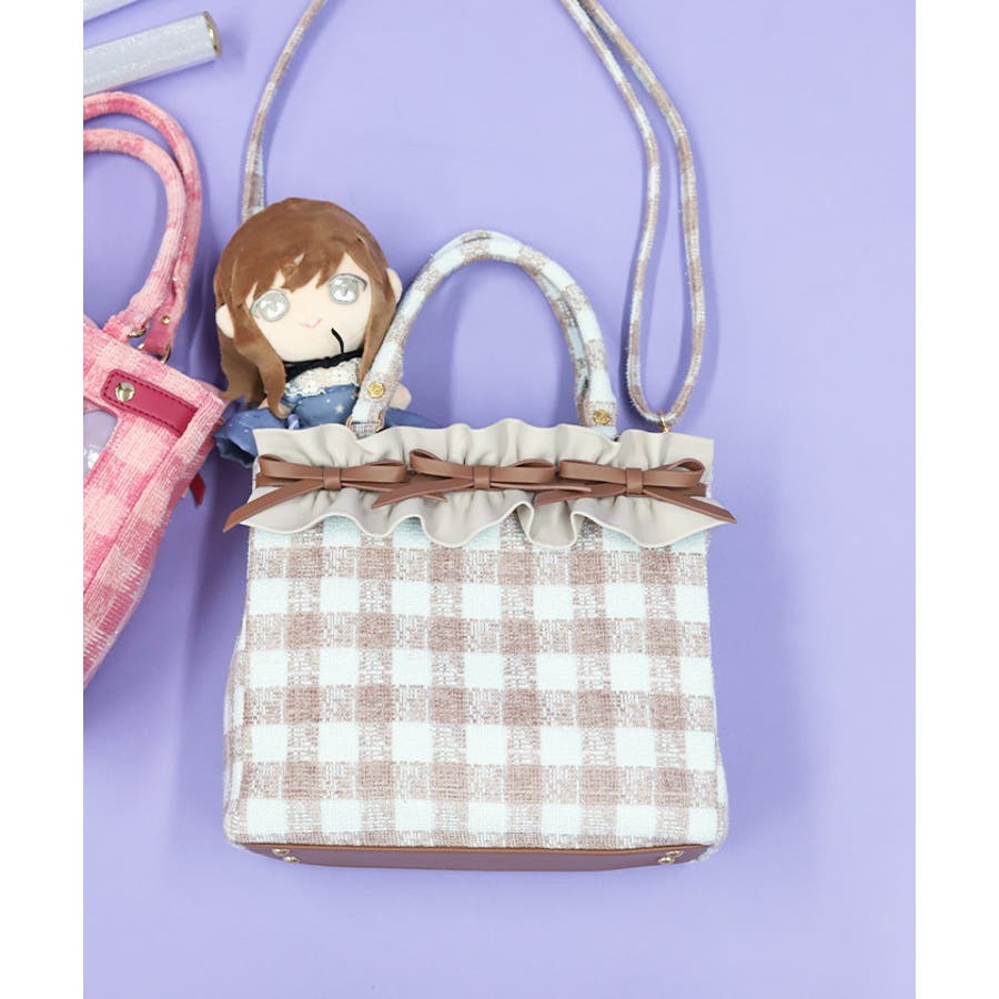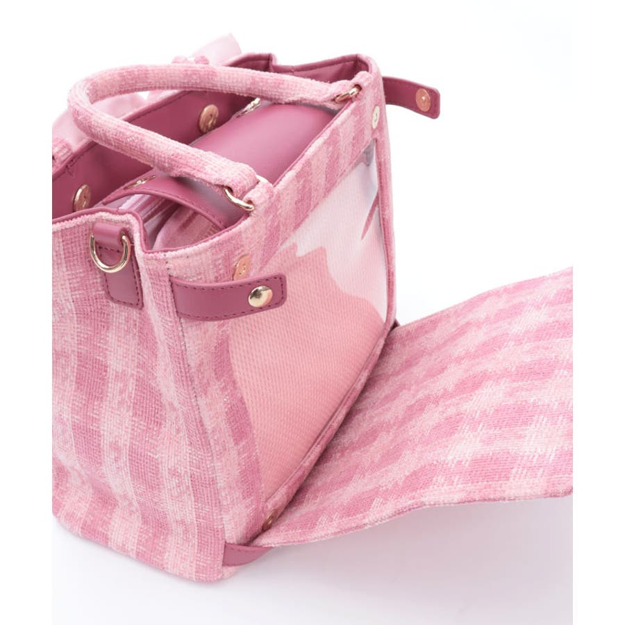 ほんのりラメが入ったツイード素材でファンシーで可愛い推し活バッグです。内側に取り外しができるクッション入りファスナーポーチがついており、アクリルスタンドフィギュアや硬いものを直接入れることができます。また、その側面にポケットも付いているのアクスタの台座を入れることもできます。背面のシートを取り外すとクリアビニールの窓がついており、缶バッチ用シートはマジックテープで取り外しができます。また、缶バッジシートを外すとマチがあるぬいぐるみを入れることができます。中に仕切りがあるので荷物とぬいぐるみが混じることはありません。