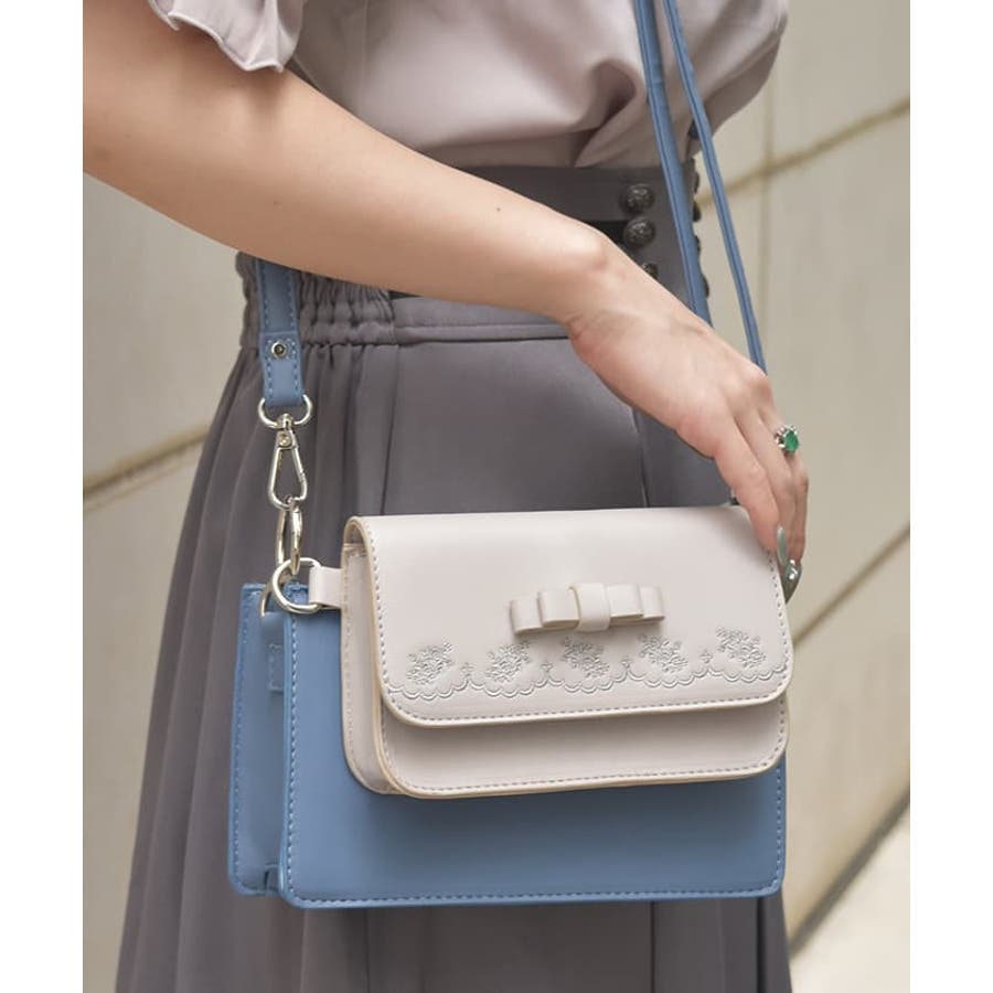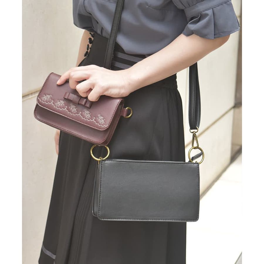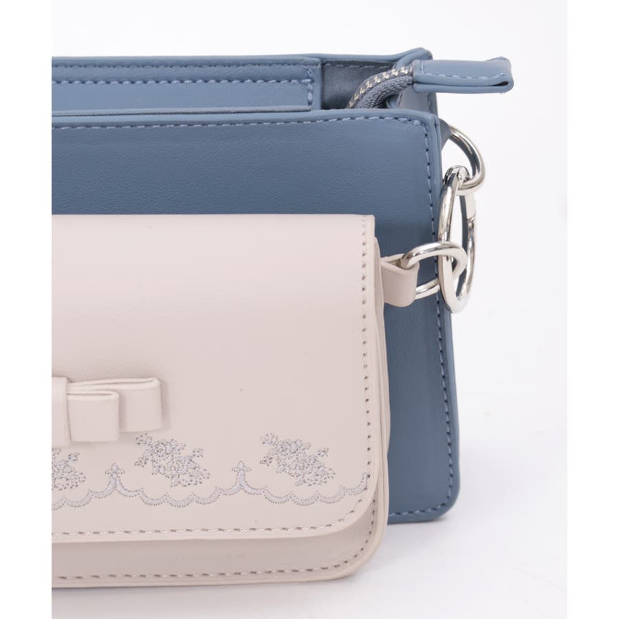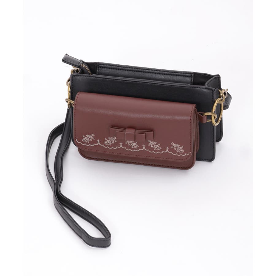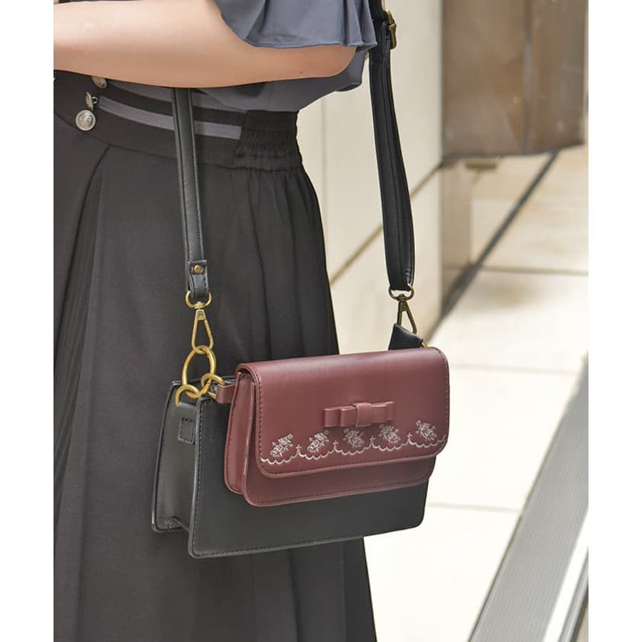 刺繍が上品なフラップバッグと、シンプルなファスナーバッグを組み合わせたデザイン。