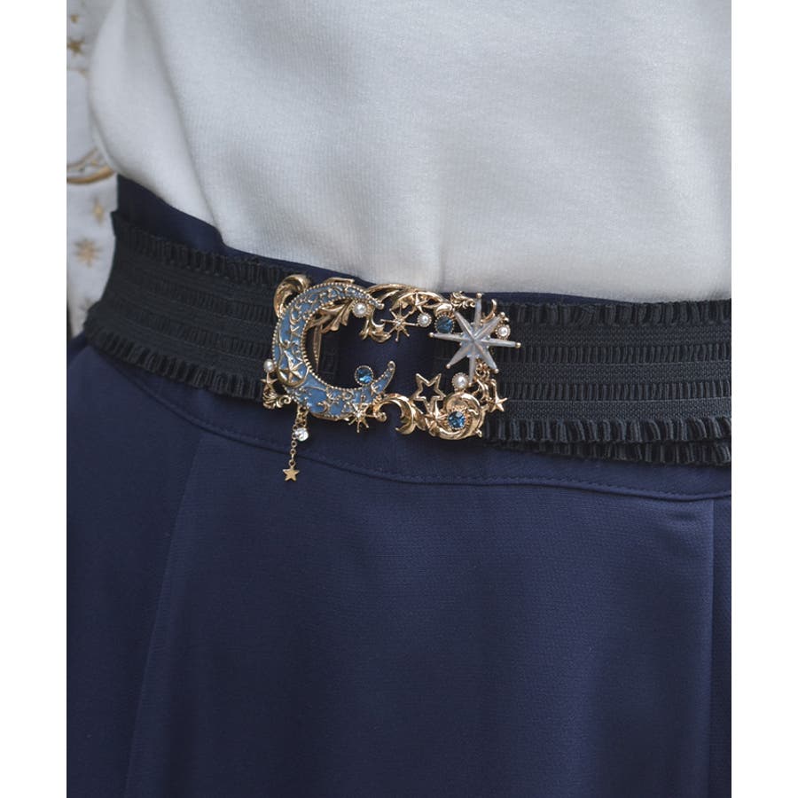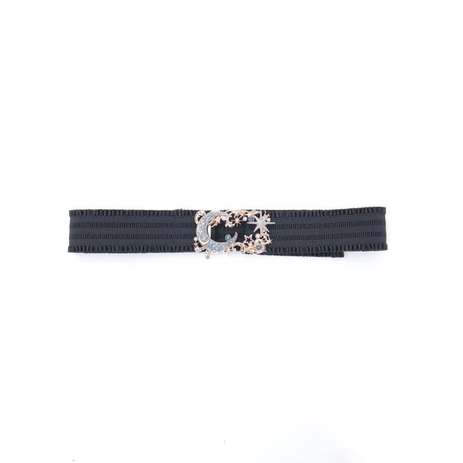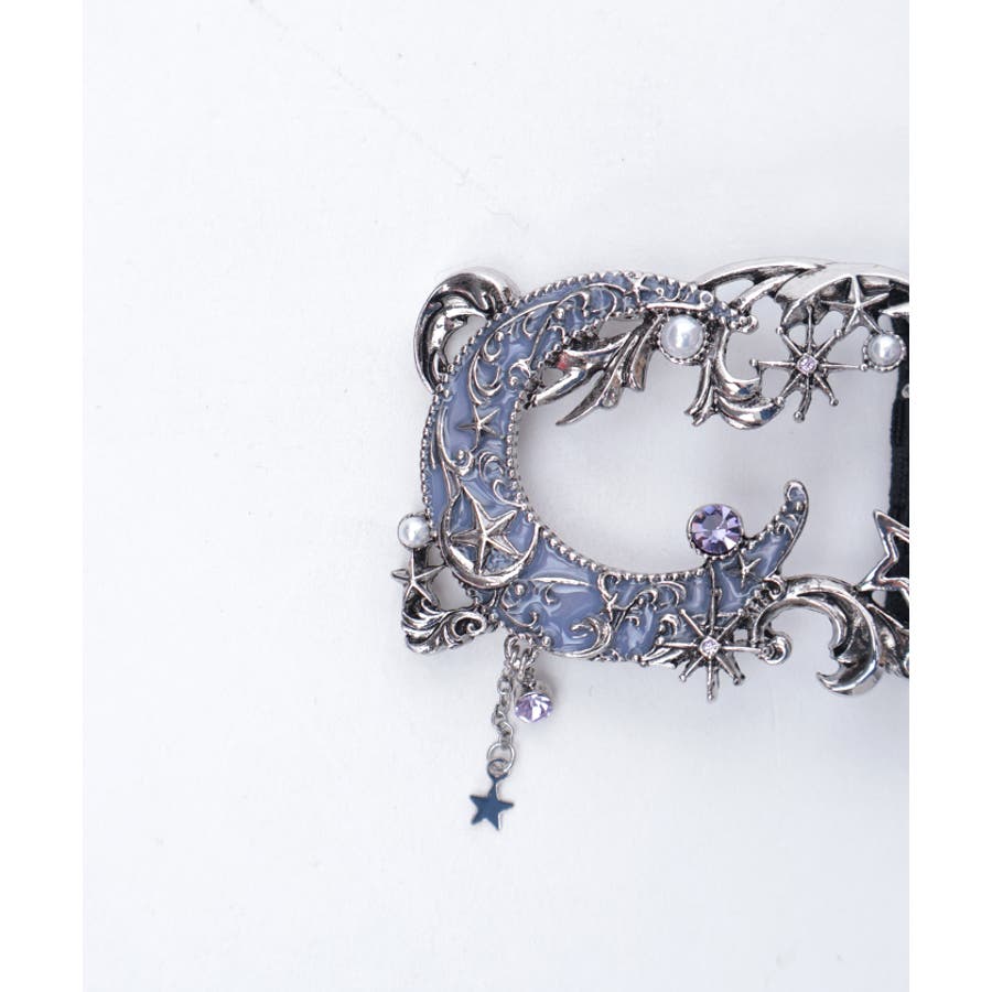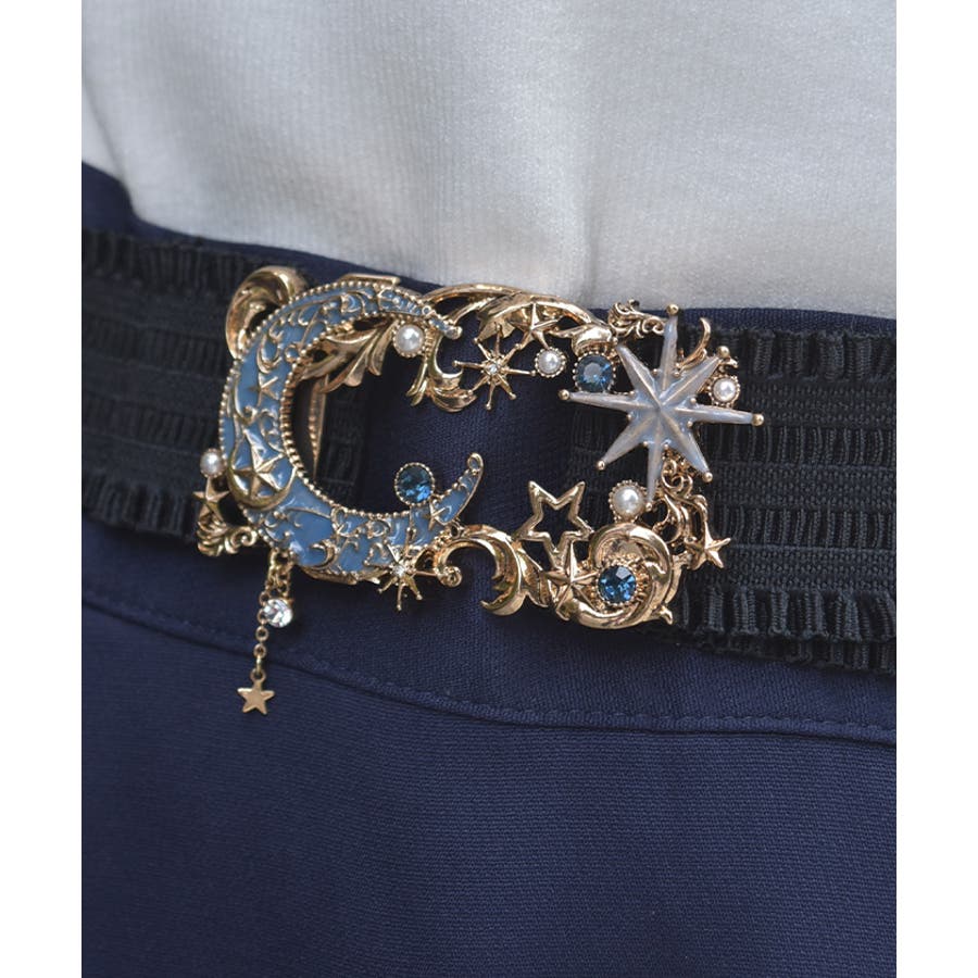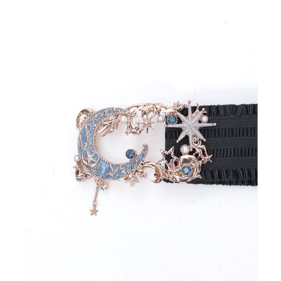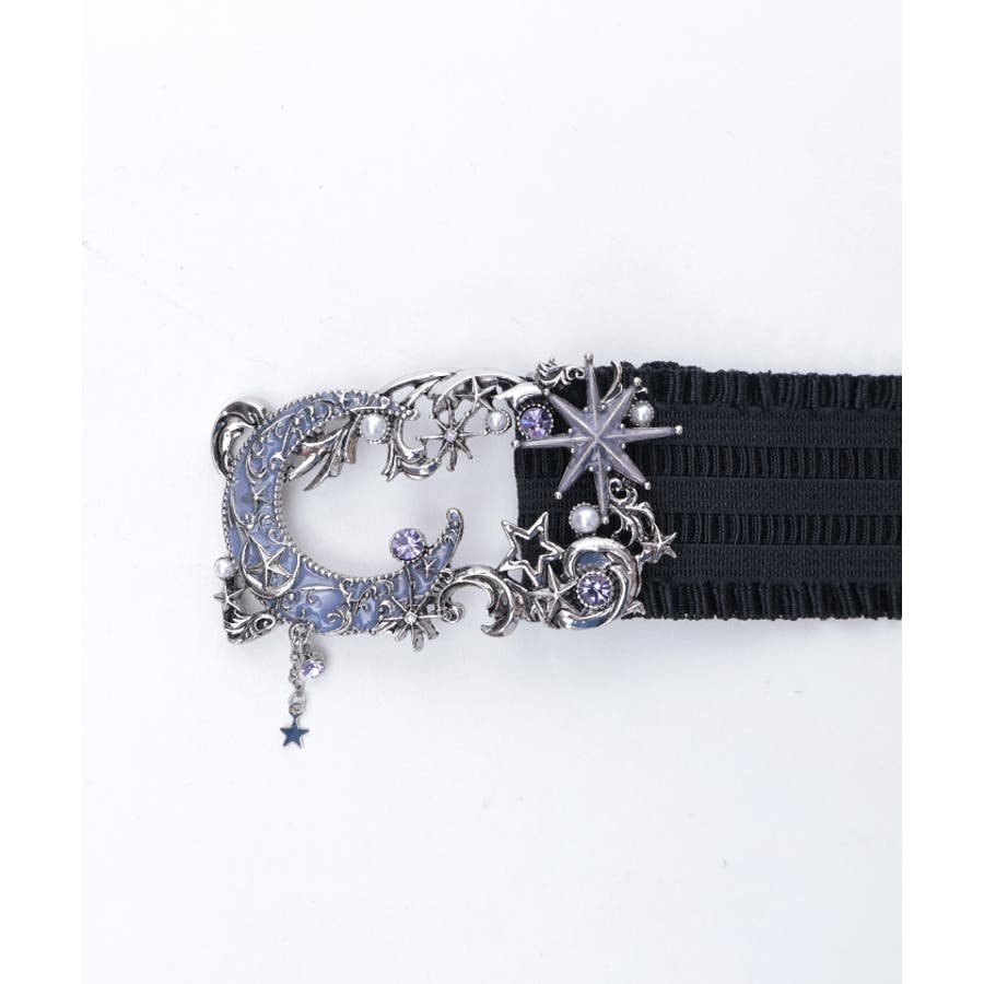 月モチーフに繊細な装飾を組み合わせ、星やパールを散らした華やかなバックル。