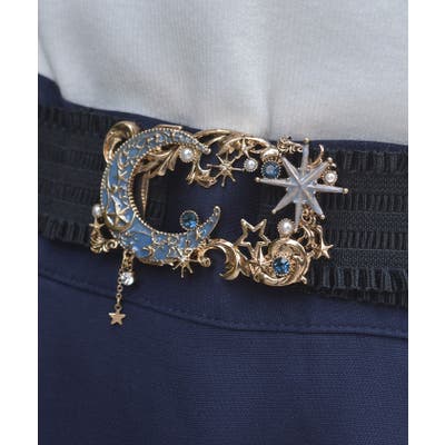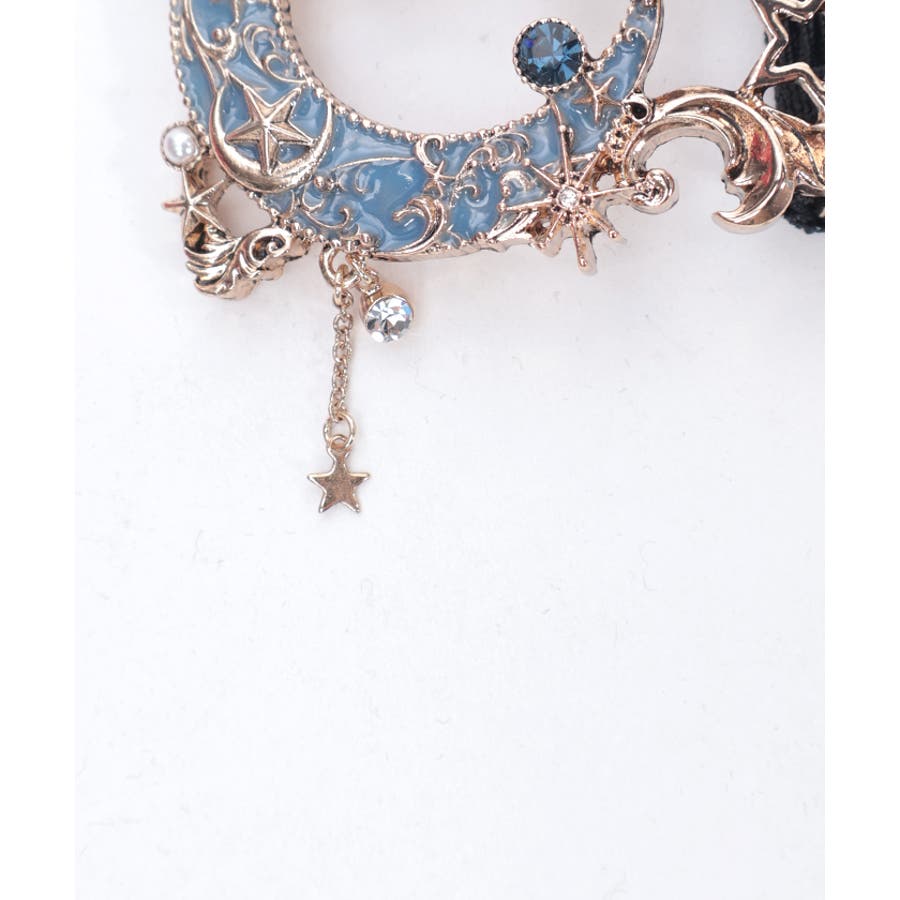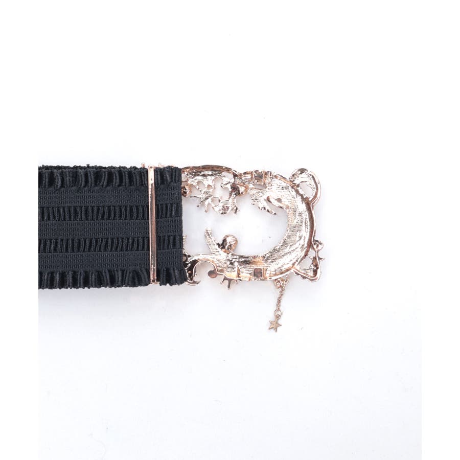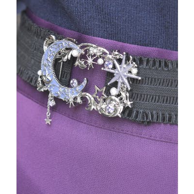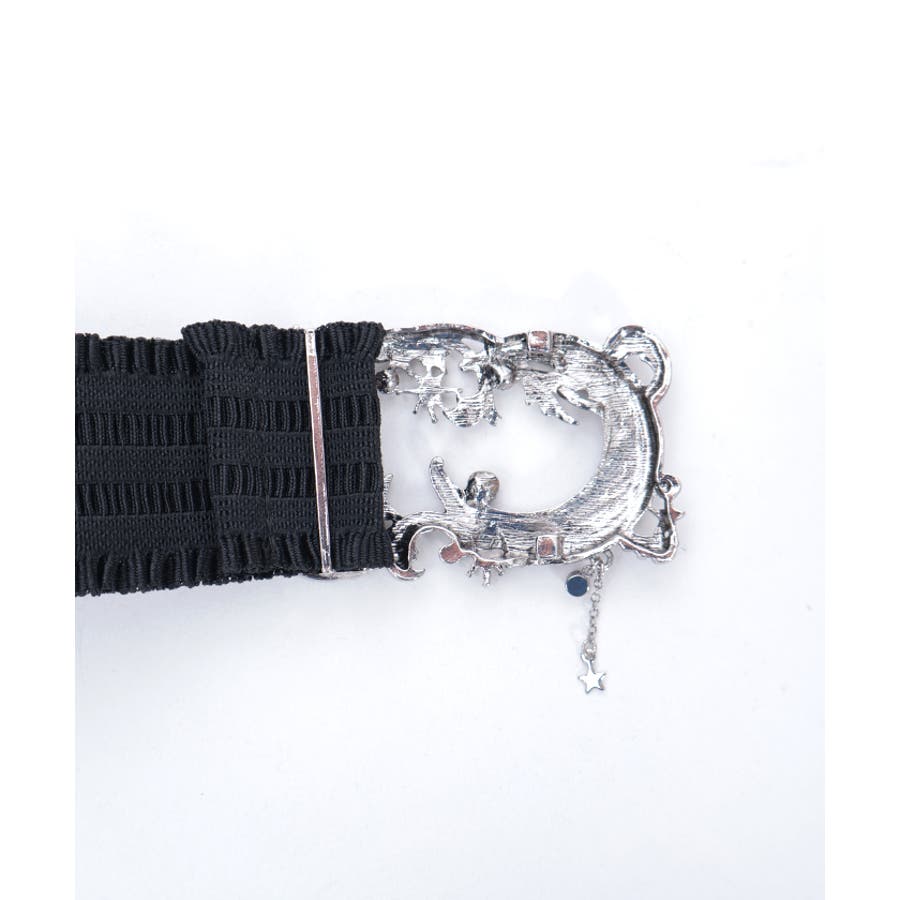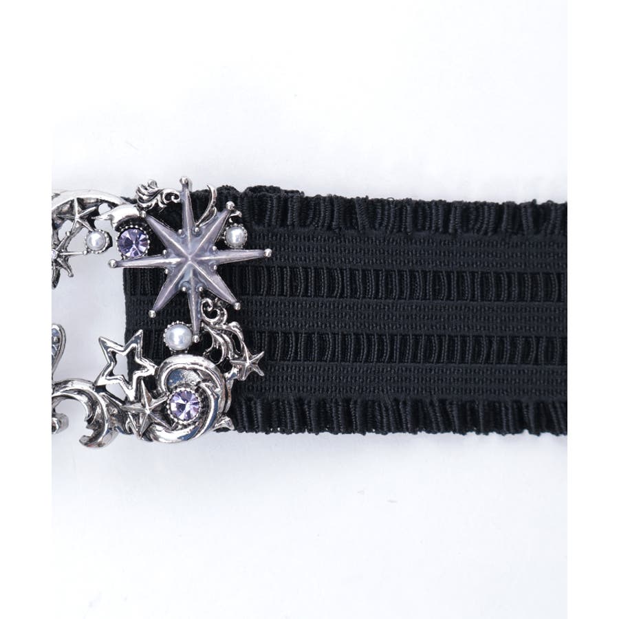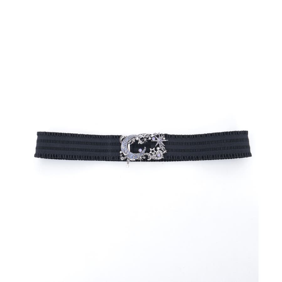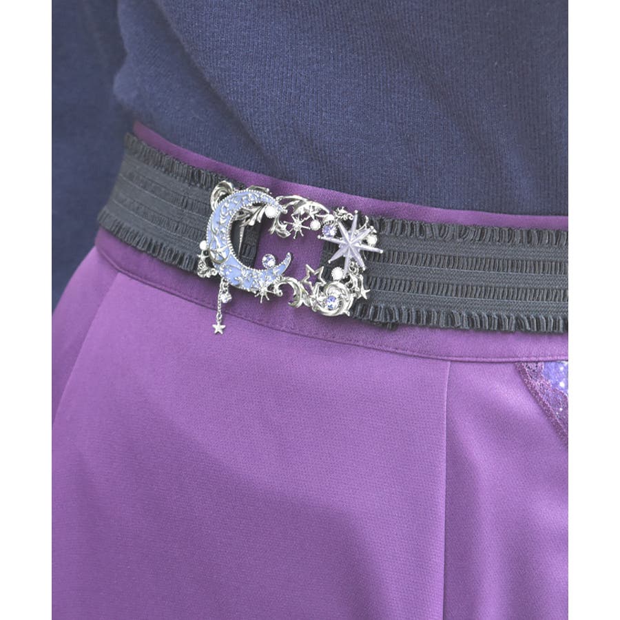月モチーフに繊細な装飾を組み合わせ、星やパールを散らした華やかなバックル。