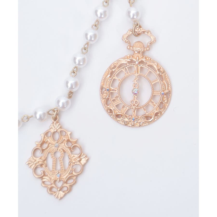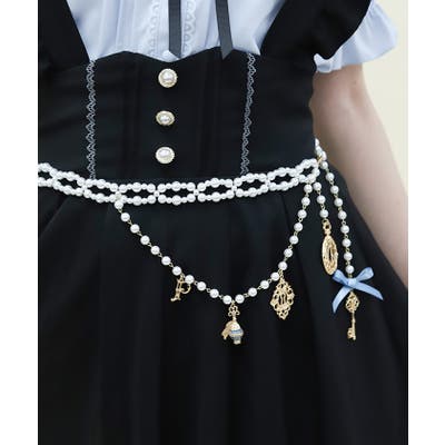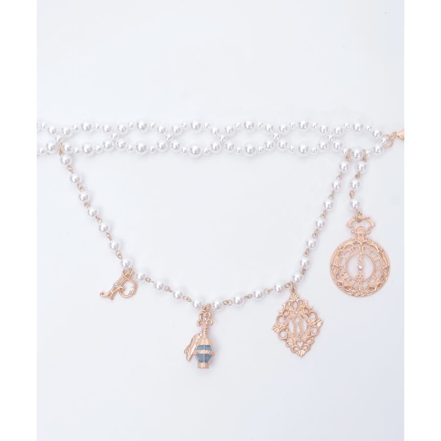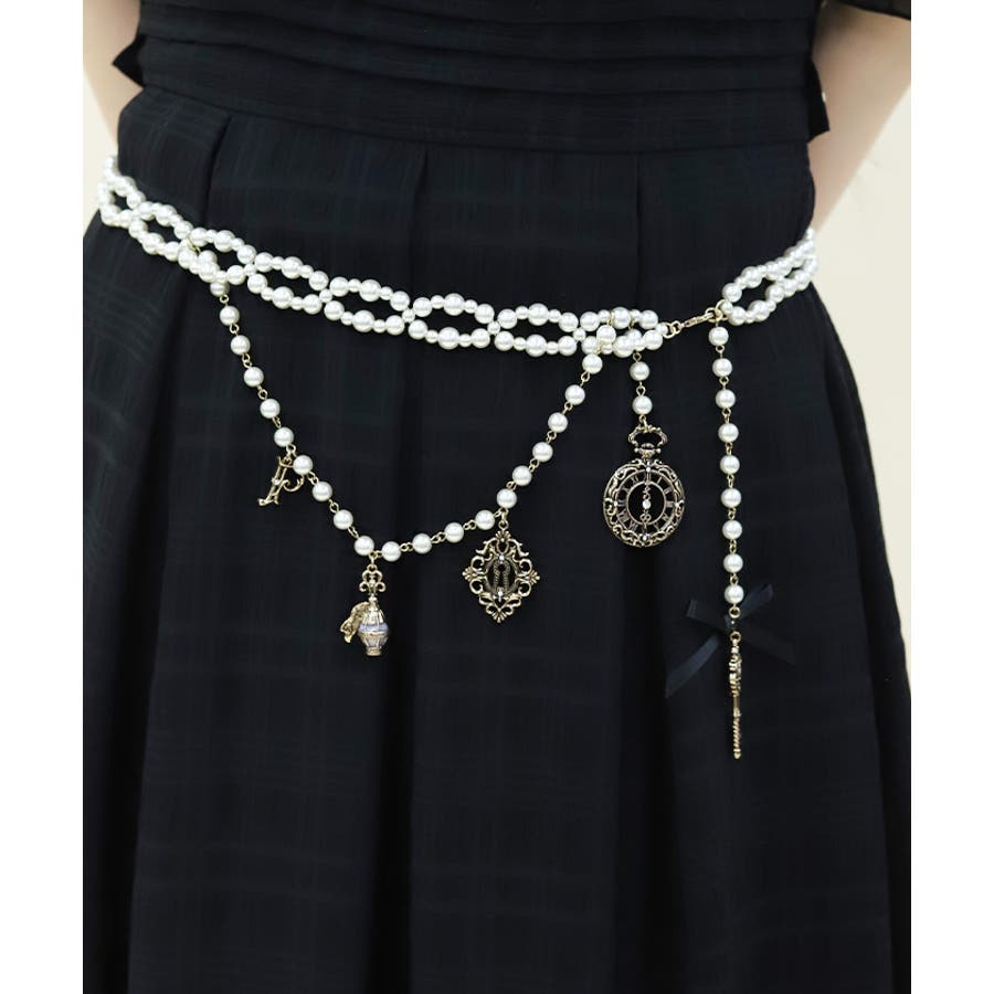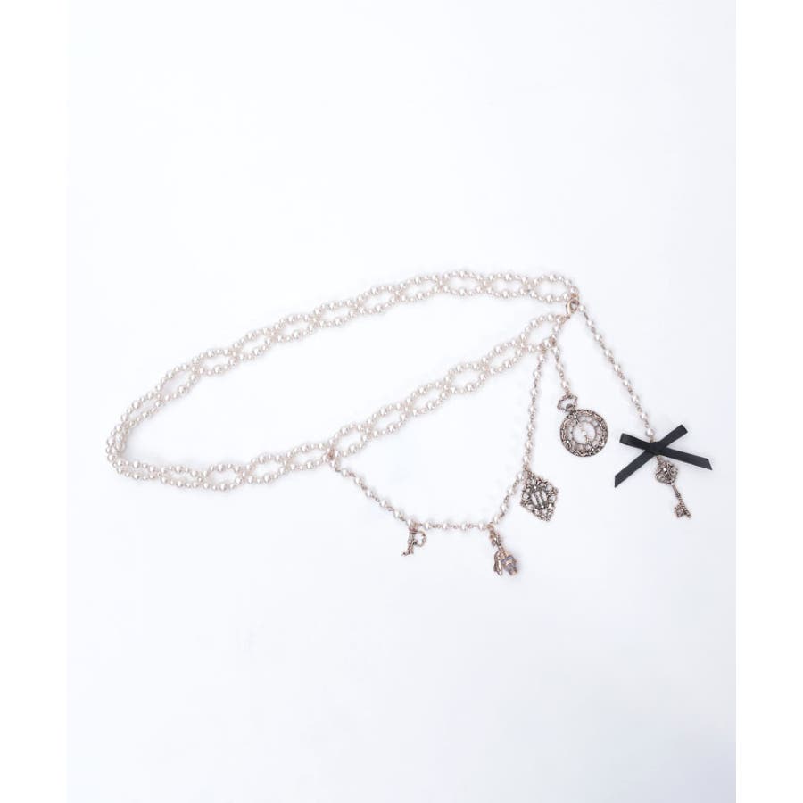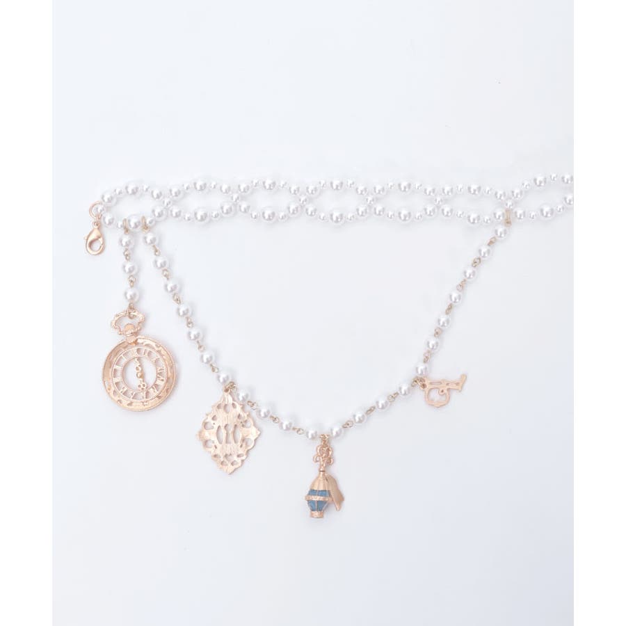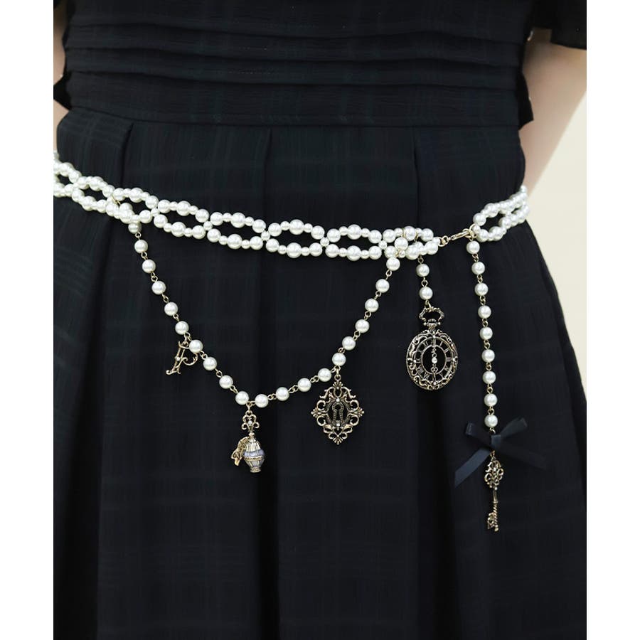白うさぎを連想させる懐中時計や体が小さくなるドリンクボトルなどの不思議なモチーフを、オリジナルの金型に落とし込みチャームにあしらったパールチェーンのベルトです。