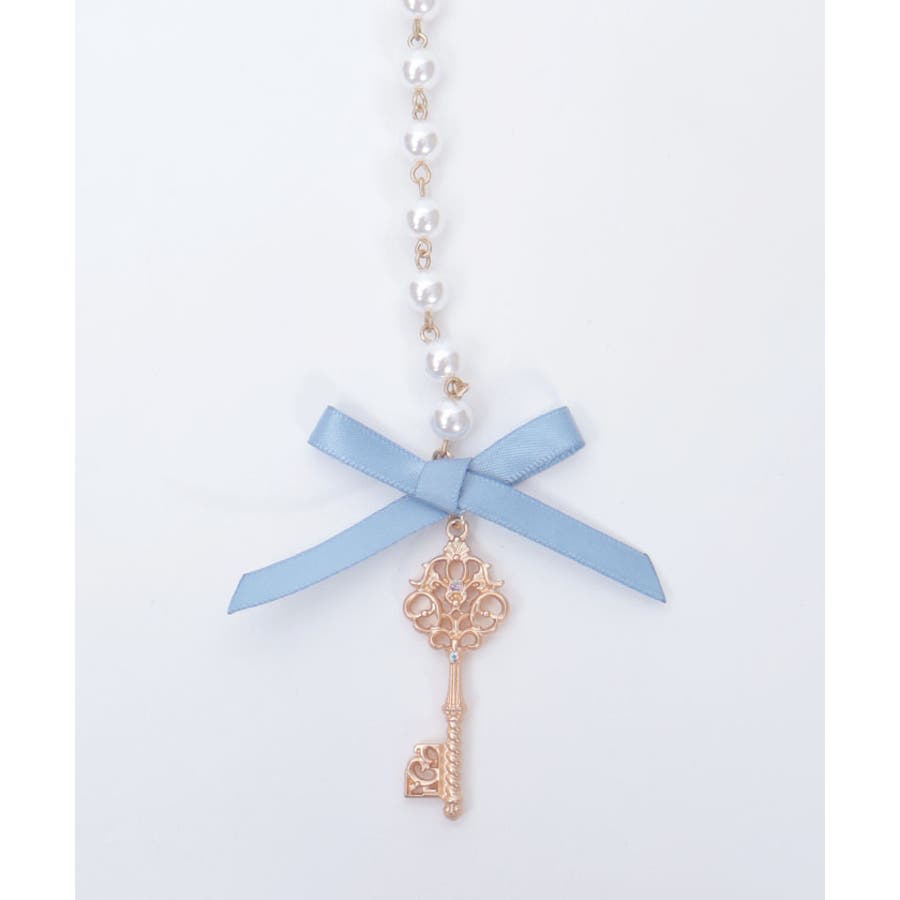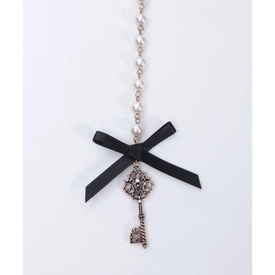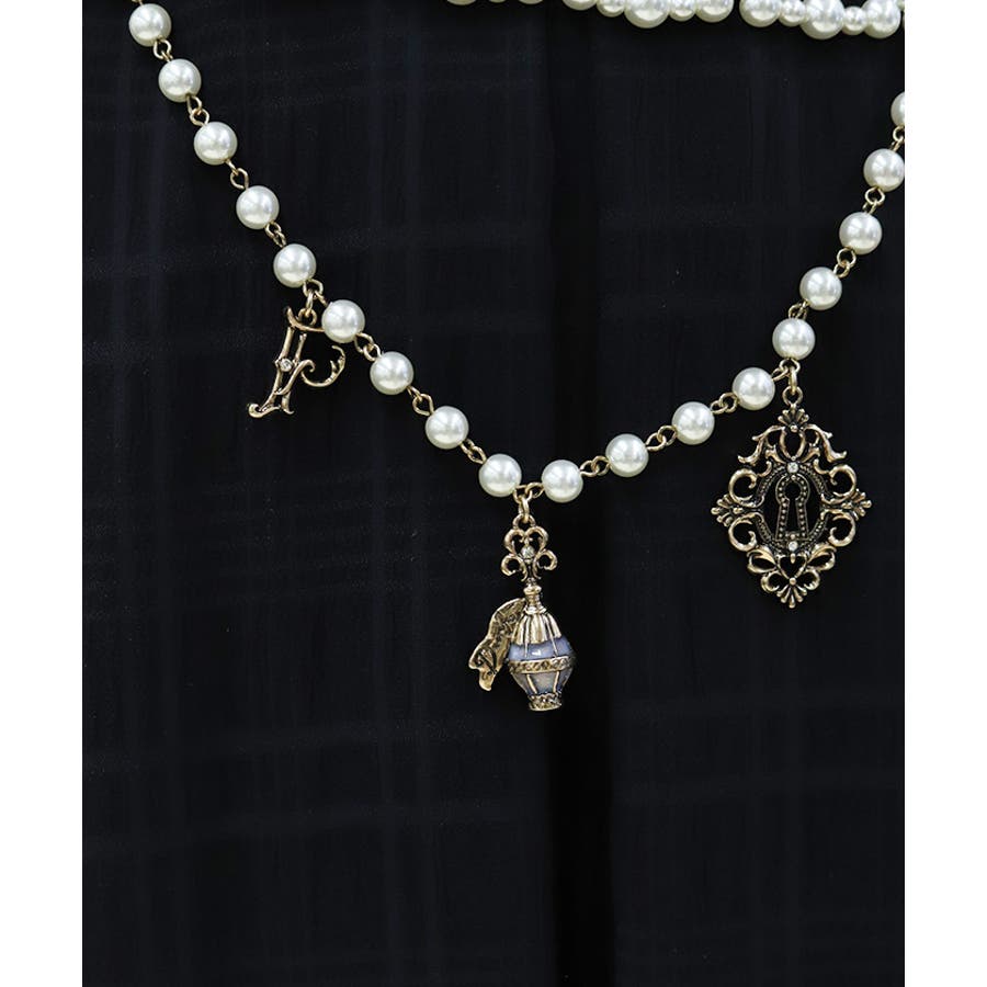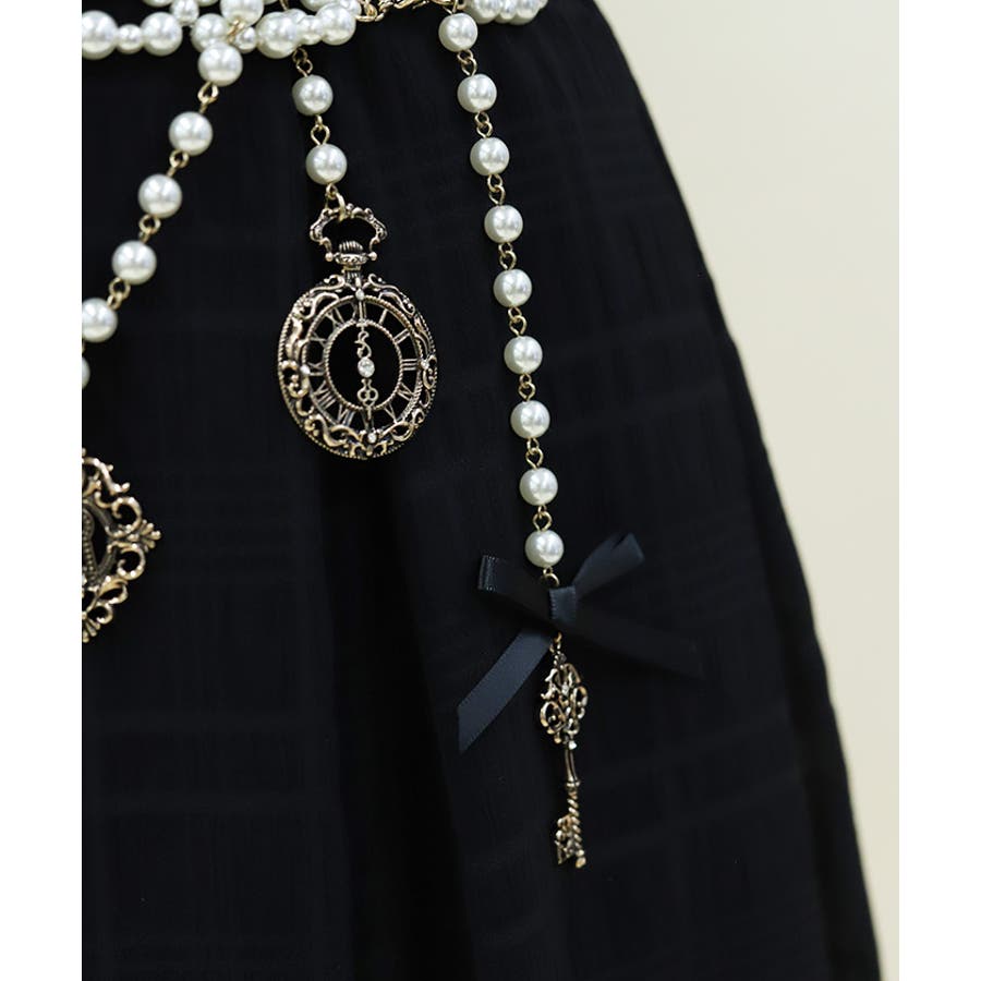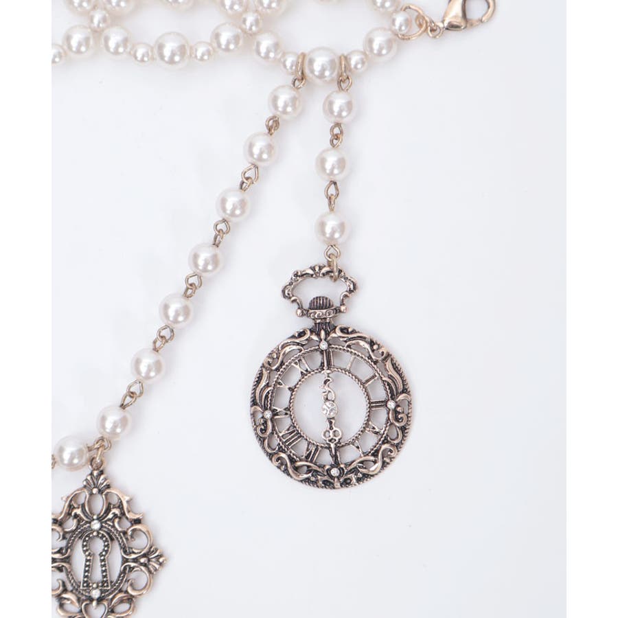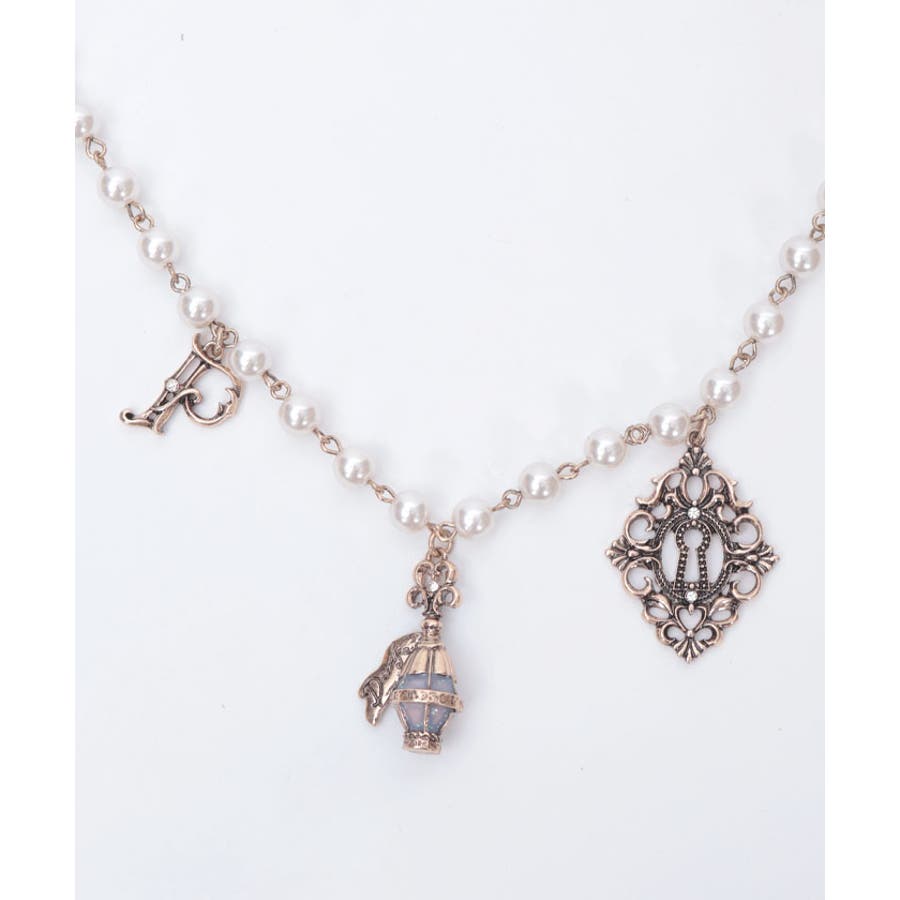 白うさぎを連想させる懐中時計や体が小さくなるドリンクボトルなどの不思議なモチーフを、オリジナルの金型に落とし込みチャームにあしらったパールチェーンのベルトです。