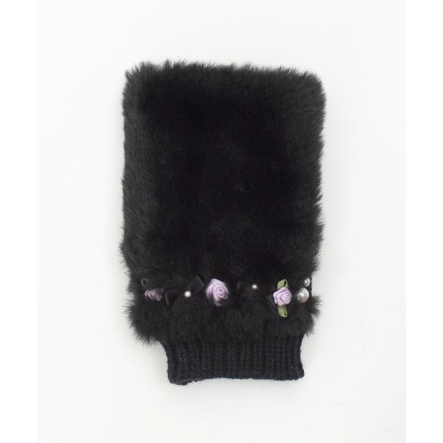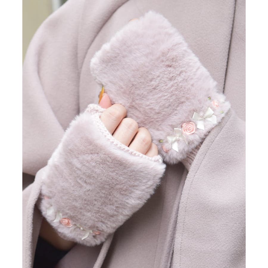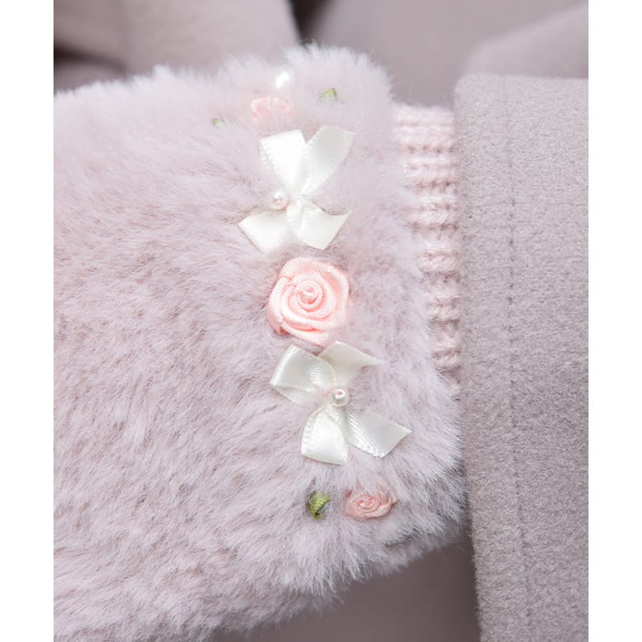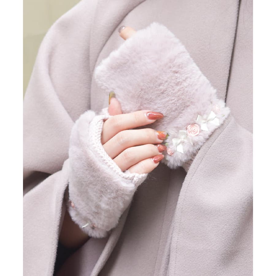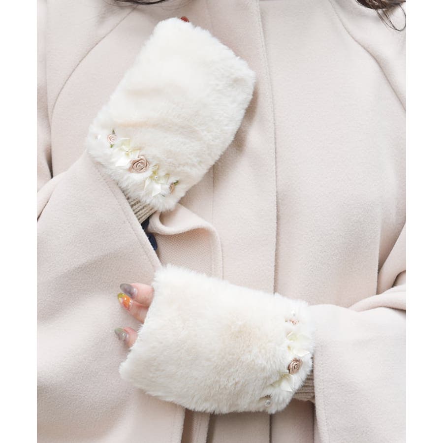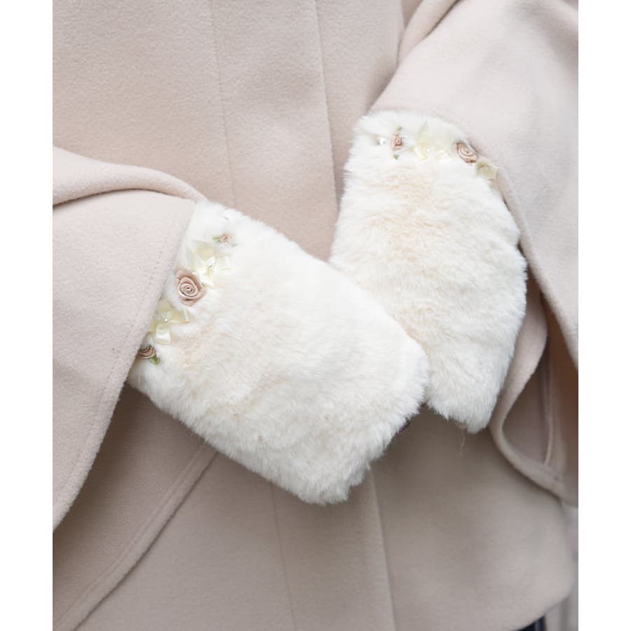 配色の巻きバラ×リボンがお手元を飾るファー手袋です。