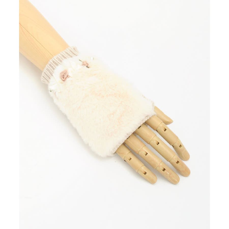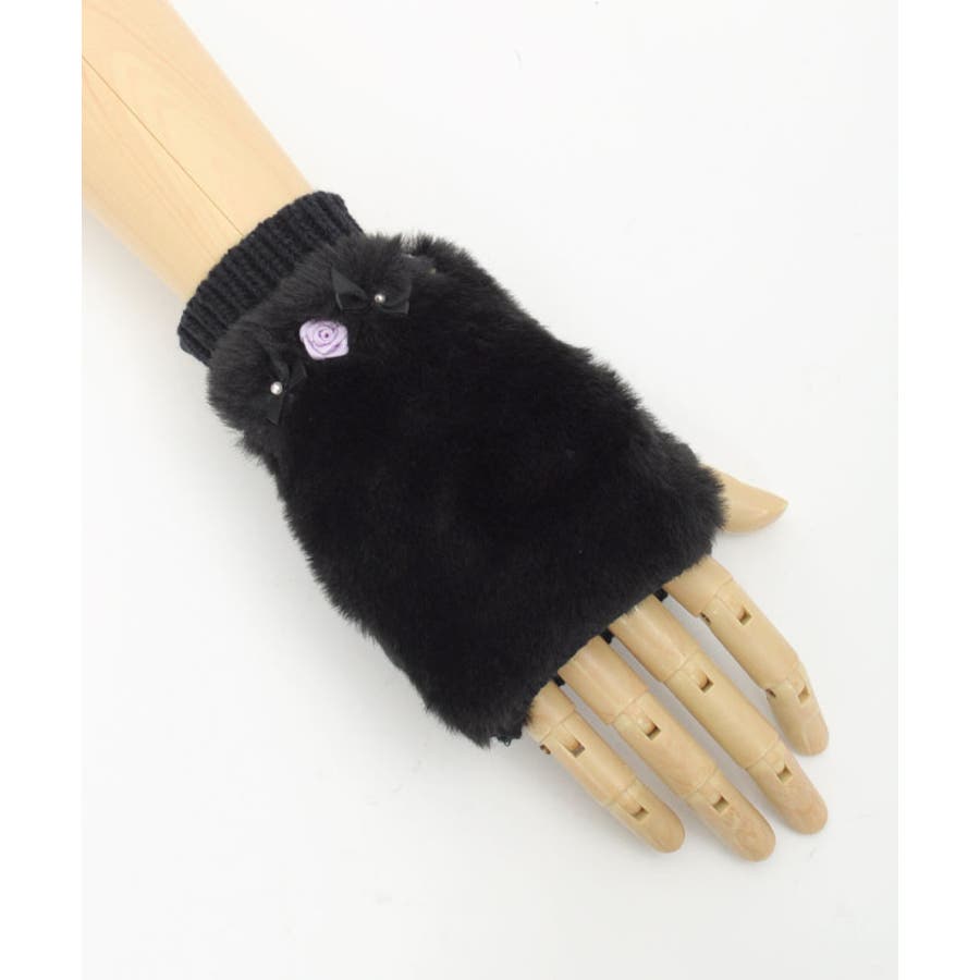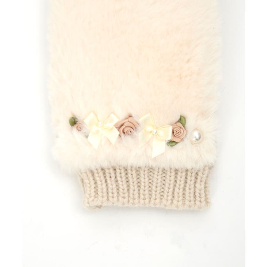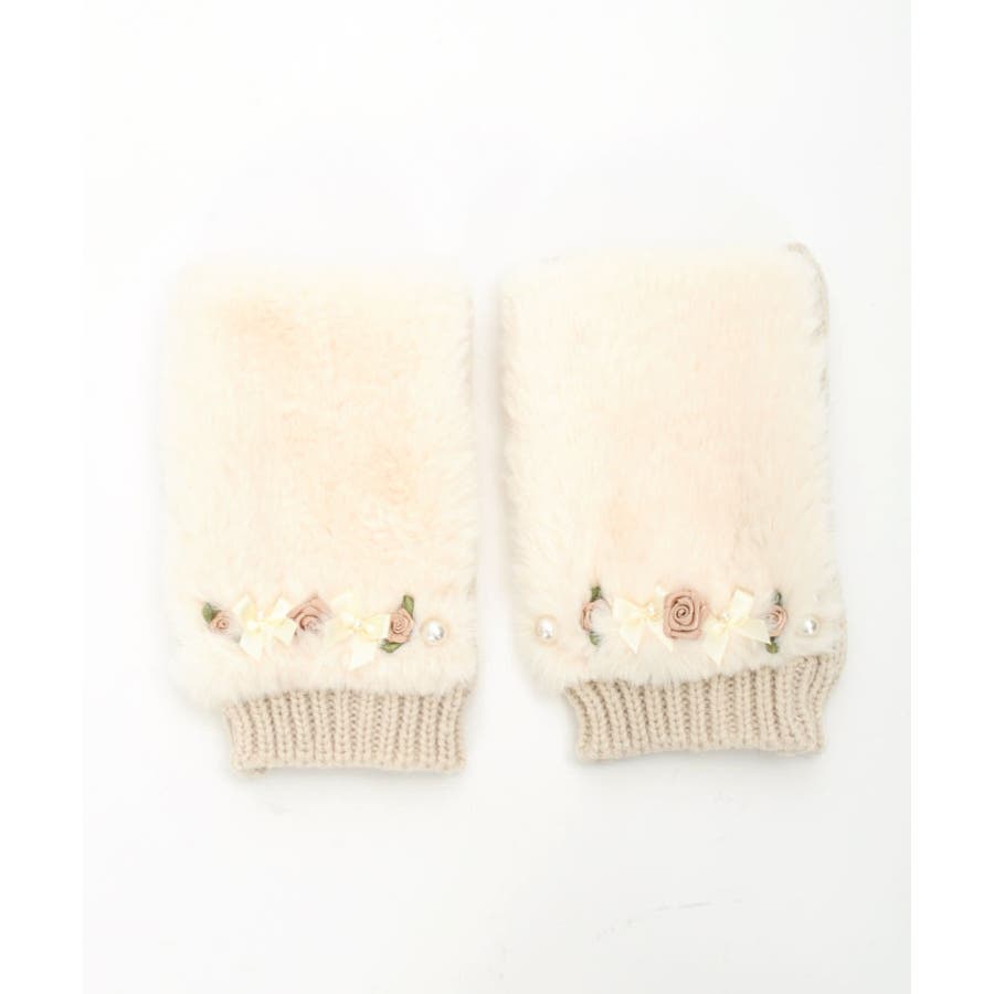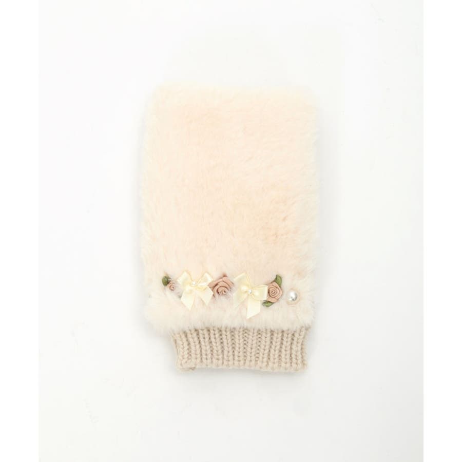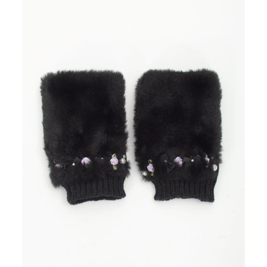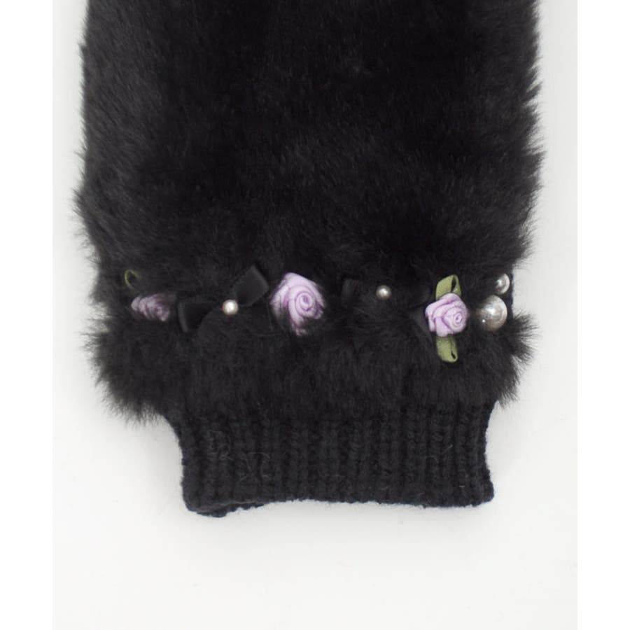 配色の巻きバラ×リボンがお手元を飾るファー手袋です。