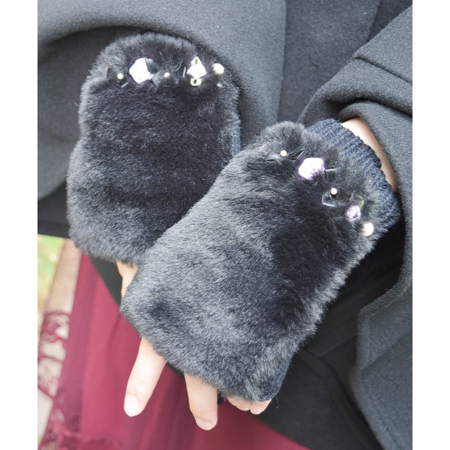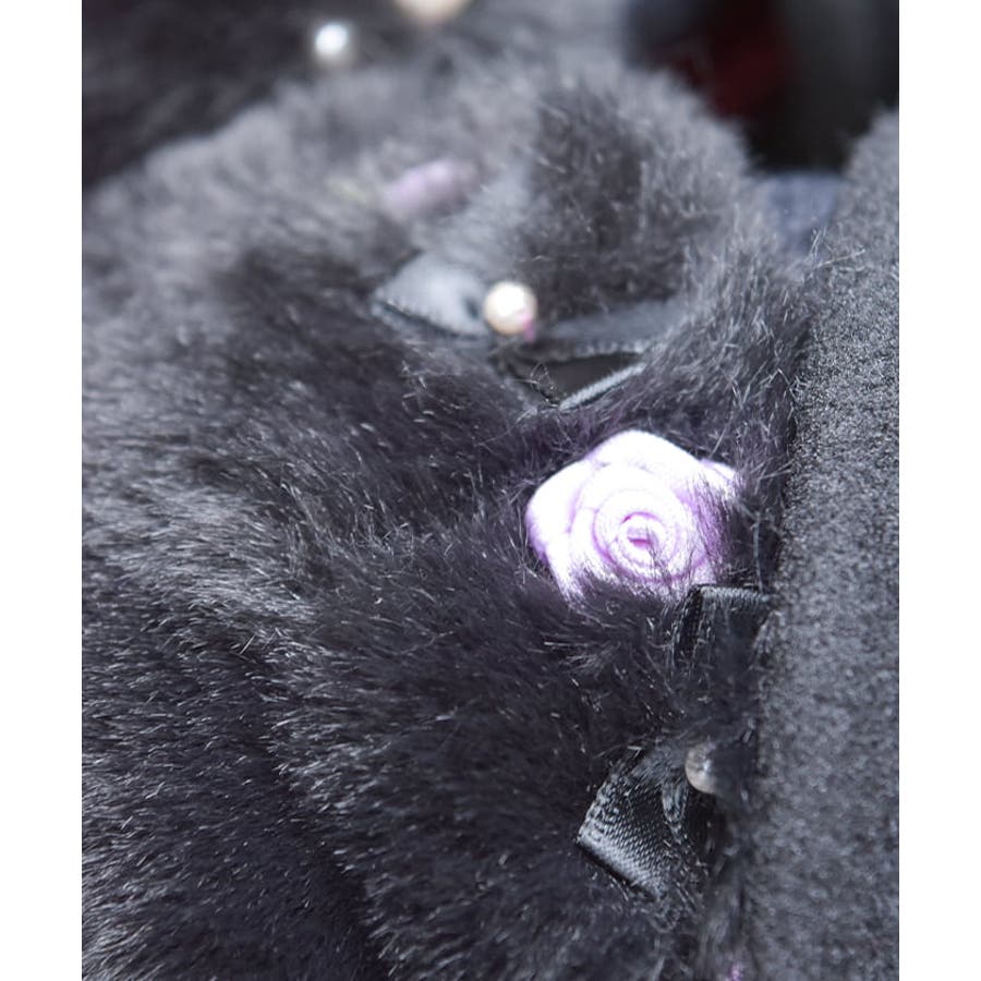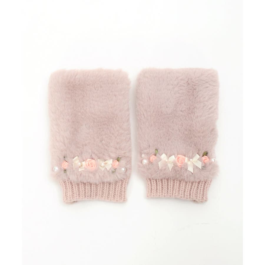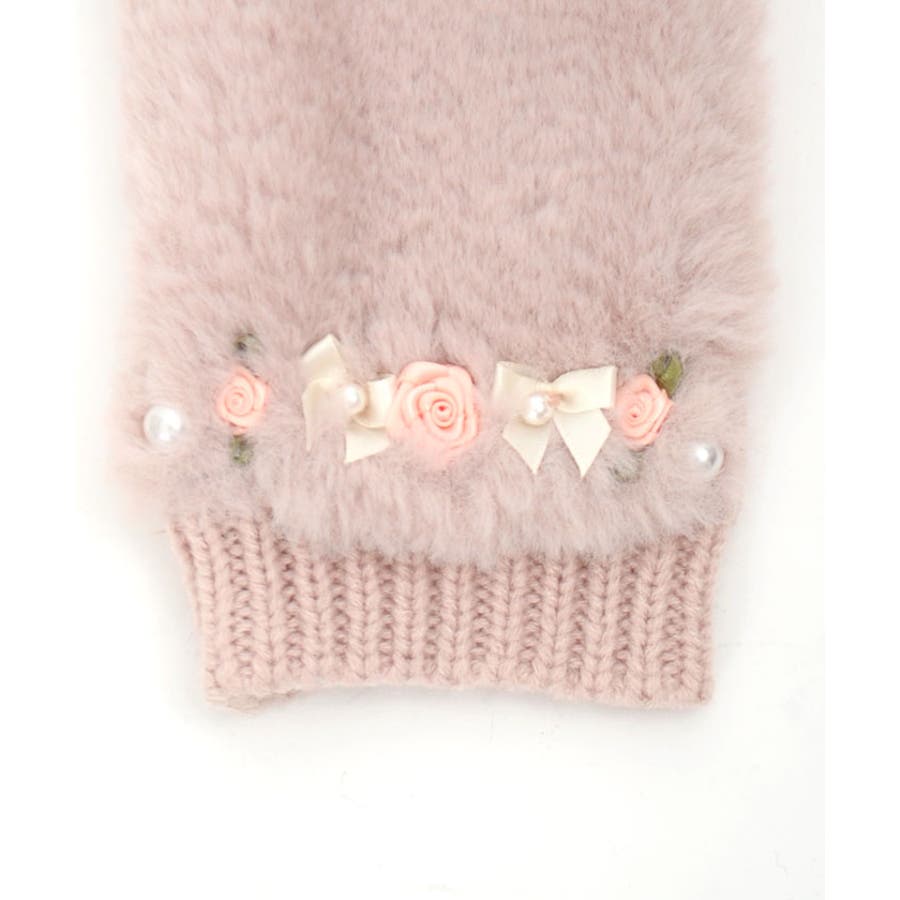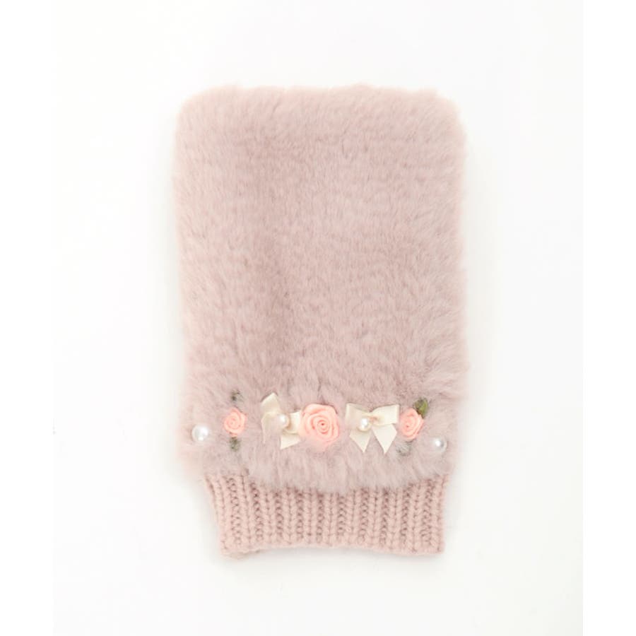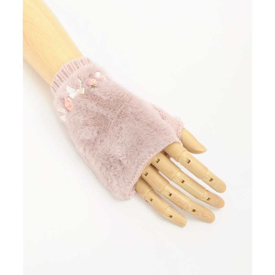 配色の巻きバラ×リボンがお手元を飾るファー手袋です。