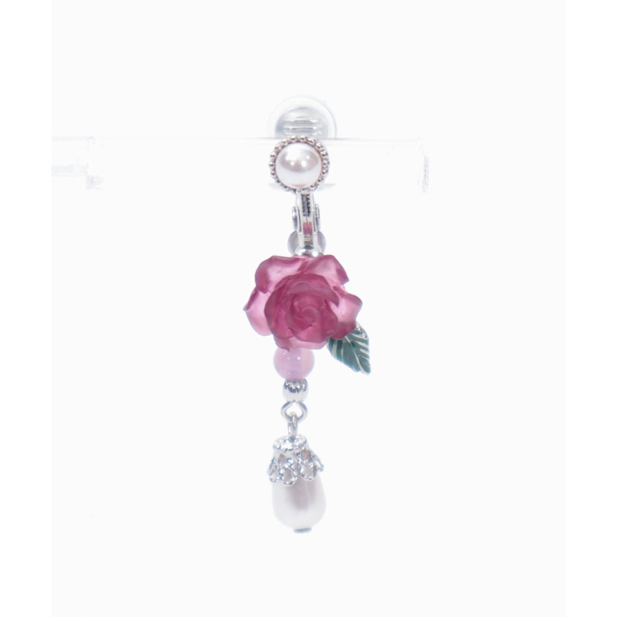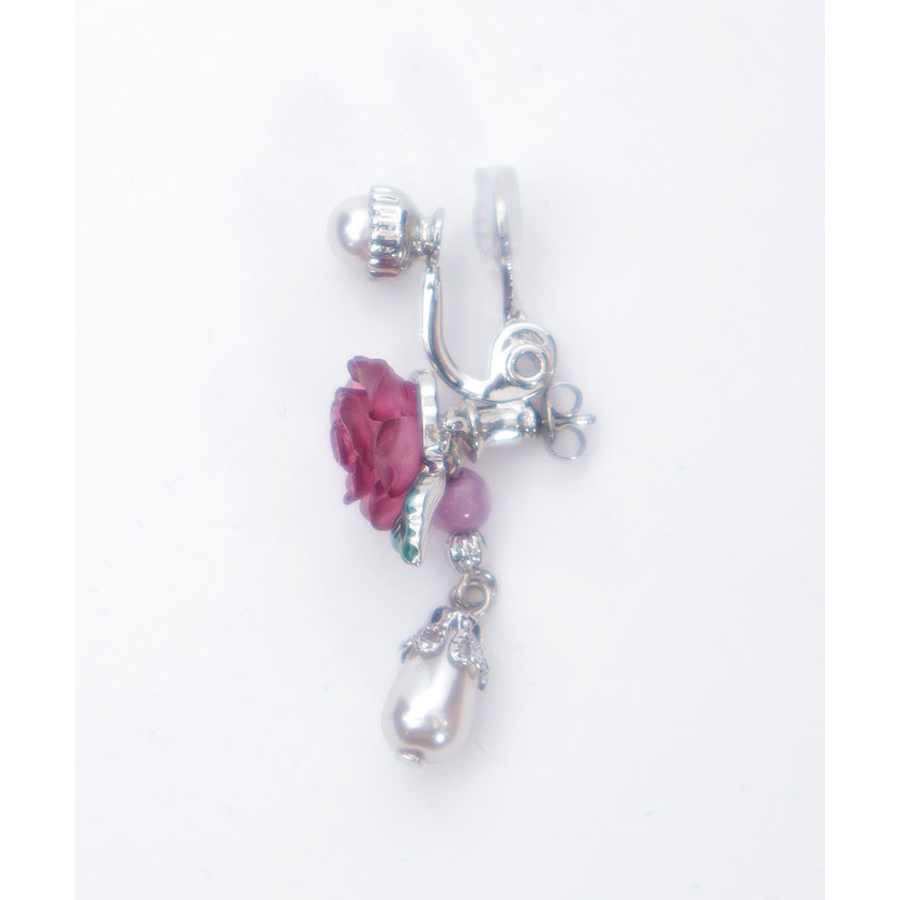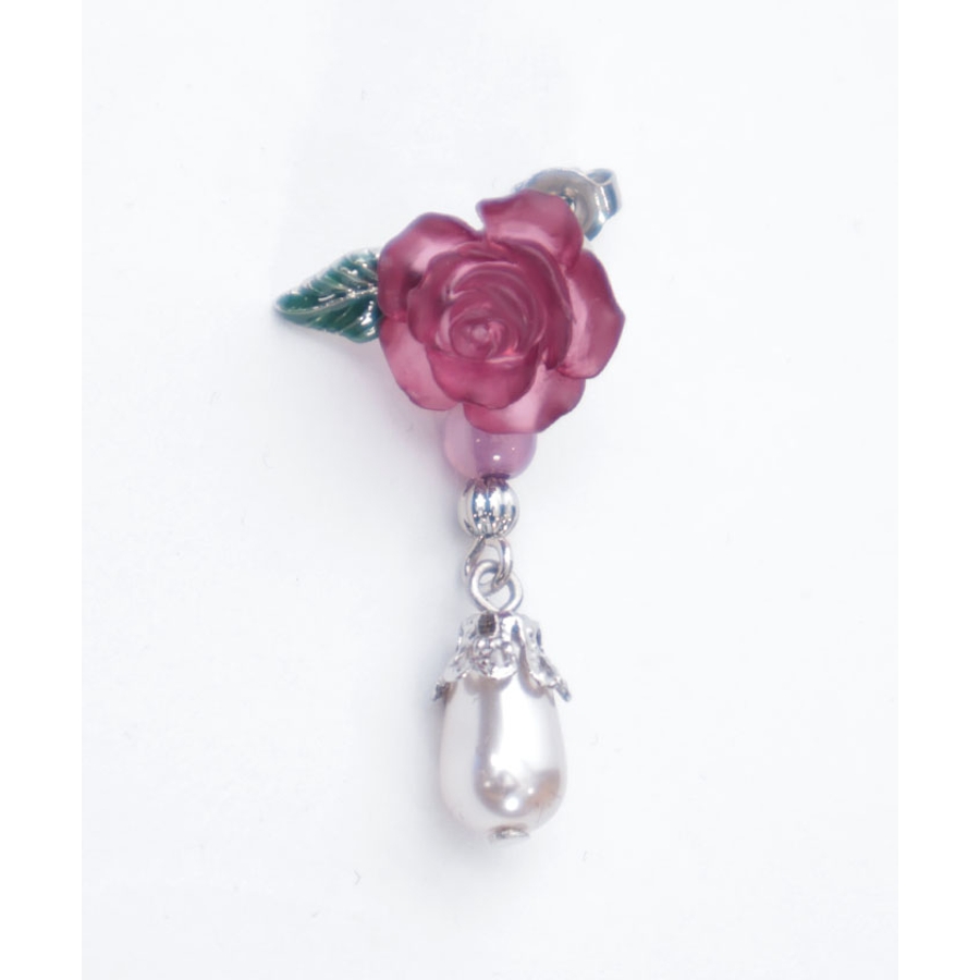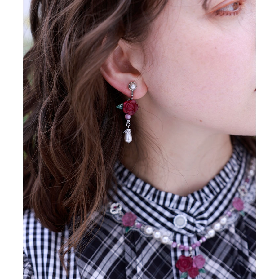 小ぶりながらも色鮮やかさが目を惹くローズモチーフに、上品なパールが揺れる華奢なデザイン。
