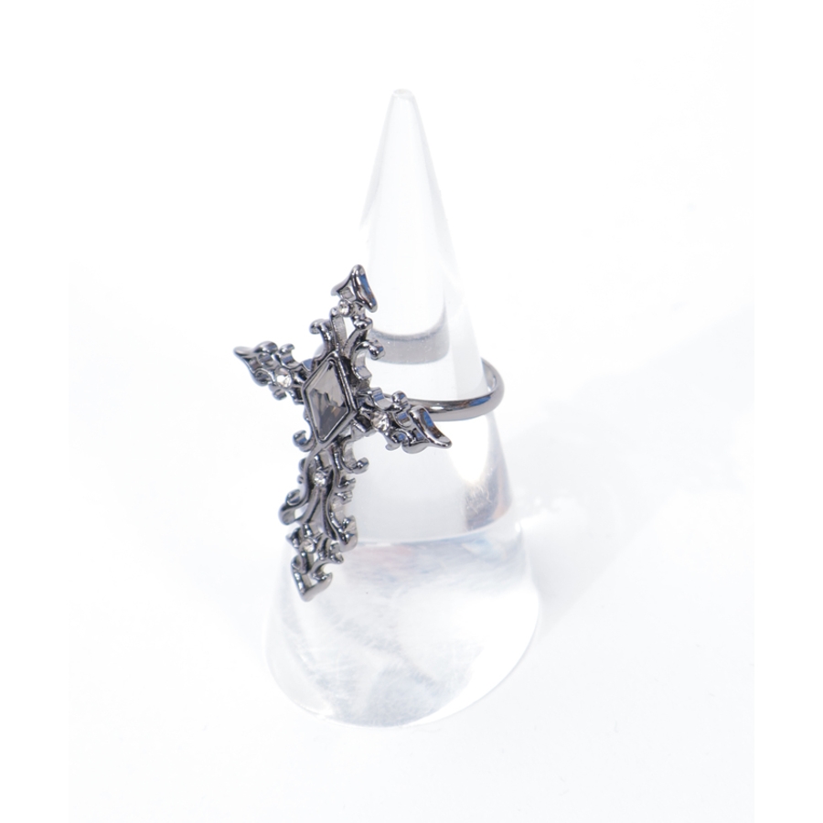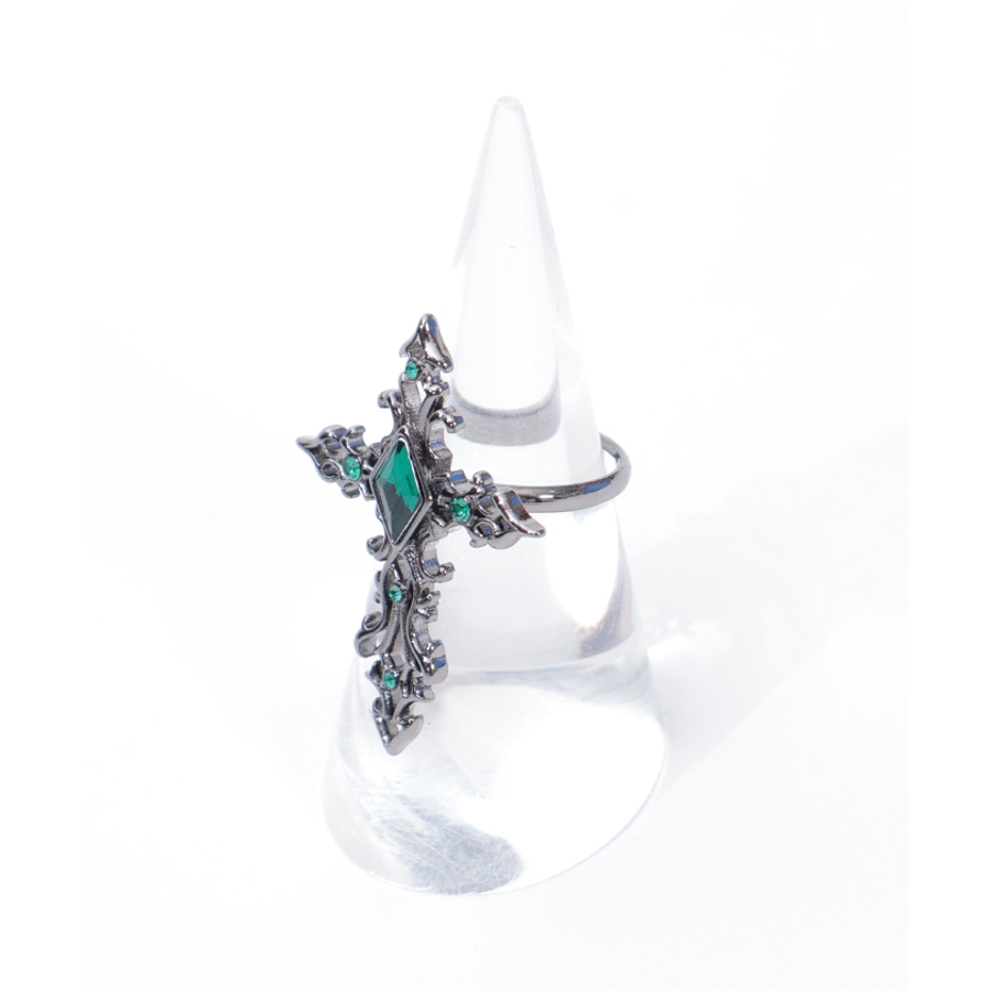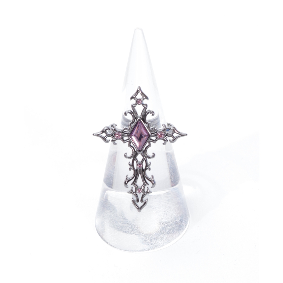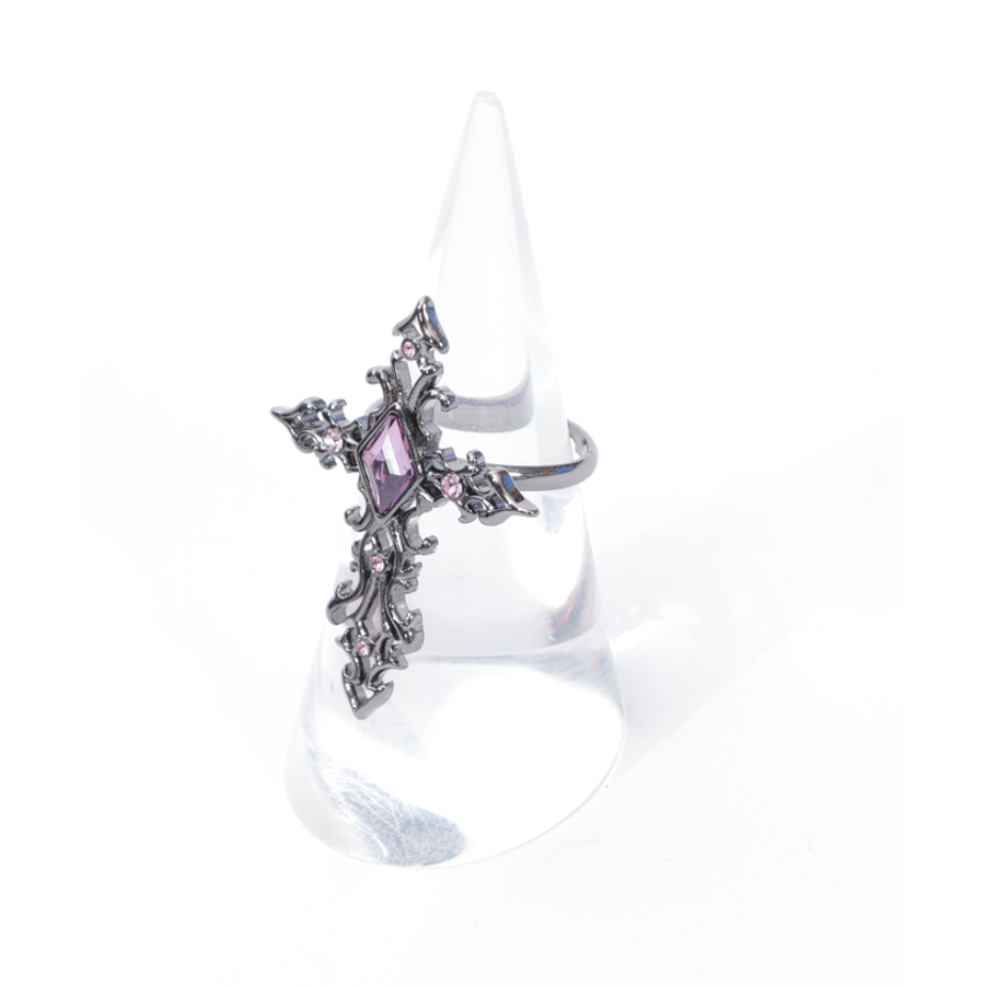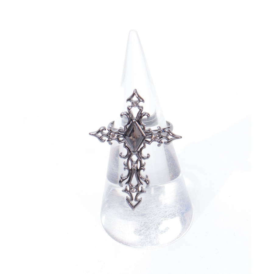 ダークなクロスモチーフにあしらったダイヤ型のカラーストーンが目を惹くリングです。