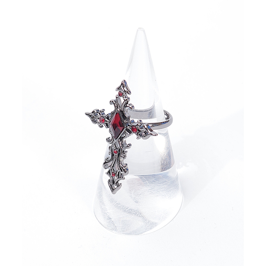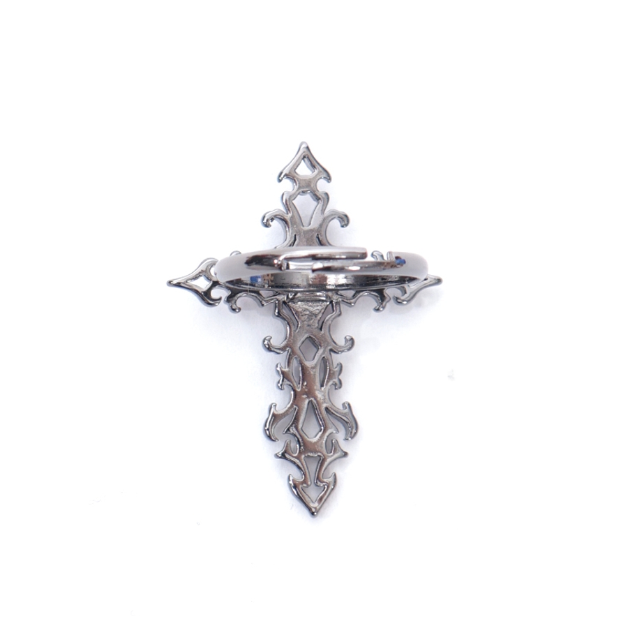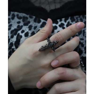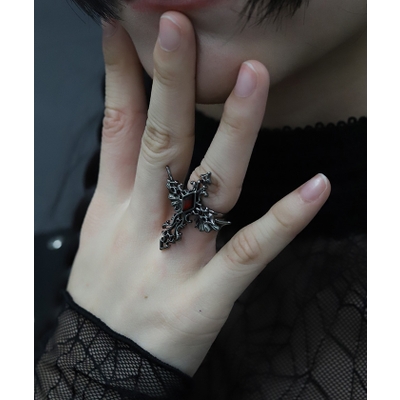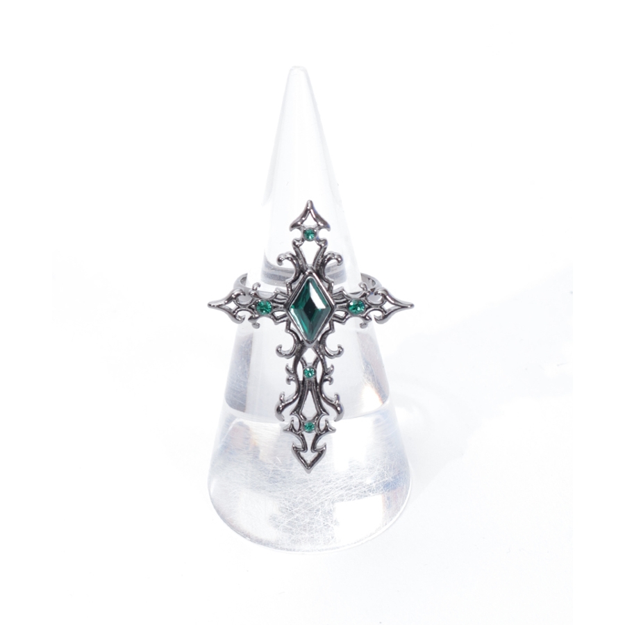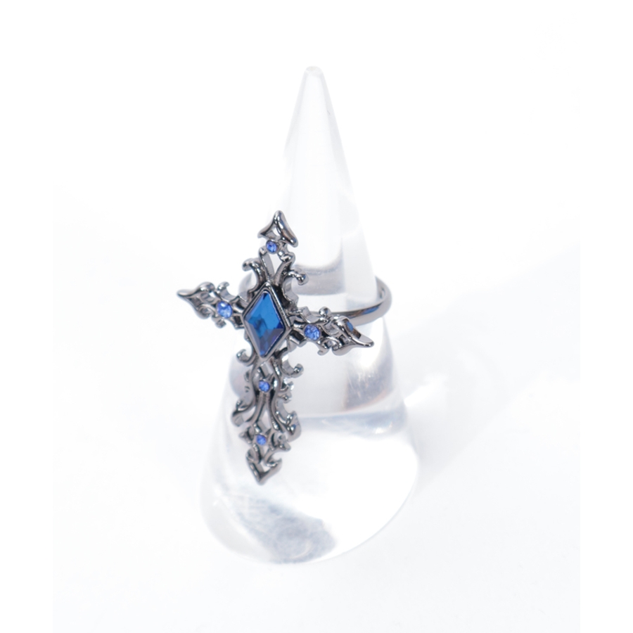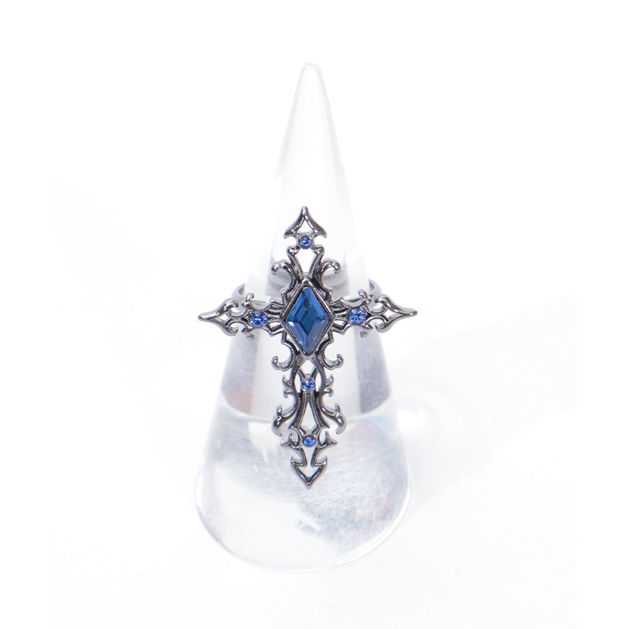 ダークなクロスモチーフにあしらったダイヤ型のカラーストーンが目を惹くリングです。