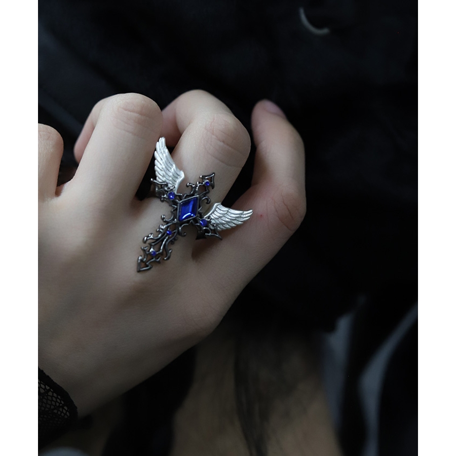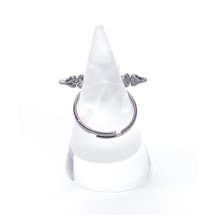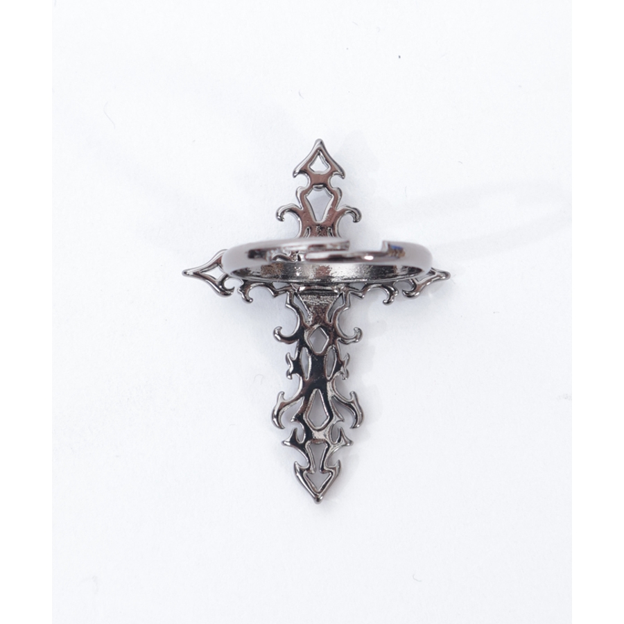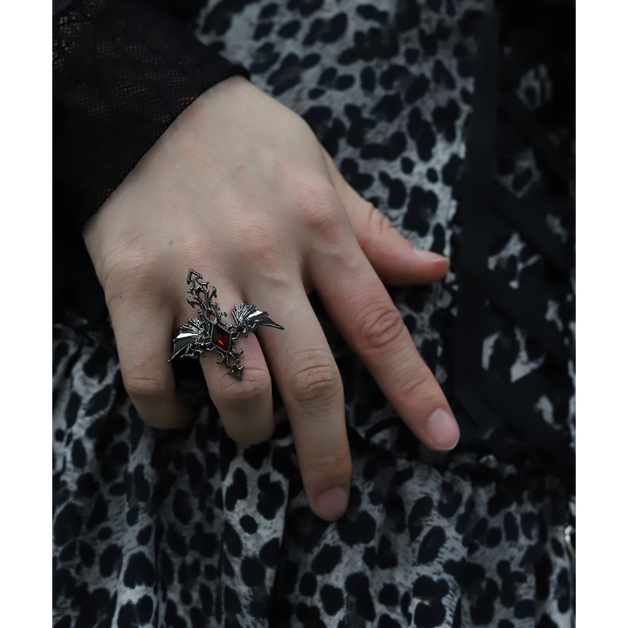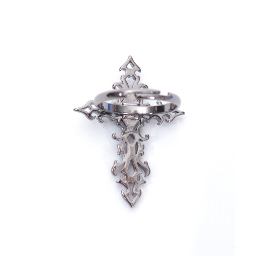 ダークなクロスモチーフにあしらったダイヤ型のカラーストーンが目を惹くリングです。