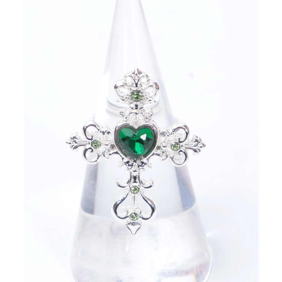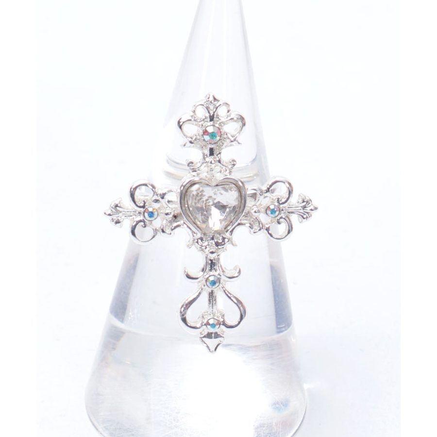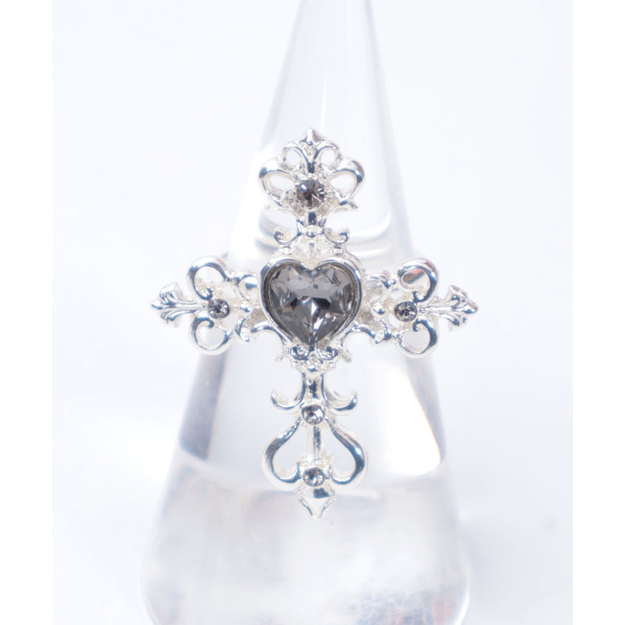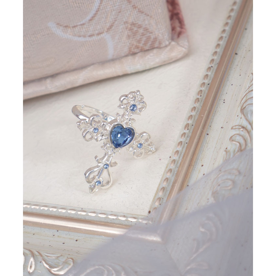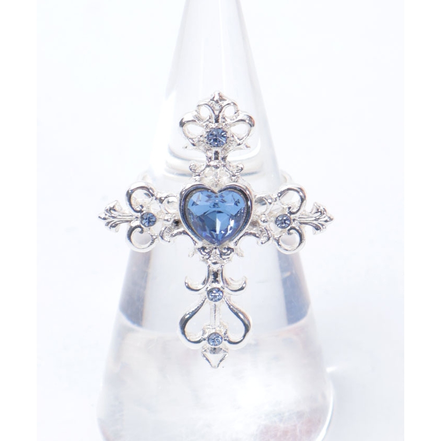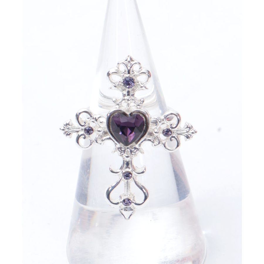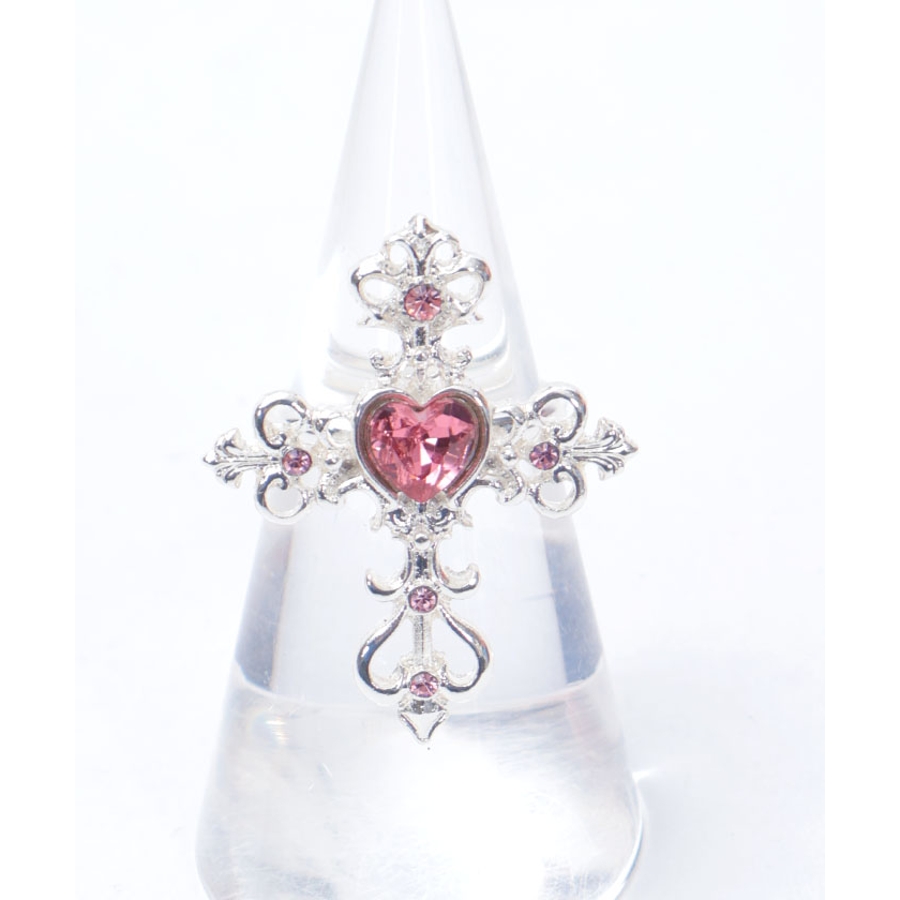 繊細なクロスモチーフにあしらったハート型のカラーストーンが目を惹くリングです。